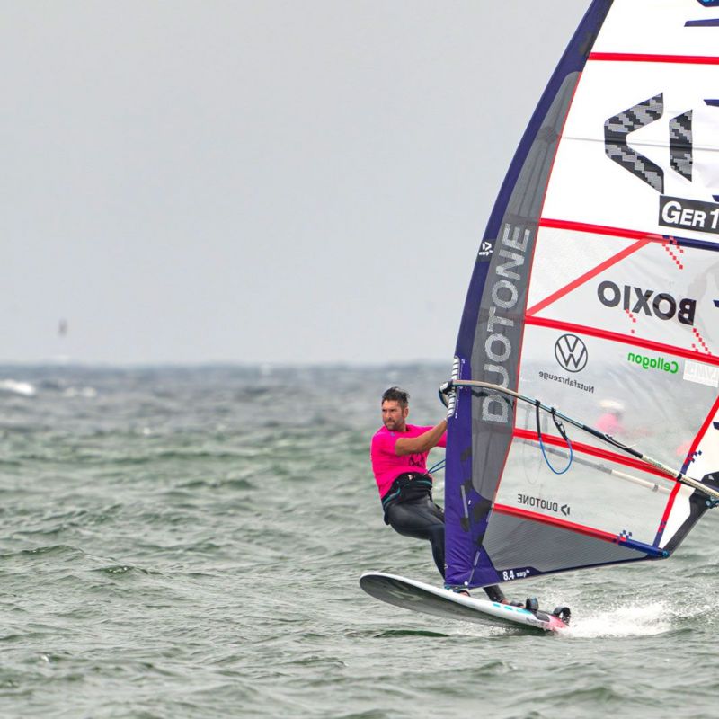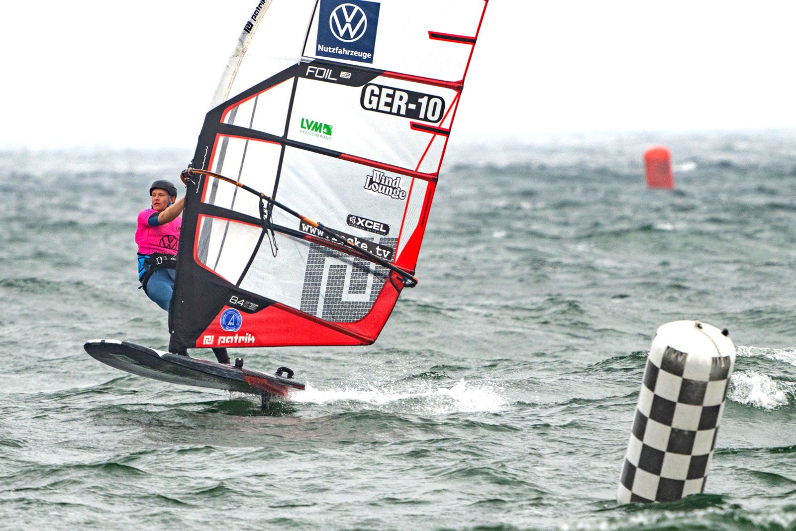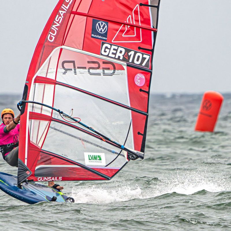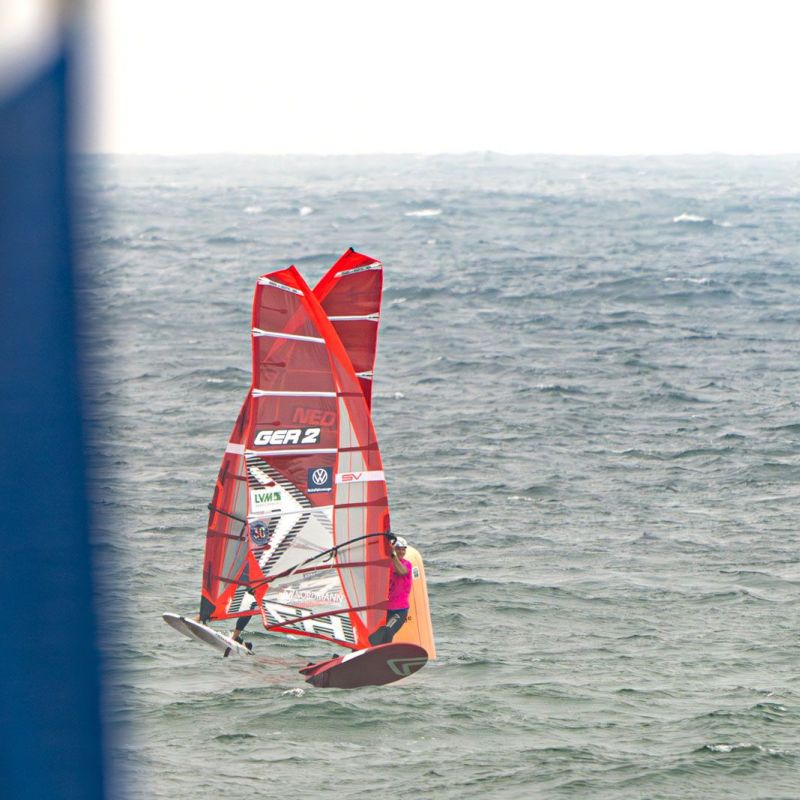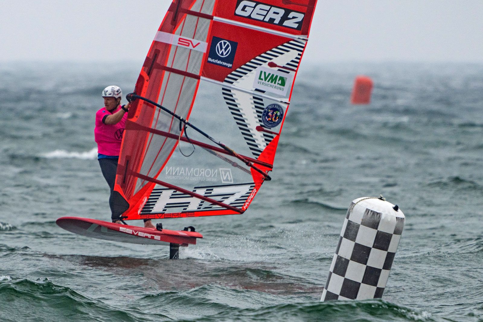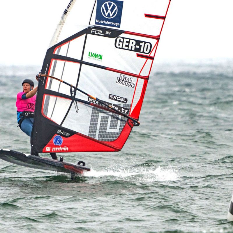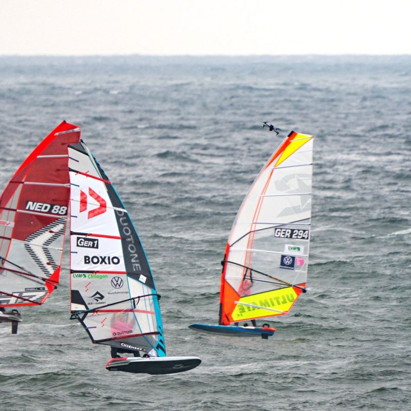 Im Anschluss drehte der Wind und nahm ab. Die Regattaleitung passte den Kurs an und entschied die Disziplin zu wechseln. Nun kamen erneut die Foiler zum Zuge. Für Vincent Langer spielte dies aber keine Rolle. Er zeigte auch auf den fliegenden Boards, dass er aktuell der Maßstab ist, an dem sich seine Konkurrenten messen müssen. Mit überlegenem Speed gewann er auch die Foiling Elimination. Auch dieses Mal war der Flensburger Gunnar Asmussen dicht an ihm dran. Mit Platz zwei wahrte er seine Chancen auf eine Podiumsplatzierung. Im Kampf um den Titel möchte aber vor allem Jonne Heimann noch ein Wörtchen mitreden, der sich mit Platz drei weiterhin leistungsstark präsentierte. Alexander Neubert spulte weiter seine konstant starke Leistung ab und sicherte sich Platz vier vor Leo Richter.