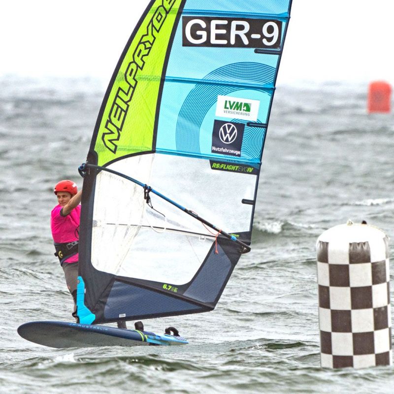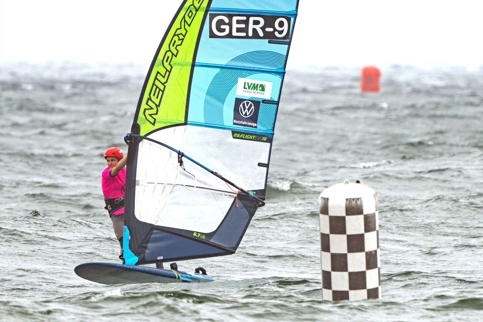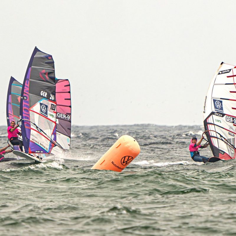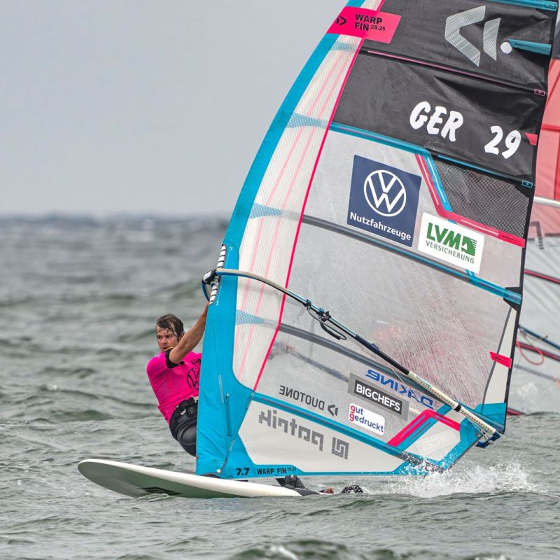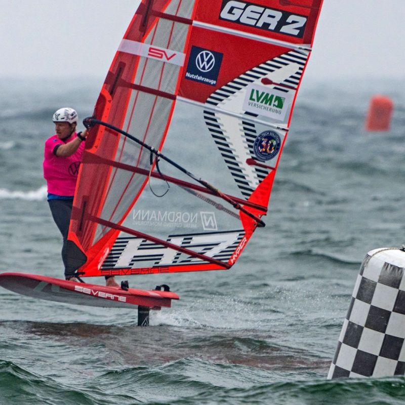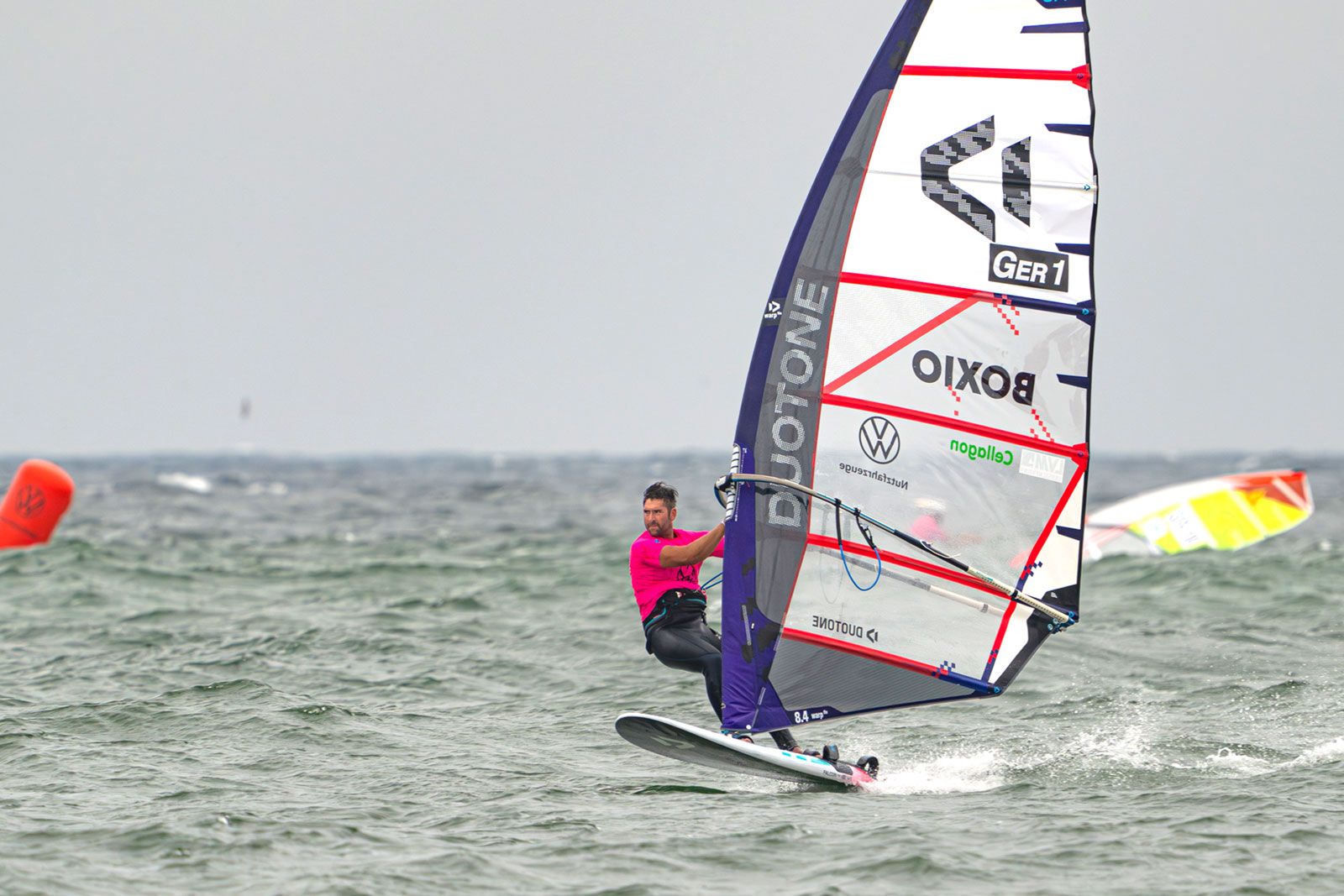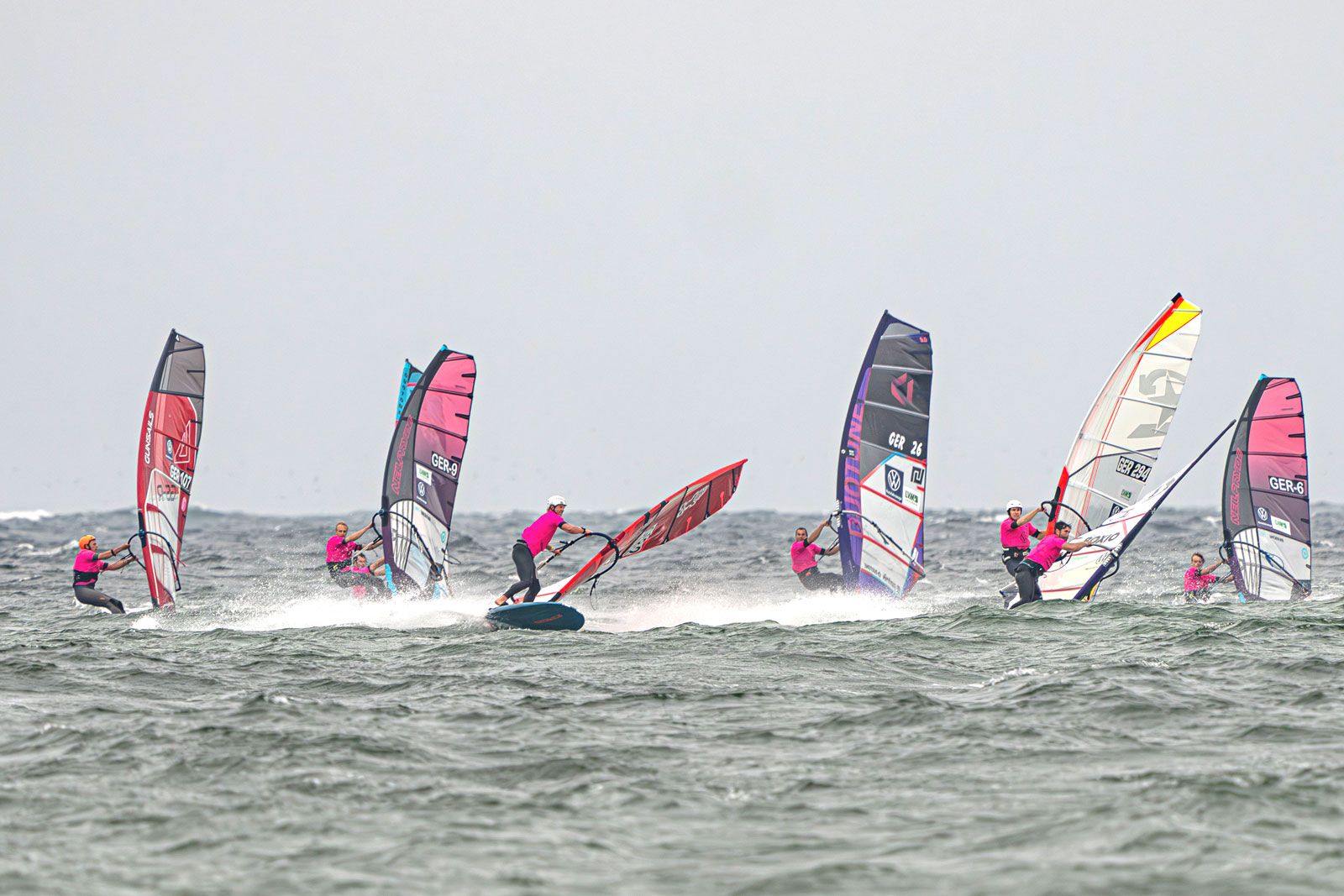 Im Anschluss drehte der Wind und nahm ab. Die Regattaleitung passte den Kurs an und entschied die Disziplin zu wechseln. Nun kamen erneut die Foiler zum Zuge. Für Vincent Langer spielte dies aber keine Rolle. Er zeigte auch auf den fliegenden Boards, dass er aktuell der Maßstab ist, an dem sich seine Konkurrenten messen müssen. Mit überlegenem Speed gewann er auch die Foiling Elimination. Auch dieses Mal war der Flensburger Gunnar Asmussen dicht an ihm dran. Mit Platz zwei wahrte er seine Chancen auf eine Podiumsplatzierung. Im Kampf um den Titel möchte aber vor allem Jonne Heimann noch ein Wörtchen mitreden, der sich mit Platz drei weiterhin leistungsstark präsentierte. Alexander Neubert spulte weiter seine konstant starke Leistung ab und sicherte sich Platz vier vor Leo Richter.