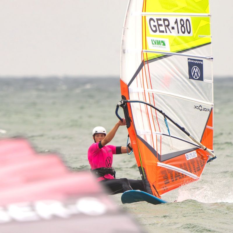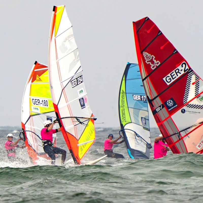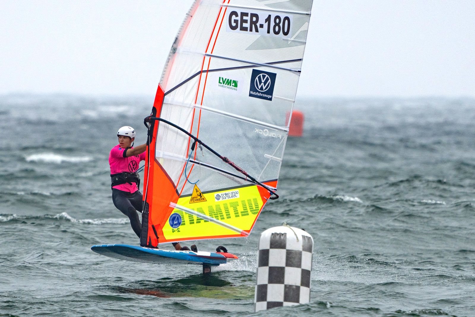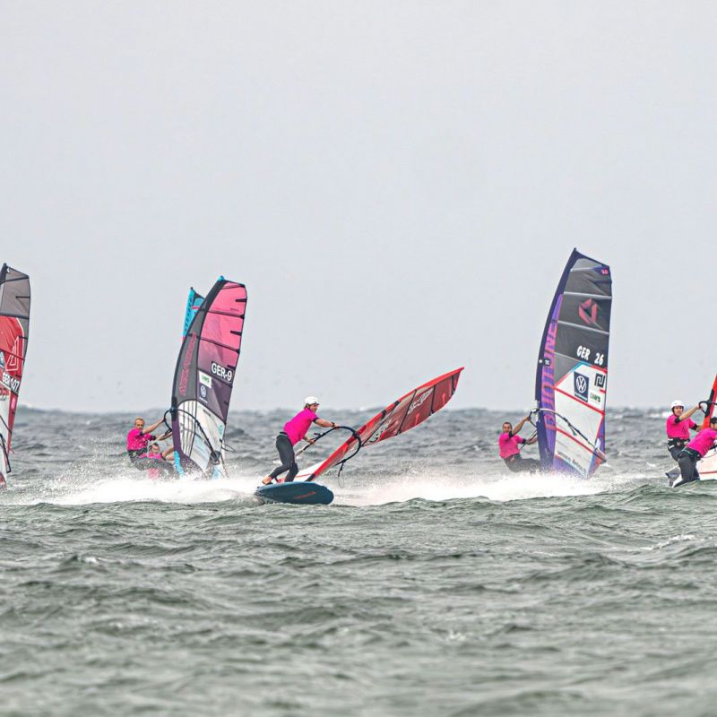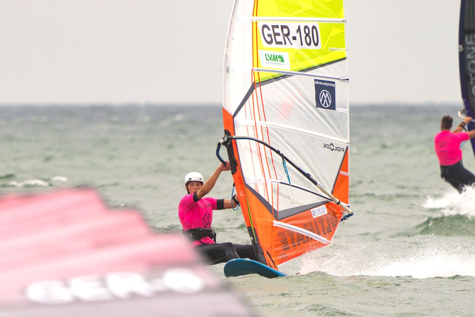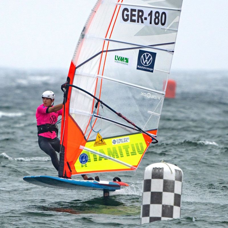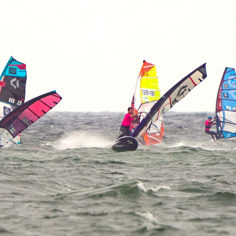 Im Anschluss drehte der Wind und nahm ab. Die Regattaleitung passte den Kurs an und entschied die Disziplin zu wechseln. Nun kamen erneut die Foiler zum Zuge. Für Vincent Langer spielte dies aber keine Rolle. Er zeigte auch auf den fliegenden Boards, dass er aktuell der Maßstab ist, an dem sich seine Konkurrenten messen müssen. Mit überlegenem Speed gewann er auch die Foiling Elimination. Auch dieses Mal war der Flensburger Gunnar Asmussen dicht an ihm dran. Mit Platz zwei wahrte er seine Chancen auf eine Podiumsplatzierung. Im Kampf um den Titel möchte aber vor allem Jonne Heimann noch ein Wörtchen mitreden, der sich mit Platz drei weiterhin leistungsstark präsentierte. Alexander Neubert spulte weiter seine konstant starke Leistung ab und sicherte sich Platz vier vor Leo Richter.