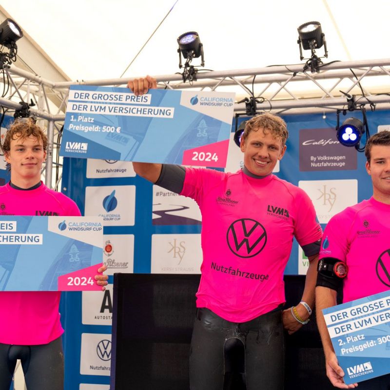 Dabei sah es für den amtierenden GWA Fin Slalom Champion zunächst gar nicht gut aus. Im Finale der ersten Elimination hatte er einen Frühstart und eröffnete den Kampf ums Podium so zunächst mit einem unglücklichen zehnten Platz. Das Pech war sogar noch größer, da im Rahmen der ersten Wettfahrt jedes California Windsurf Cups der „Große Preis der LVM Versicherung“ mit einem Preisgeld von insgesamt 1.000 € verliehen wird. Durch seinen Frühstart verlor Langer die Chance auf die 500 €, die der Erstplatzierte dieser Wettfahrt erhält. Jonne Heimann ließ sich diese Chance nicht entgehen und sicherte sich mit dem Sieg im Auftaktrennen die Prämie und somit 500 €. Auf dem zweiten Platz folgte der Niederländer Koen Hessels, der sich damit über 300 € freuen durfte. Platz drei belegte Youngster Anton Richter, der damit die 200 € Prämie einheimste. Meno Büchler und Gunnar Asmussen komplettierten die Top-5 in der ersten Entscheidung.