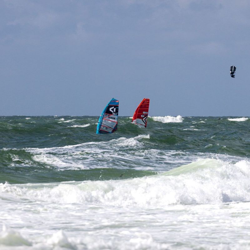 Platz drei und damit 200 € Preisgeld gingen an Fabian Wolf. In der brodelnden Nordsee vor Sylt bewies er, dass er nicht nur auf dem Foil, sondern auch auf der Finne bestens zu Hause ist. Der Kieler Kai Paustian und der Hannoveraner Tim Wunderlich komplettierten die Top-5 bei diesem Rennen.