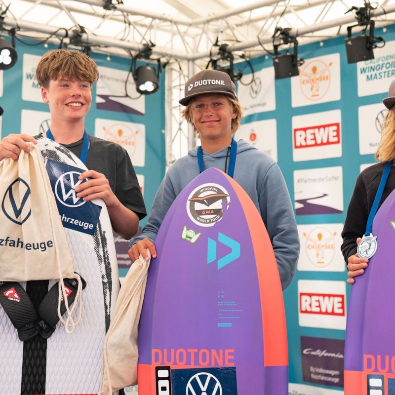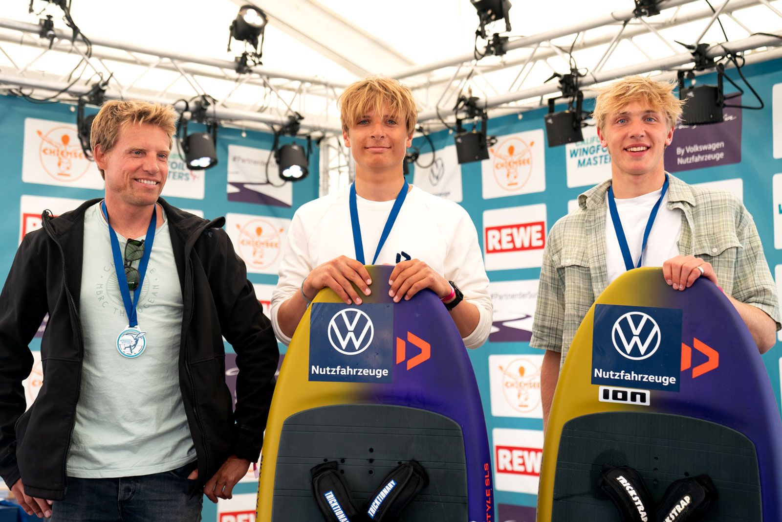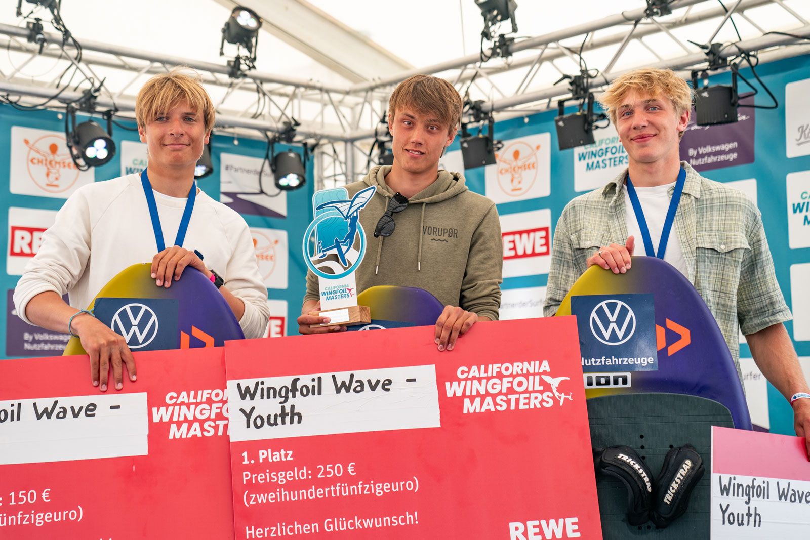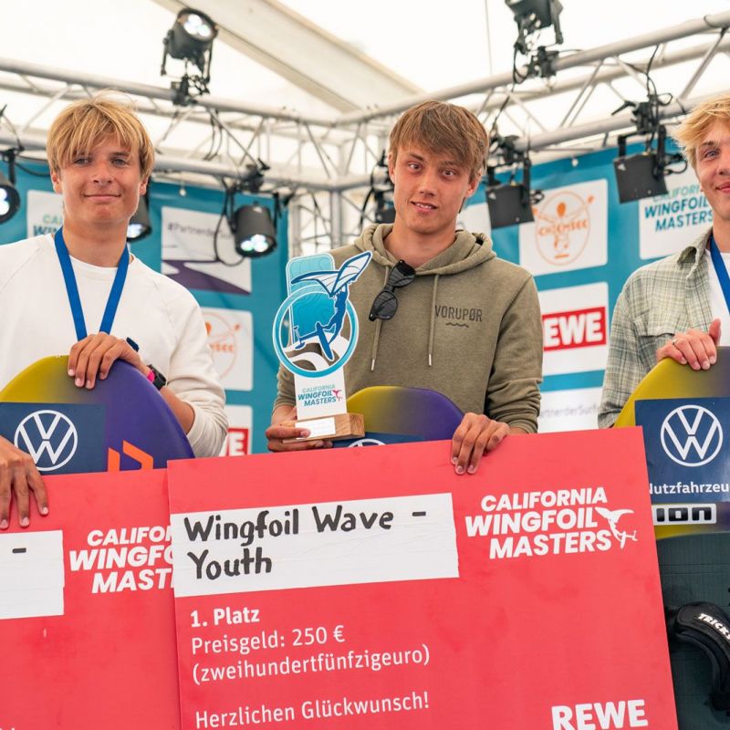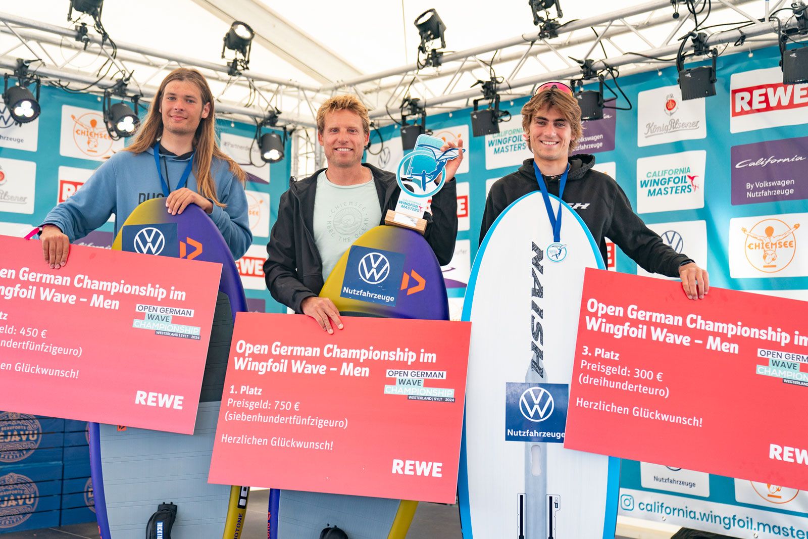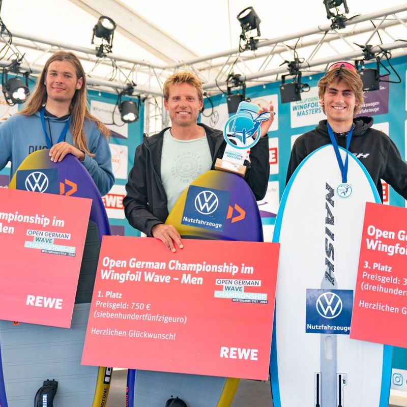 Bei den Herren fiel die Entscheidung am finalen Sonntag. Hier setzte sich Klaas Voget im Finale durch und ist so erster German Champion im Wingfoil Wave. Damit sicherte er sich auch einen guten Teil der 3.000 € Preisgeld, die allein für diese Disziplin vom Sponsor REWE zu Verfügung gestellt wurden. Auf dem Weg ins Finale musste er sich gegen den Südafrikaner Dylan Wichmann und Simon Spinas durchsetzen, bevor er seinem Duotone-Teamkollegen Julius Manthei gegenüberstand. Im entscheidenden Duell um den Titel behielt Klaas Voget die Oberhand und verdrängte Julius Manthei auf Platz zwei. Im Kampf um Platz drei siegte Kjeld Hansen gegen Simon Spinas und sicherte sich so den dritten Platz auf dem Podium bei den Herren.
