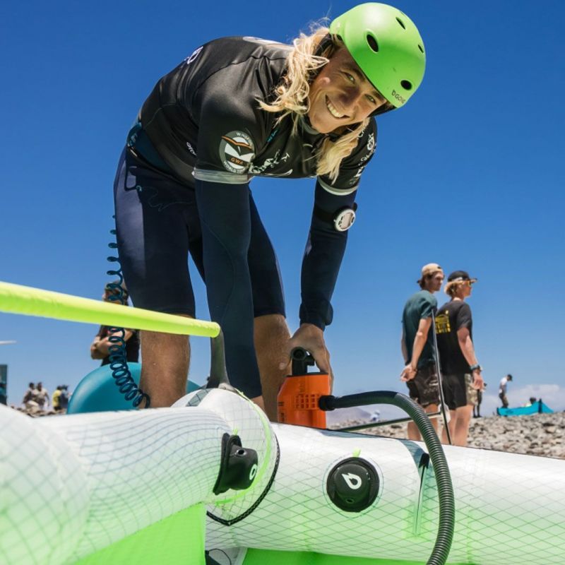 Es dürfte auch keine Überraschung sein, dass die mehrfache Weltmeisterin Nia Suardíaz den Big-Air-Titel ebenfalls anpeilt. Sie nahm ihr bereitgestelltes Smartphone mit aufs Wasser und zeichnete mit der App 6,5 Meter auf, den höchsten Air des Tages im Damenwettbewerb.