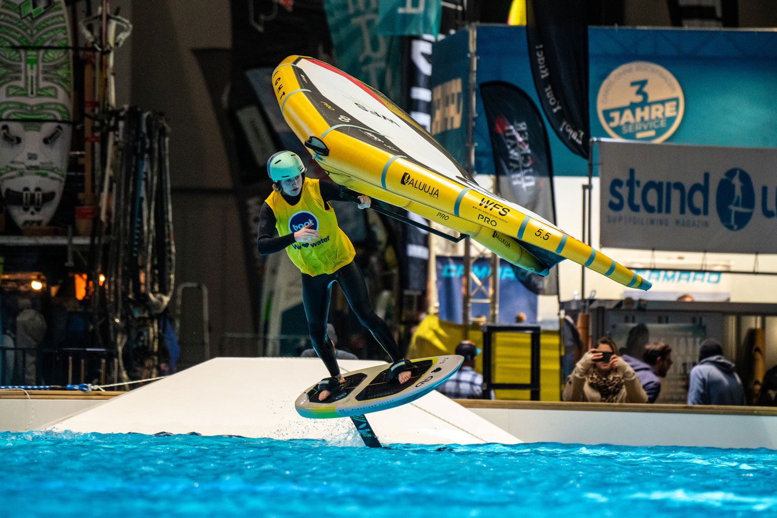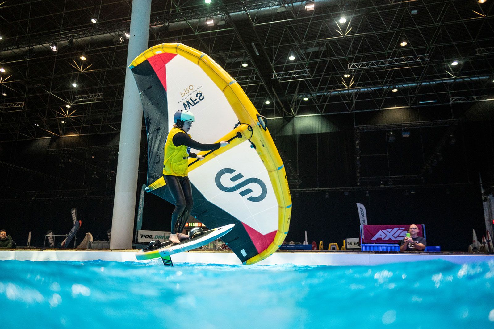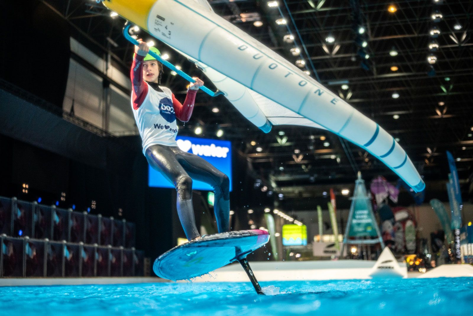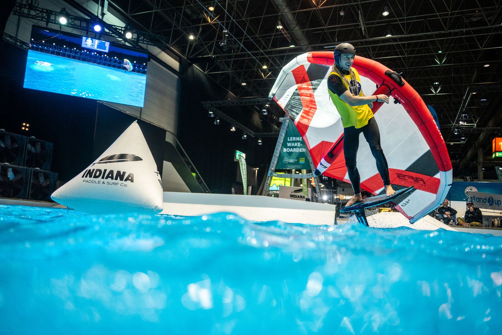 Angezogen wurden die Teilnehmerinnen und Teilnehmer von einer Wake-Winde, um auf das Foil zu kommen, während riesige Ventilatoren an der Seite des Beckens für Druck in den Wings sorgten, um den Drei-Runden-Kurs auf dem Pool in Bestzeit zu absolvieren. Fans, die sich in Halle 17 der Messe versammelt hatten, bereiteten den Fahrerinnen und Fahrer einen gebührenden Empfang. Einige Teilnehmer hatten bereits an der Eröffnungsveranstaltung der SFT Surf Foil World Tour teilgenommen, einem neuen, nicht windgetriebenen Contestformat, der auf der boot Düsseldorf startete, bevor er dieses Jahr in fünf Disziplinen auf der ganzen Welt Station machen soll.