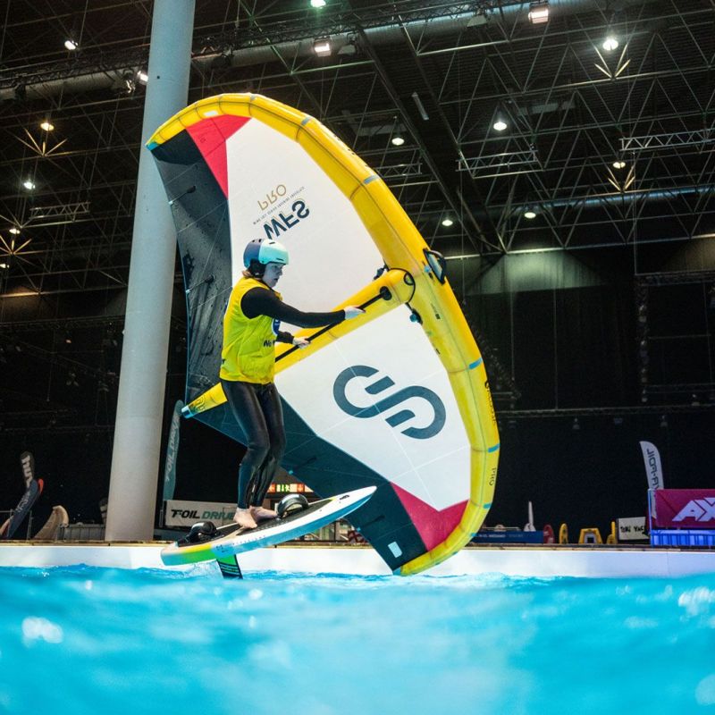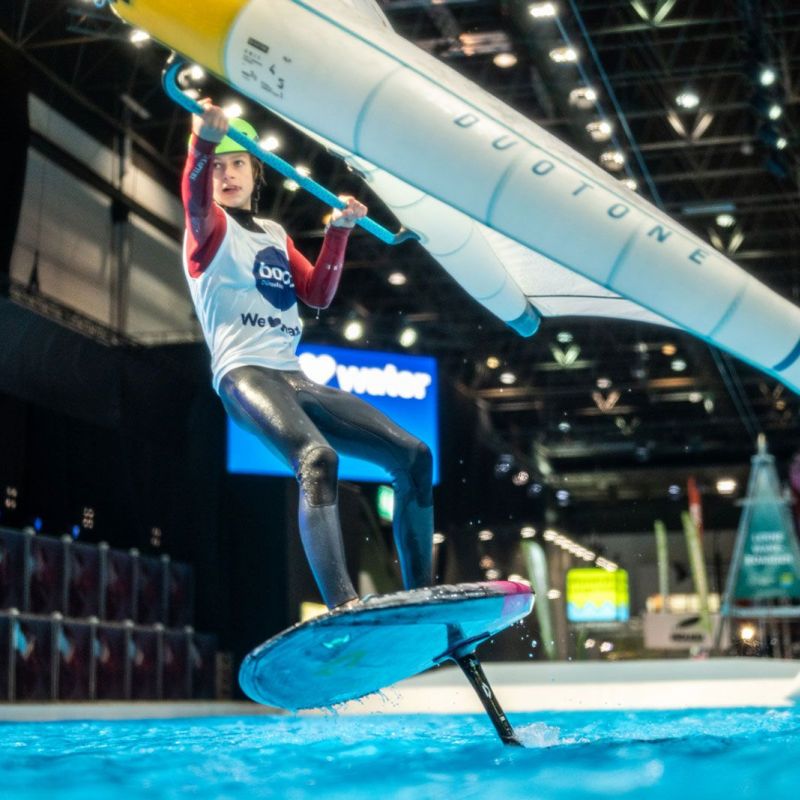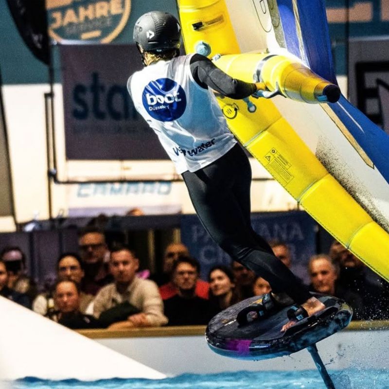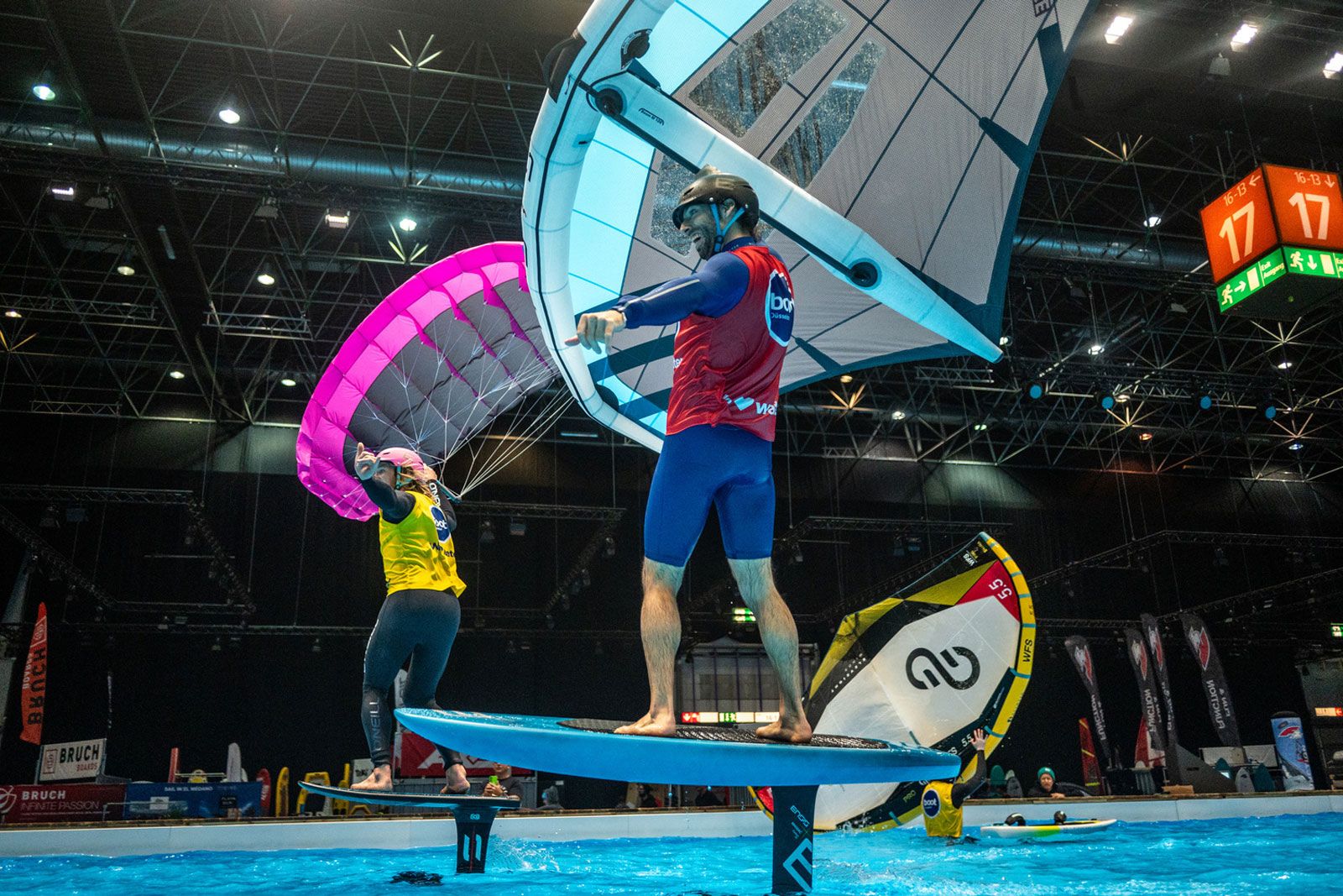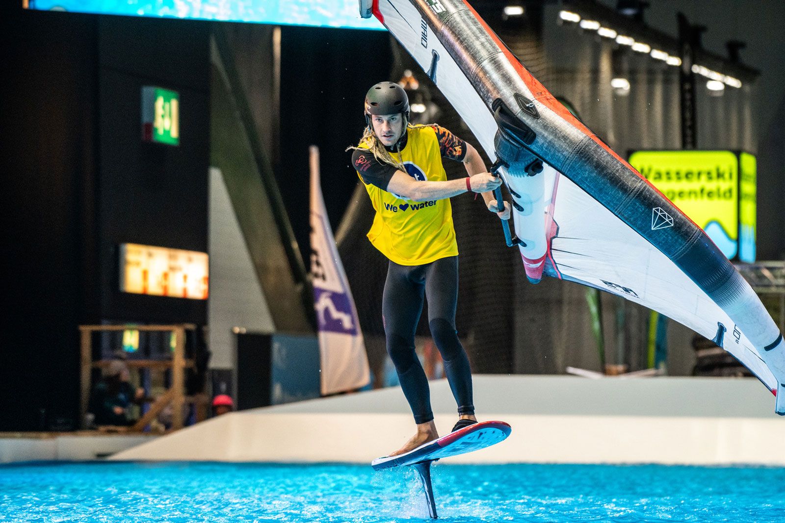 Angezogen wurden die Teilnehmerinnen und Teilnehmer von einer Wake-Winde, um auf das Foil zu kommen, während riesige Ventilatoren an der Seite des Beckens für Druck in den Wings sorgten, um den Drei-Runden-Kurs auf dem Pool in Bestzeit zu absolvieren. Fans, die sich in Halle 17 der Messe versammelt hatten, bereiteten den Fahrerinnen und Fahrer einen gebührenden Empfang. Einige Teilnehmer hatten bereits an der Eröffnungsveranstaltung der SFT Surf Foil World Tour teilgenommen, einem neuen, nicht windgetriebenen Contestformat, der auf der boot Düsseldorf startete, bevor er dieses Jahr in fünf Disziplinen auf der ganzen Welt Station machen soll.