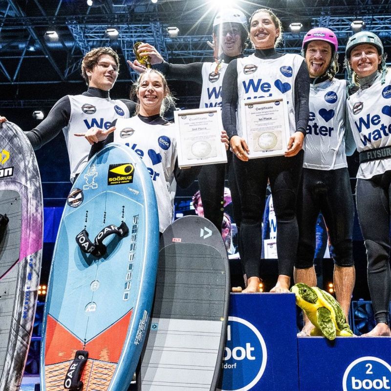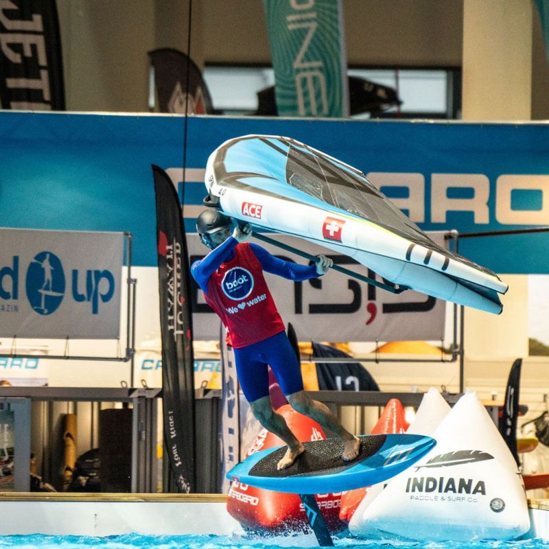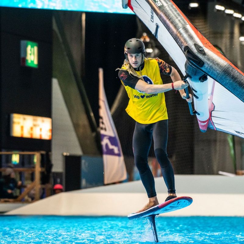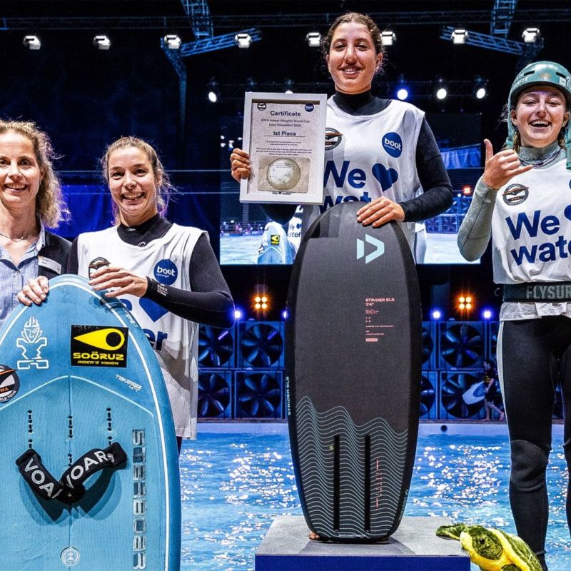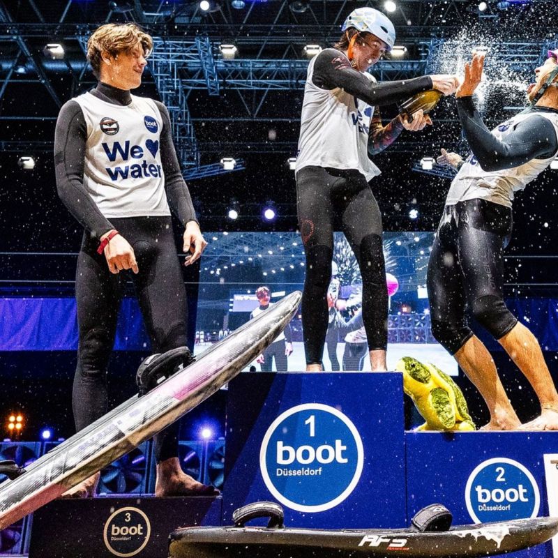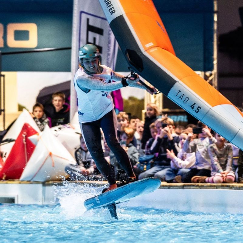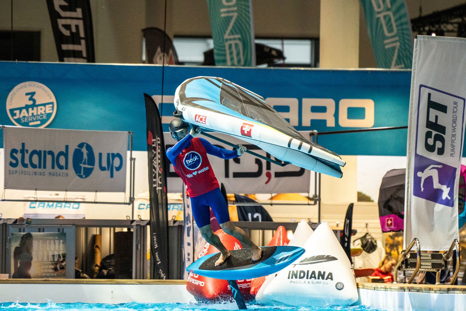 Angezogen wurden die Teilnehmerinnen und Teilnehmer von einer Wake-Winde, um auf das Foil zu kommen, während riesige Ventilatoren an der Seite des Beckens für Druck in den Wings sorgten, um den Drei-Runden-Kurs auf dem Pool in Bestzeit zu absolvieren. Fans, die sich in Halle 17 der Messe versammelt hatten, bereiteten den Fahrerinnen und Fahrer einen gebührenden Empfang. Einige Teilnehmer hatten bereits an der Eröffnungsveranstaltung der SFT Surf Foil World Tour teilgenommen, einem neuen, nicht windgetriebenen Contestformat, der auf der boot Düsseldorf startete, bevor er dieses Jahr in fünf Disziplinen auf der ganzen Welt Station machen soll.