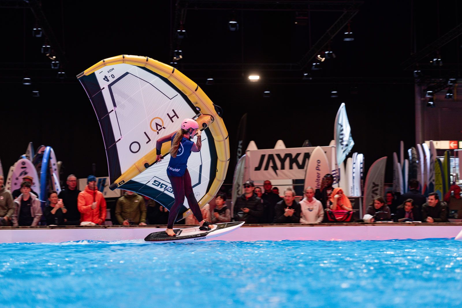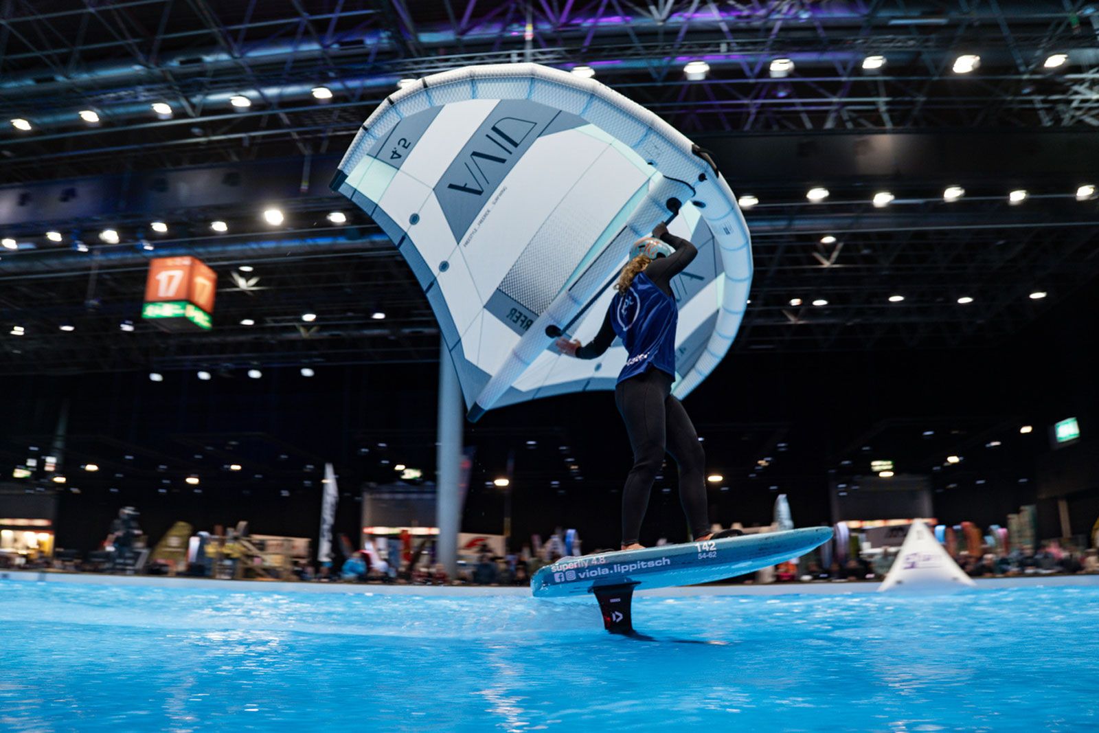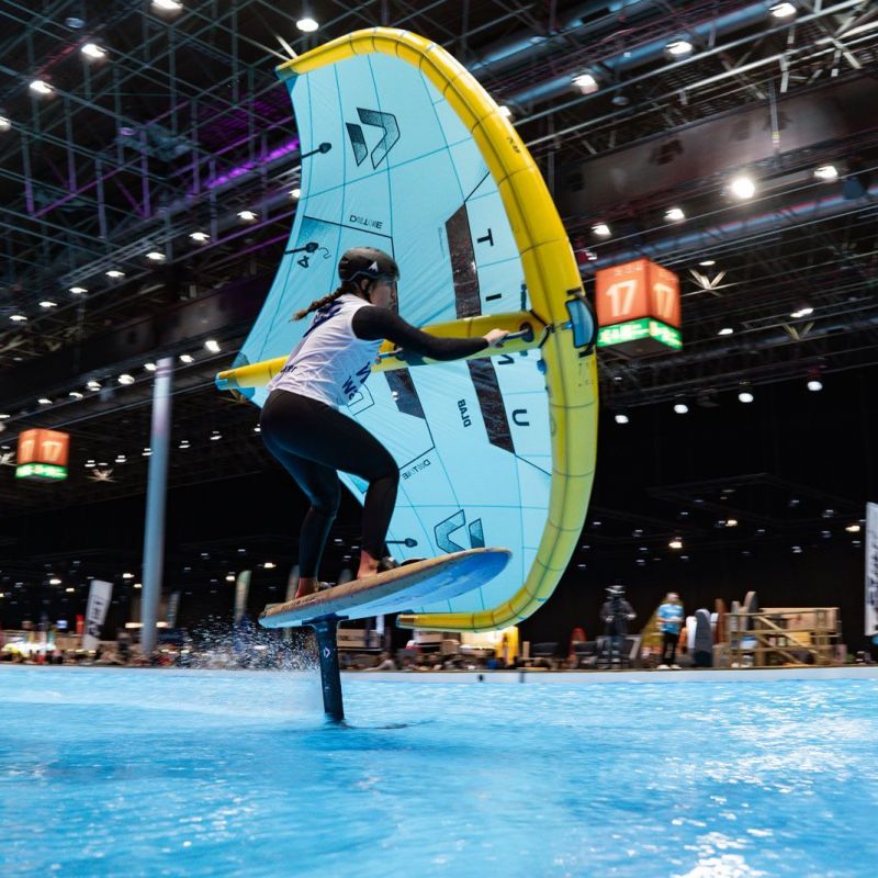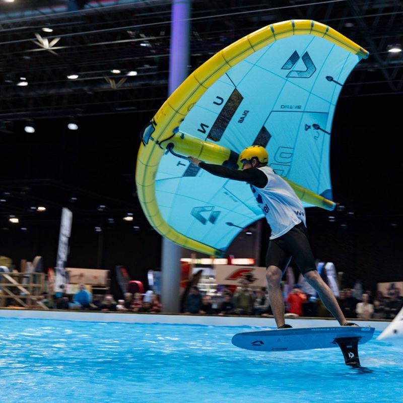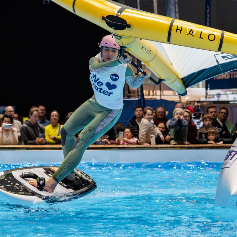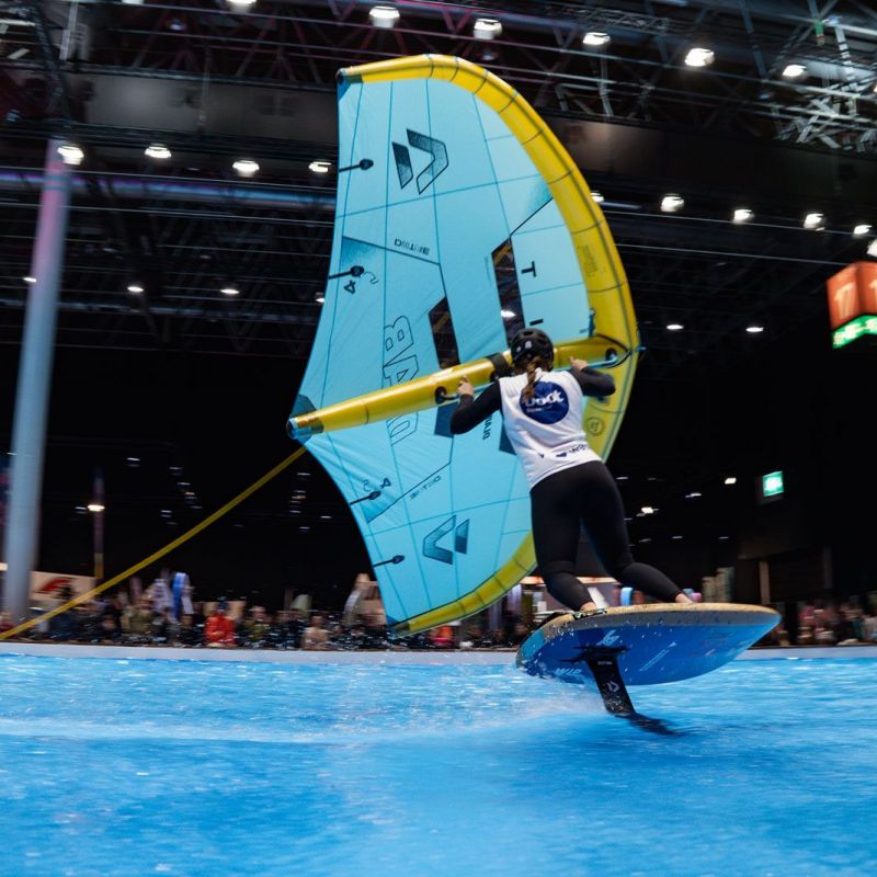 Viele der Besucher in Halle 17 und am XXL-Pool erlebten Wingfoil-Action zum ersten Mal hautnah. Das Einladungs-Event in Düsseldorf bot ein hochkarätiges Teilnehmerfeld mit einigen der weltbesten Stars und vielen Publikumslieblingen. Die Mutter der mehrfachen Weltmeisterin Nia Suardíaz ist Deutsche und die junge Atletin spricht gut Deutsch, obwohl sie in Spanien aufgewachsen ist. Der in München lebende Franz Schlittenbauer ist ein aufstrebender junger Fahrer bei den Herren, Balz Müller und die Österreicherin Viola Lippitsch gehören zu den bekanntesten Gesichtern der jungen Sportart. Mit ihnen starteten kaum weniger schillernde Namen der Wingfoil-Szene wie Alan Fédit und Manon Dupé aus Frankreich, Ancor Sosa aus Spanien, Bowien van der Linden aus den Niederlanden sowie Wilhelm und Hubert Christahl aus Deutschland.