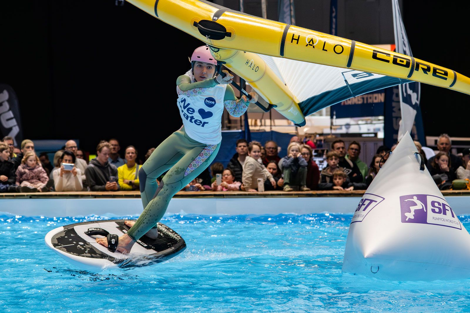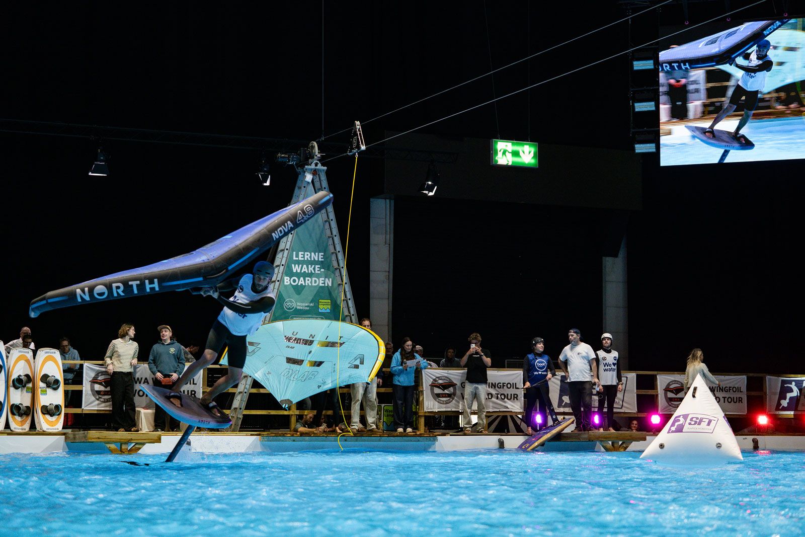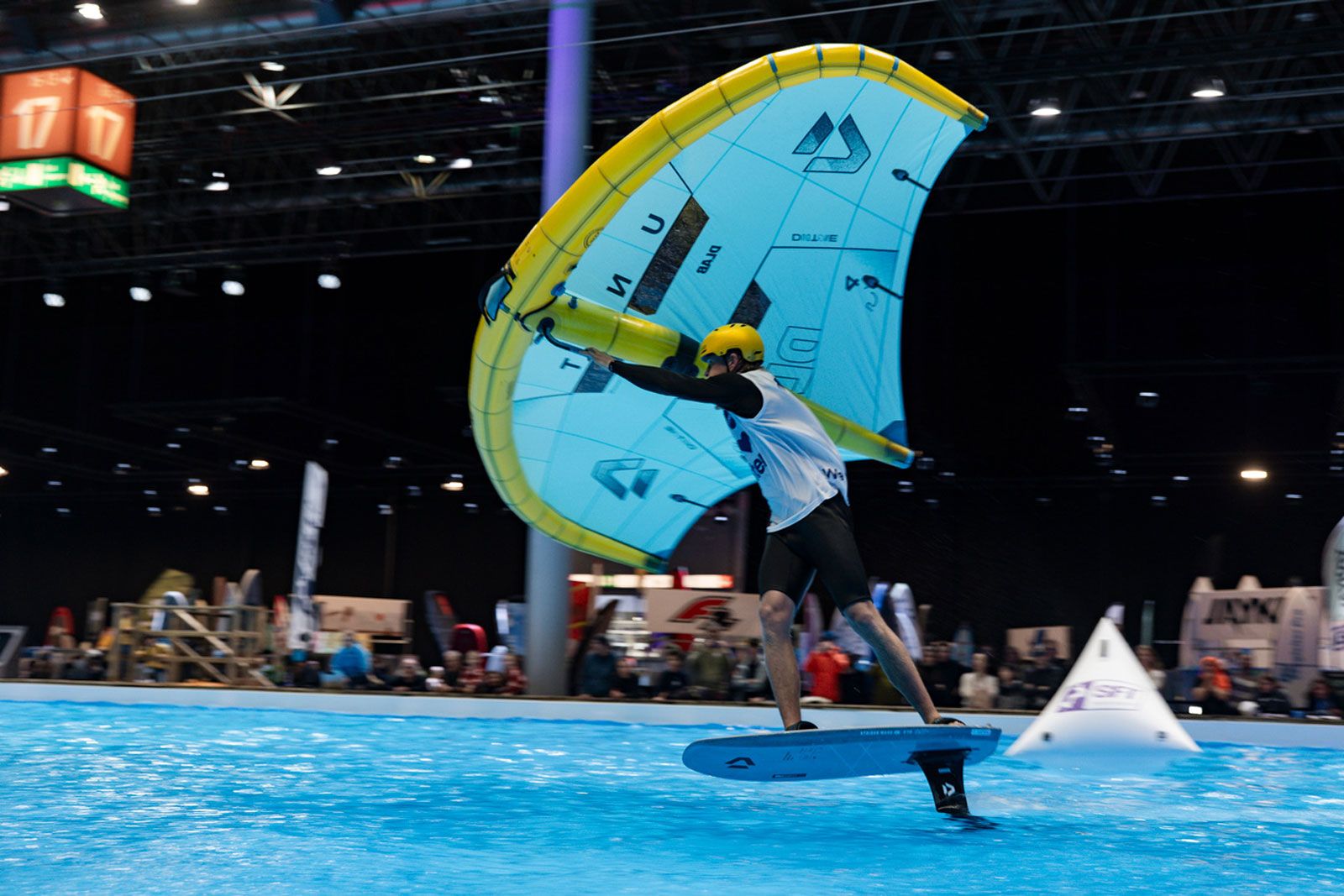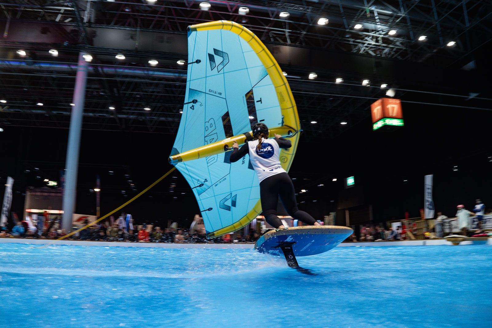 Viele der Besucher in Halle 17 und am XXL-Pool erlebten Wingfoil-Action zum ersten Mal hautnah. Das Einladungs-Event in Düsseldorf bot ein hochkarätiges Teilnehmerfeld mit einigen der weltbesten Stars und vielen Publikumslieblingen. Die Mutter der mehrfachen Weltmeisterin Nia Suardíaz ist Deutsche und die junge Atletin spricht gut Deutsch, obwohl sie in Spanien aufgewachsen ist. Der in München lebende Franz Schlittenbauer ist ein aufstrebender junger Fahrer bei den Herren, Balz Müller und die Österreicherin Viola Lippitsch gehören zu den bekanntesten Gesichtern der jungen Sportart. Mit ihnen starteten kaum weniger schillernde Namen der Wingfoil-Szene wie Alan Fédit und Manon Dupé aus Frankreich, Ancor Sosa aus Spanien, Bowien van der Linden aus den Niederlanden sowie Wilhelm und Hubert Christahl aus Deutschland.