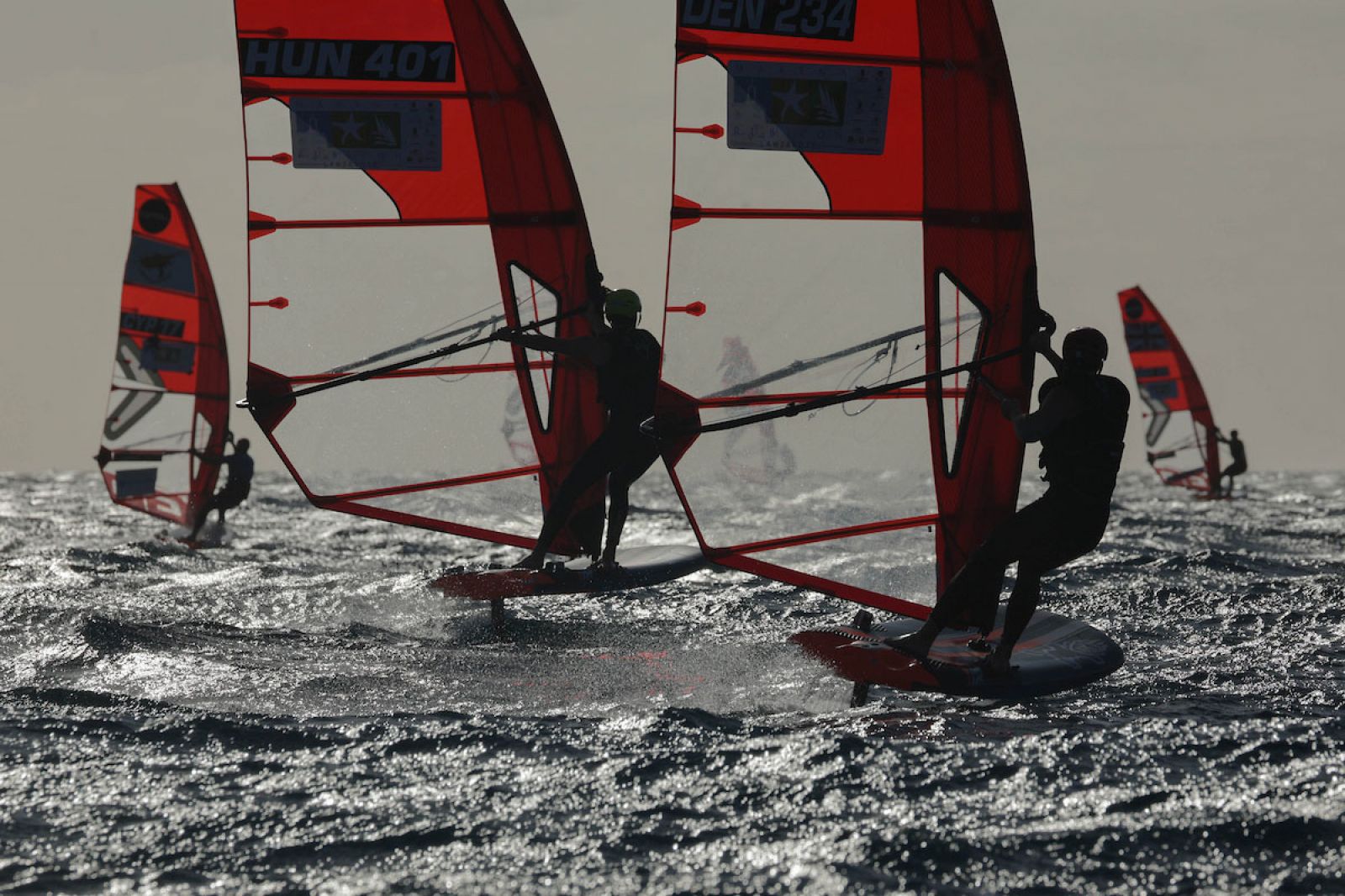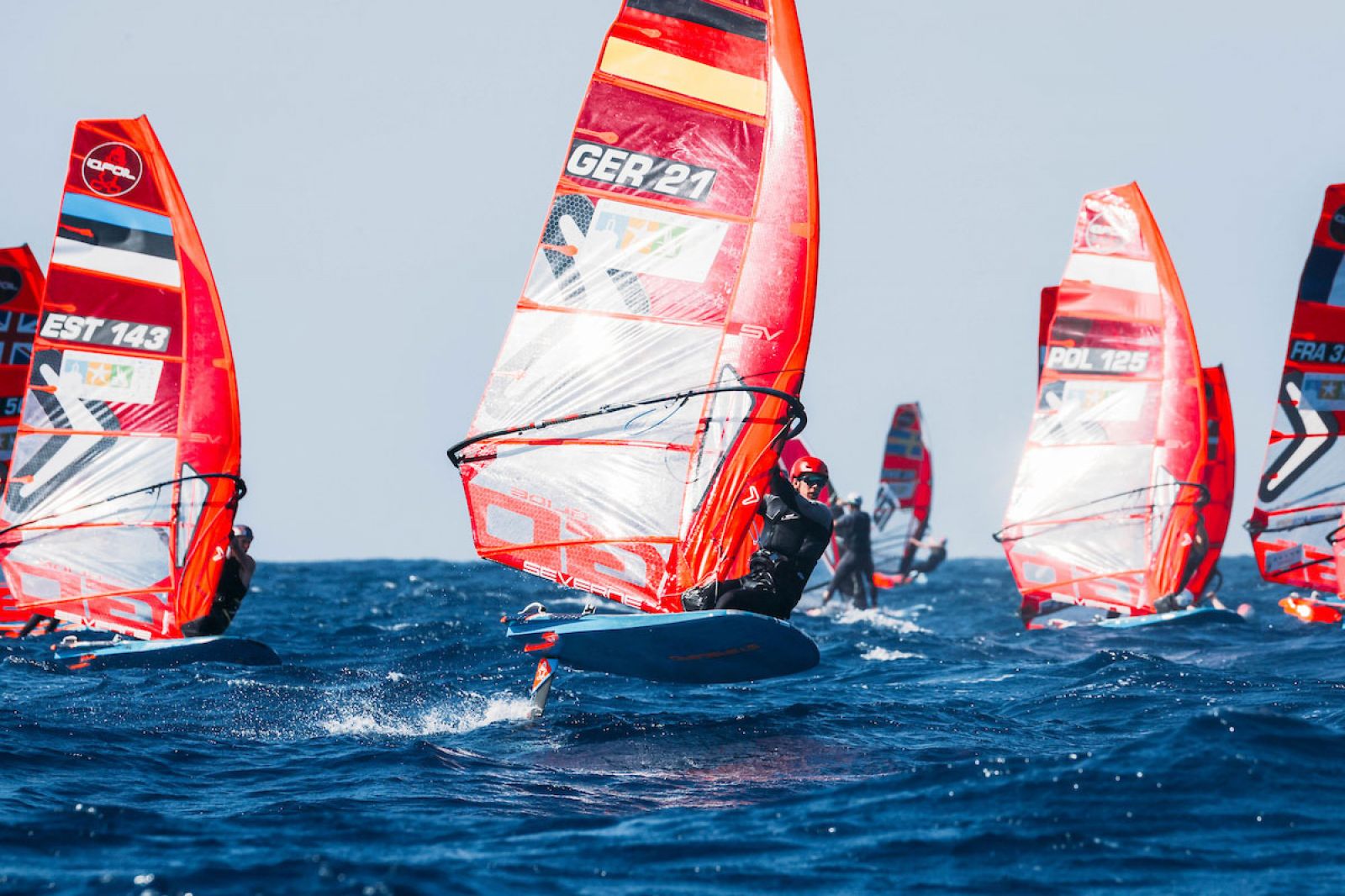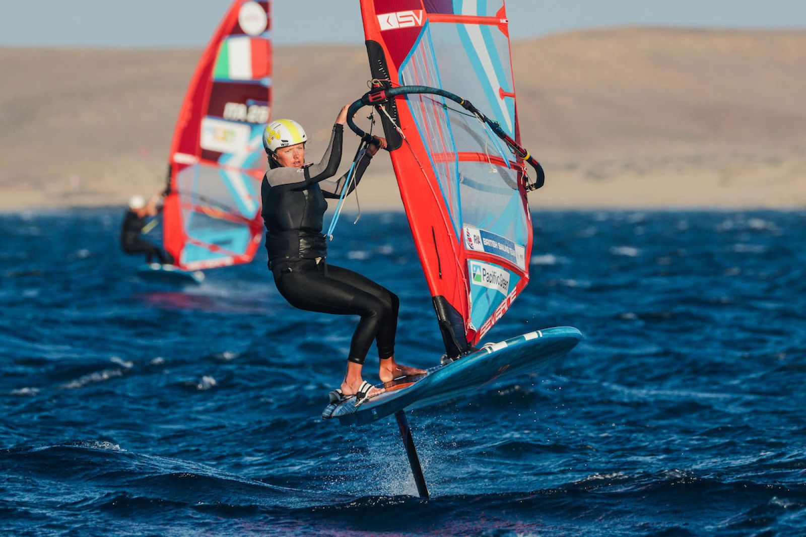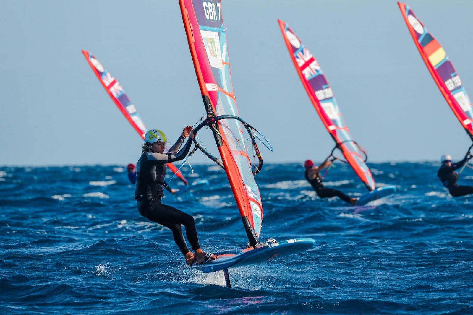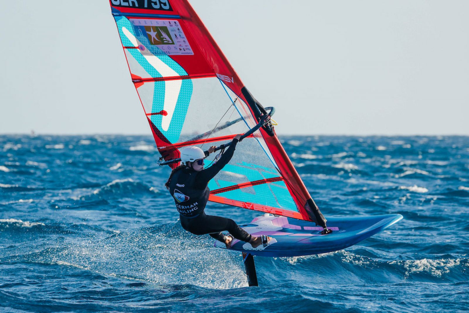 Shahar Tibi ist mit einem dritten und einem zweiten Platz beim Nachmittagsrennen Zweite, und Olympiasiegerin Marta Maggetti Dritte, nachdem sie das letzte und windigste Rennen des Tages mit dem neuen 7,3-Quadratmeter-Segel gewinnen konnte. Dahinter folgen Islay Watson und Lola Sorin.