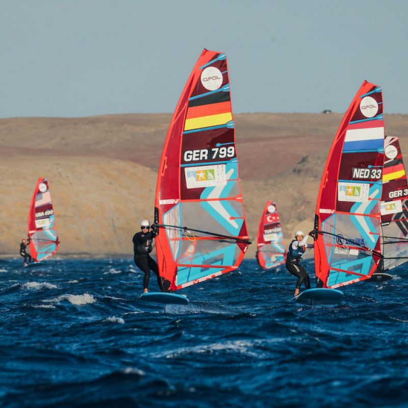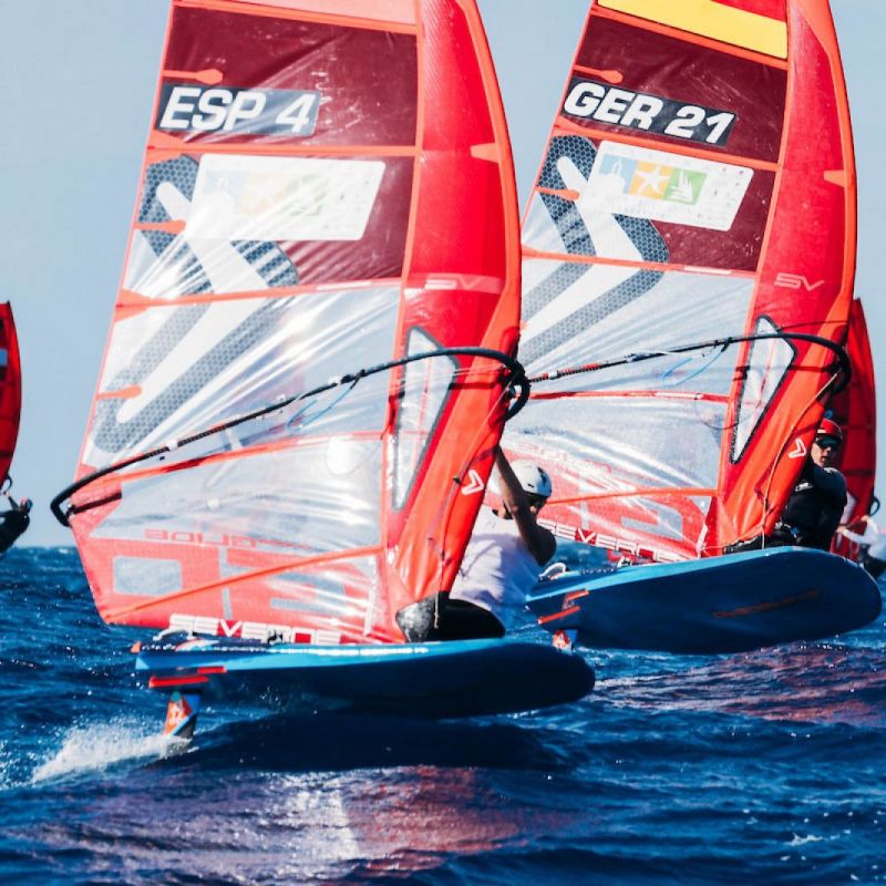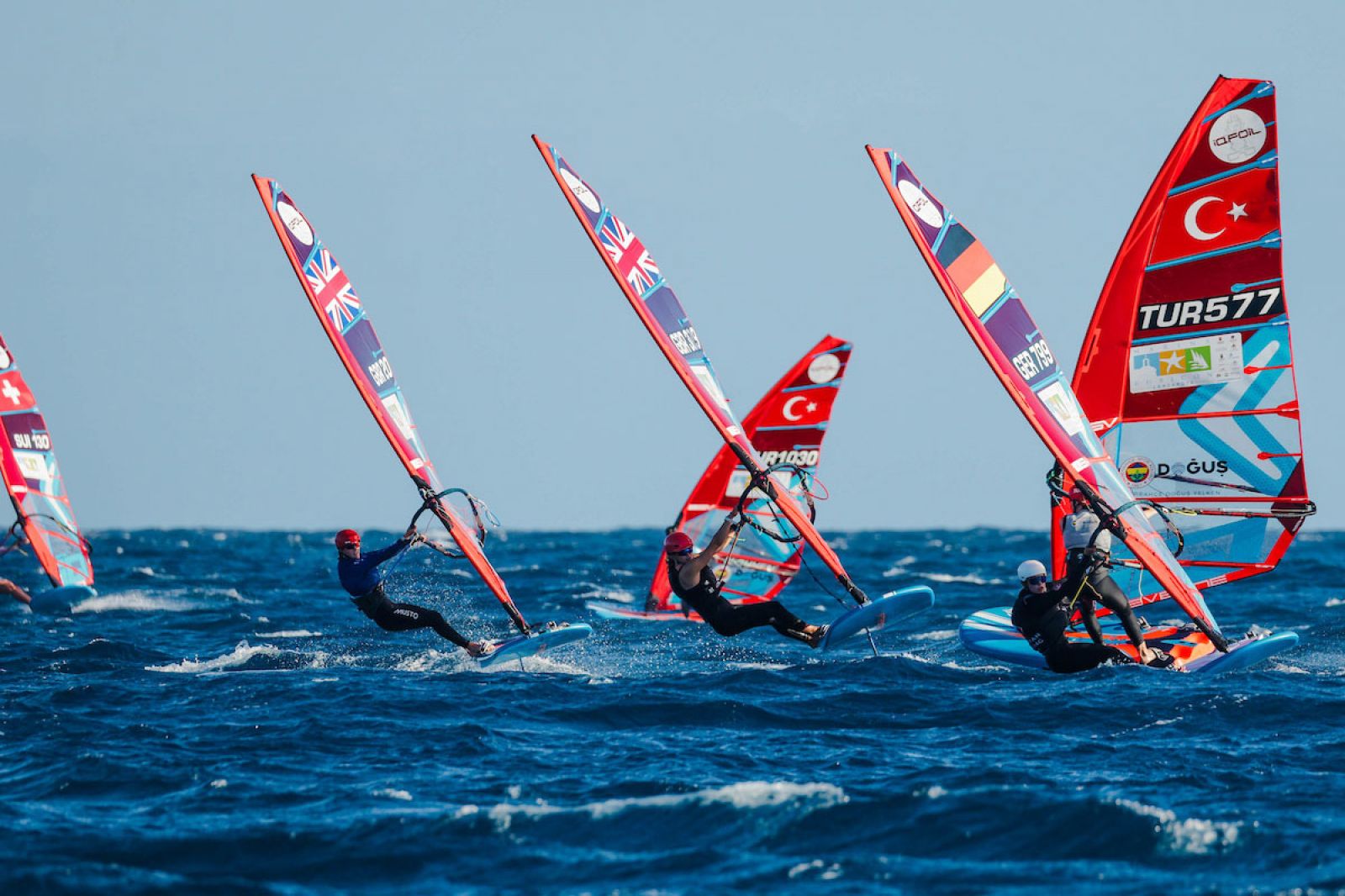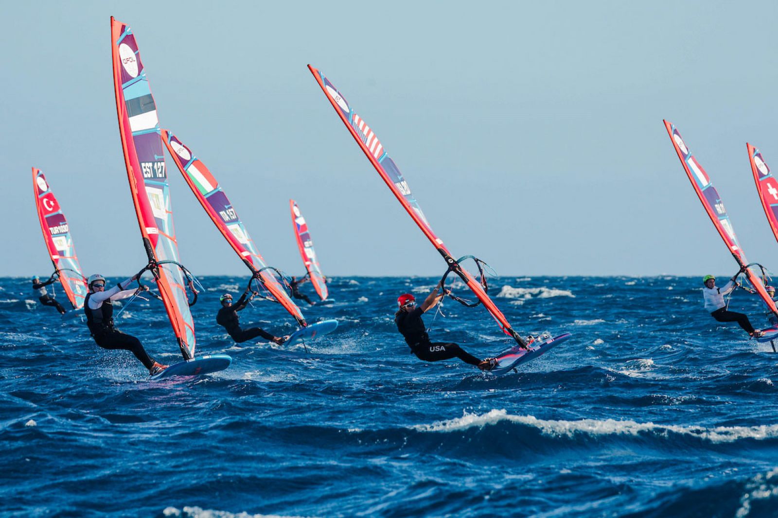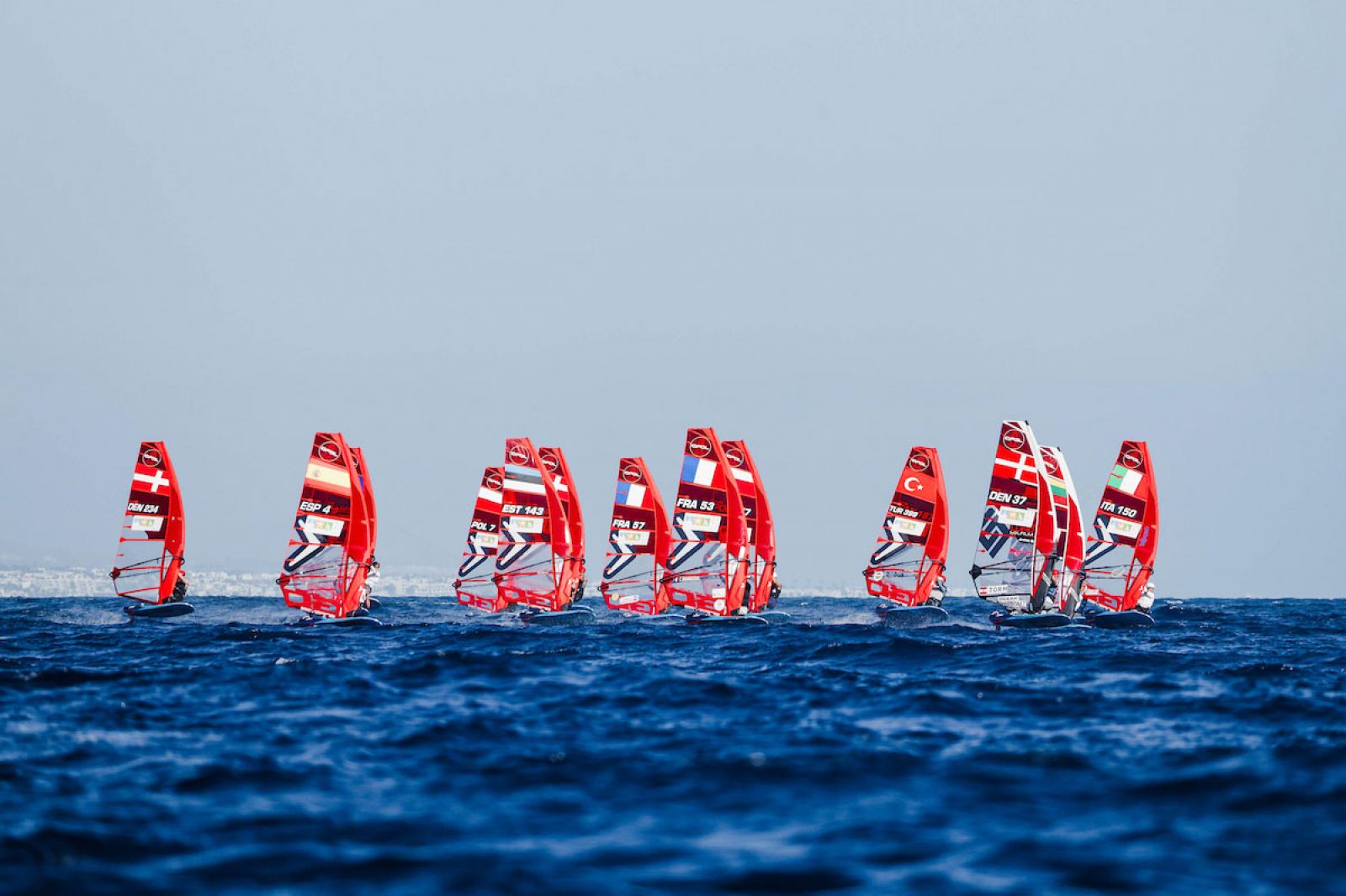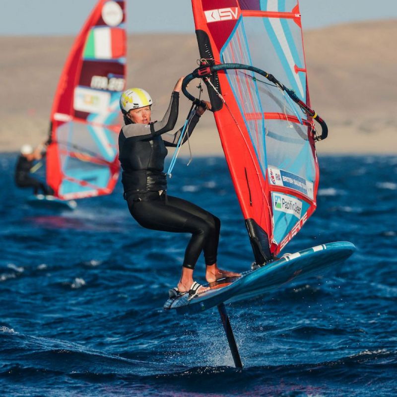 Shahar Tibi ist mit einem dritten und einem zweiten Platz beim Nachmittagsrennen Zweite, und Olympiasiegerin Marta Maggetti Dritte, nachdem sie das letzte und windigste Rennen des Tages mit dem neuen 7,3-Quadratmeter-Segel gewinnen konnte. Dahinter folgen Islay Watson und Lola Sorin.