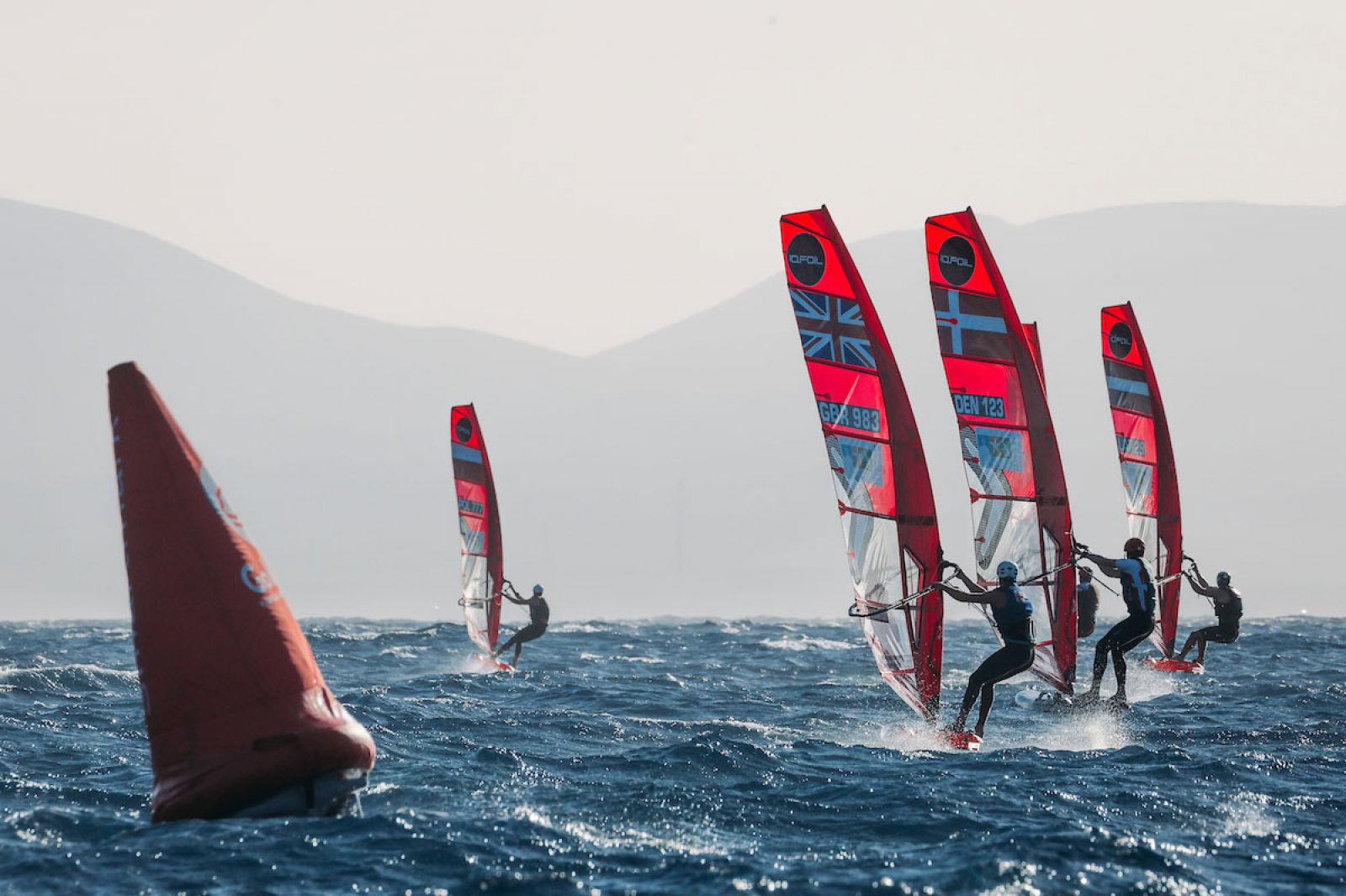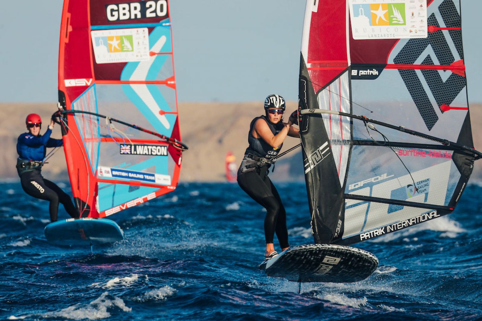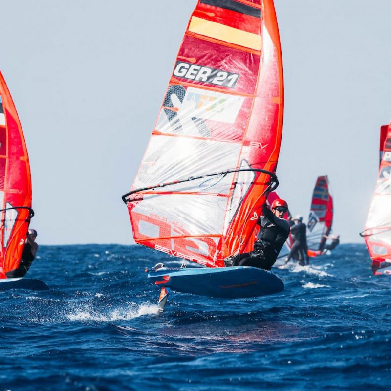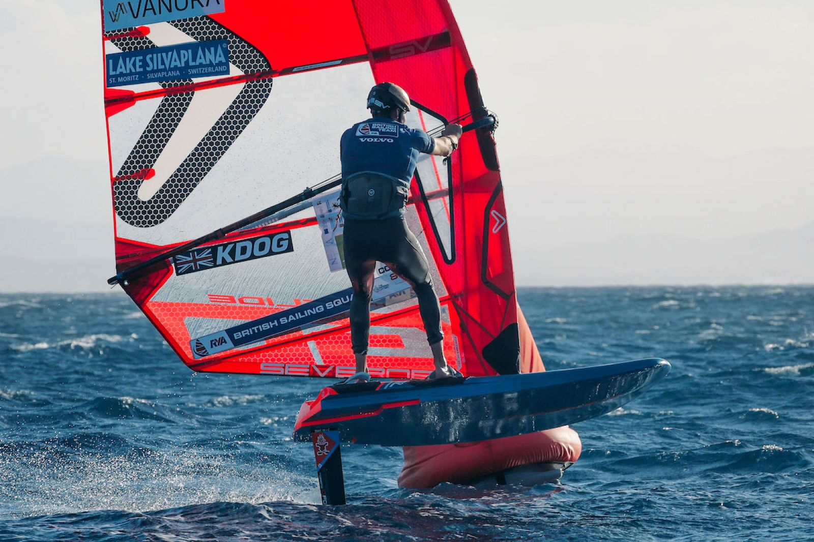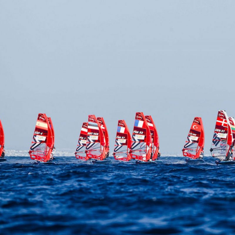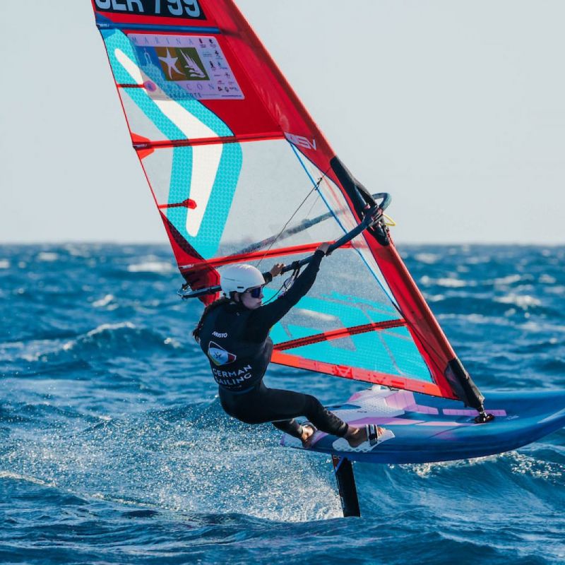 Shahar Tibi ist mit einem dritten und einem zweiten Platz beim Nachmittagsrennen Zweite, und Olympiasiegerin Marta Maggetti Dritte, nachdem sie das letzte und windigste Rennen des Tages mit dem neuen 7,3-Quadratmeter-Segel gewinnen konnte. Dahinter folgen Islay Watson und Lola Sorin.