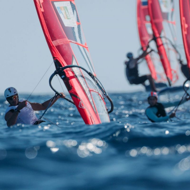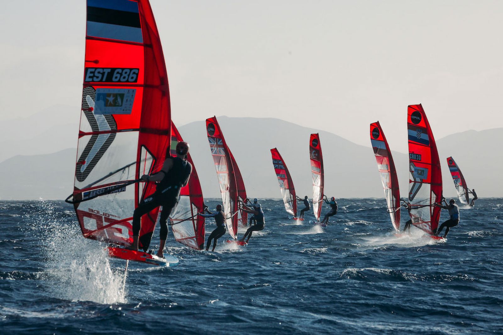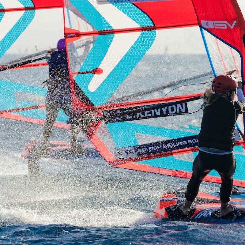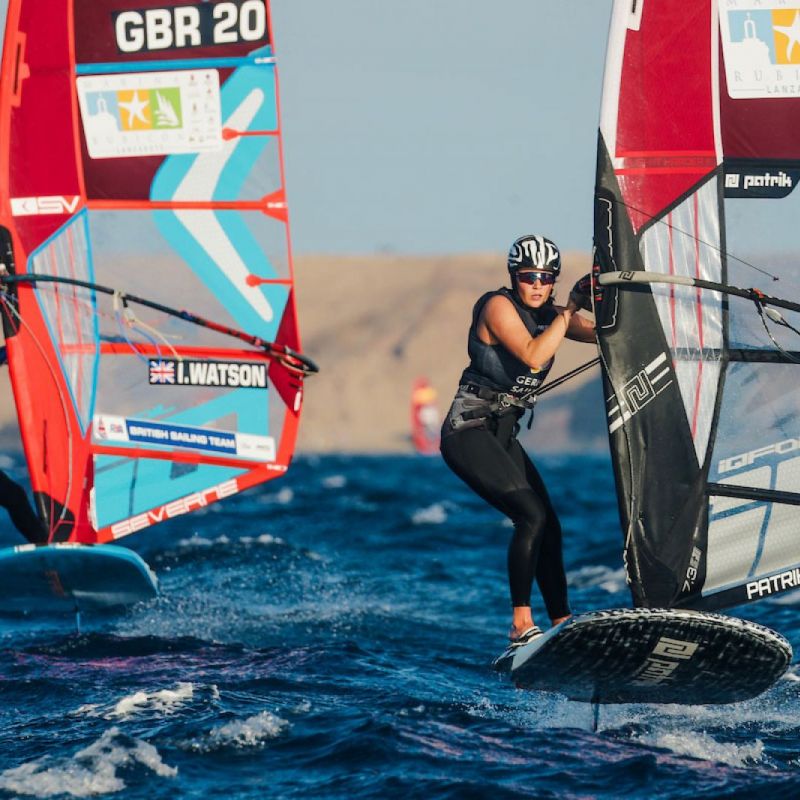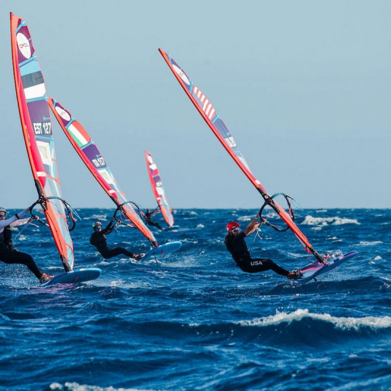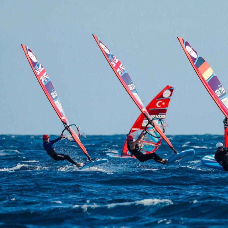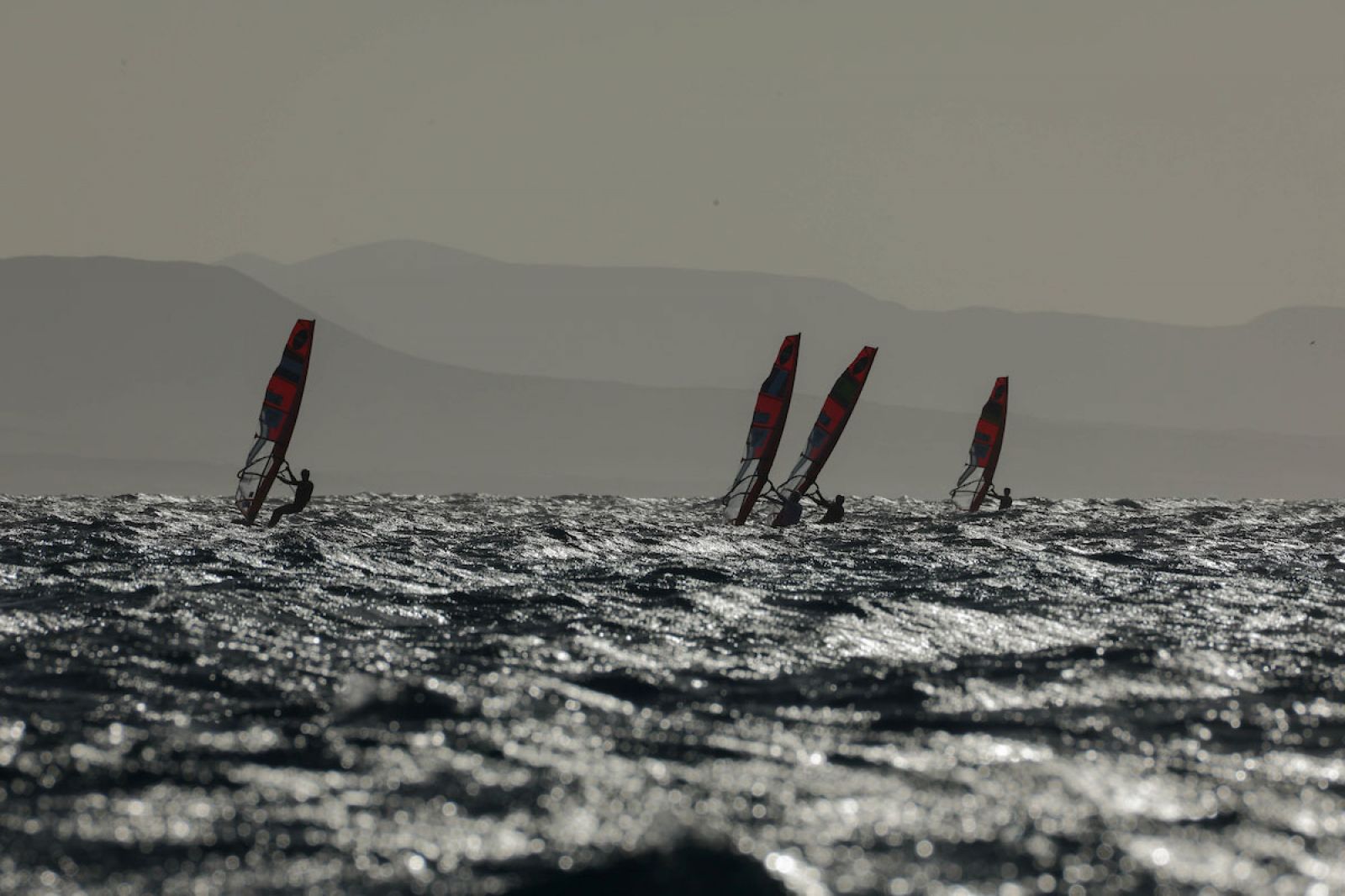 Shahar Tibi ist mit einem dritten und einem zweiten Platz beim Nachmittagsrennen Zweite, und Olympiasiegerin Marta Maggetti Dritte, nachdem sie das letzte und windigste Rennen des Tages mit dem neuen 7,3-Quadratmeter-Segel gewinnen konnte. Dahinter folgen Islay Watson und Lola Sorin.