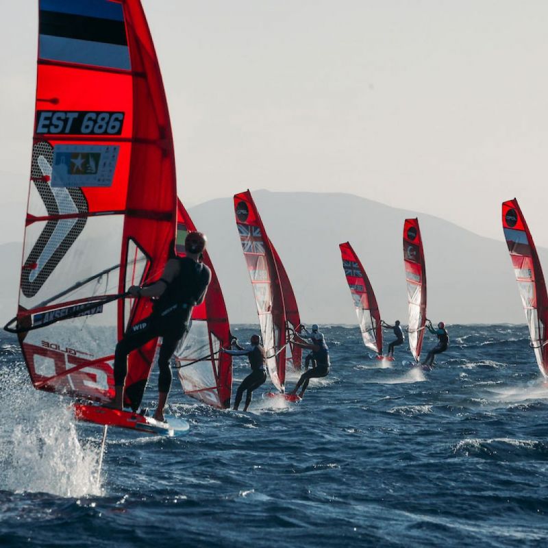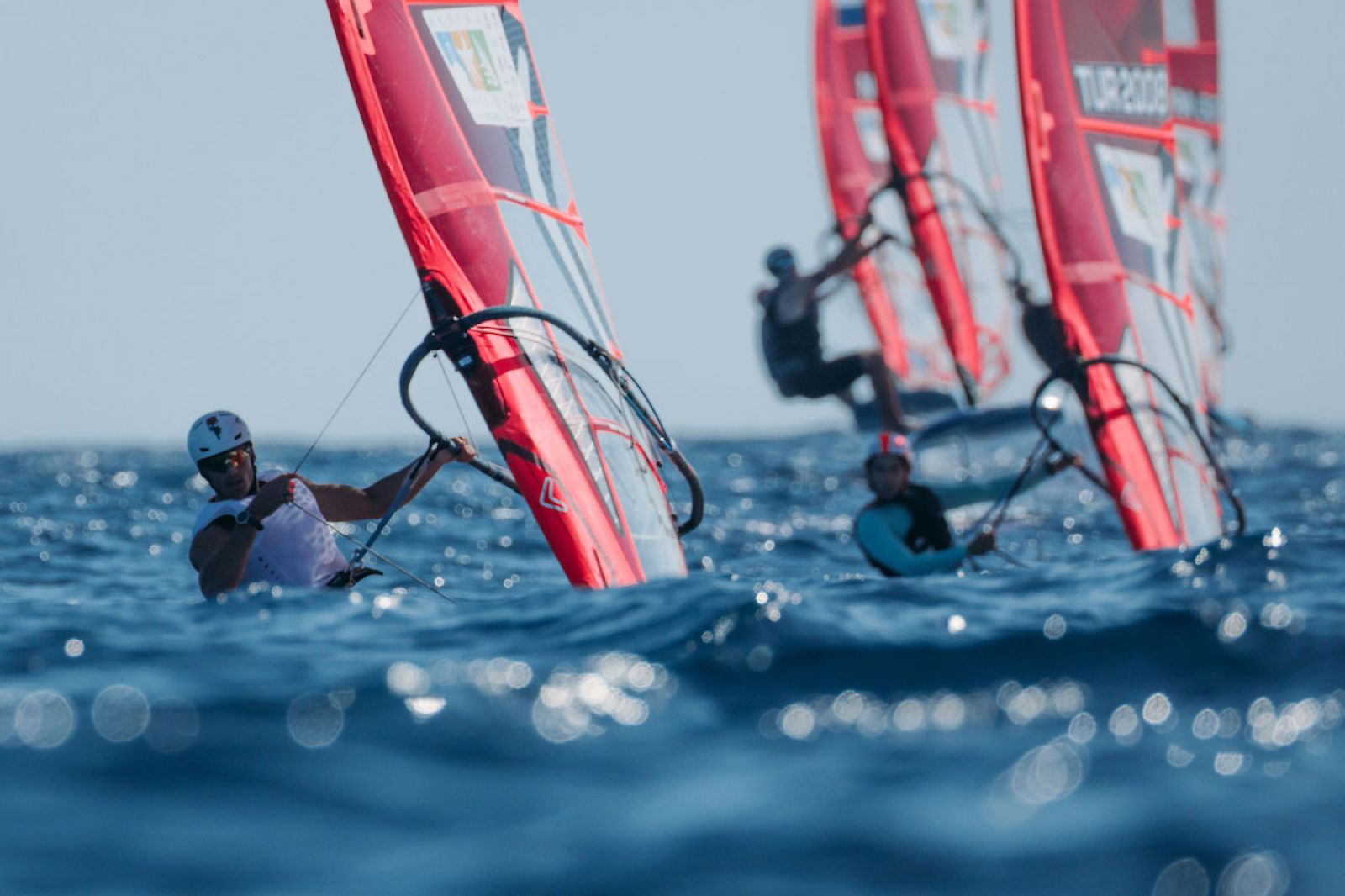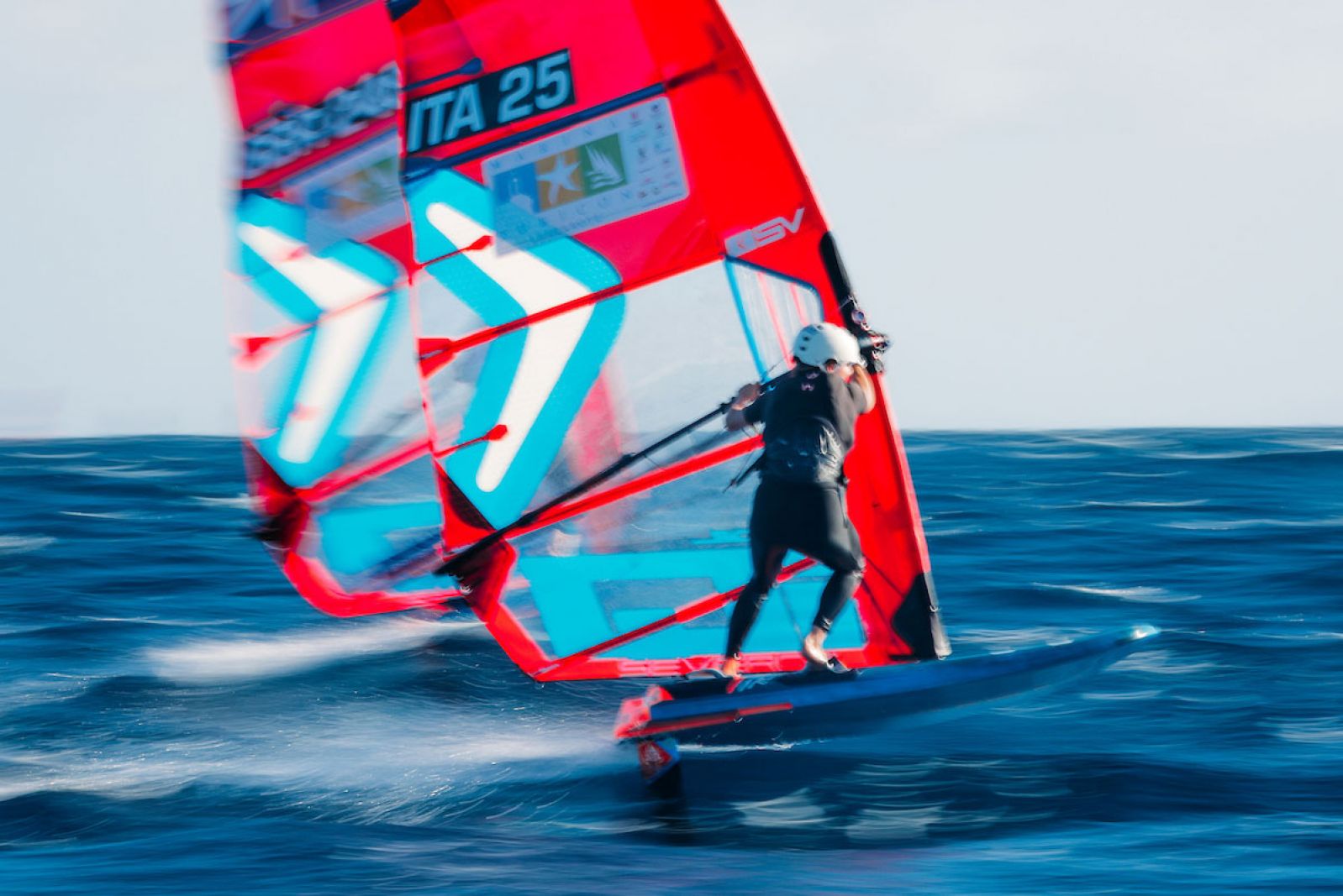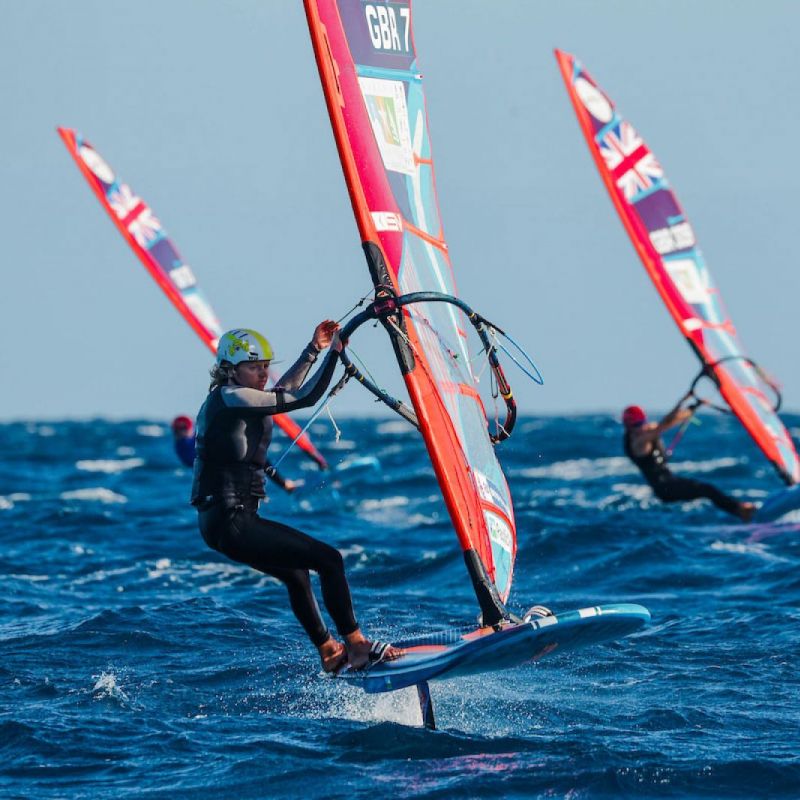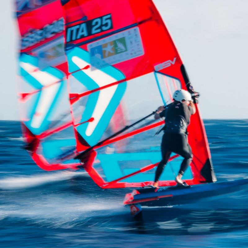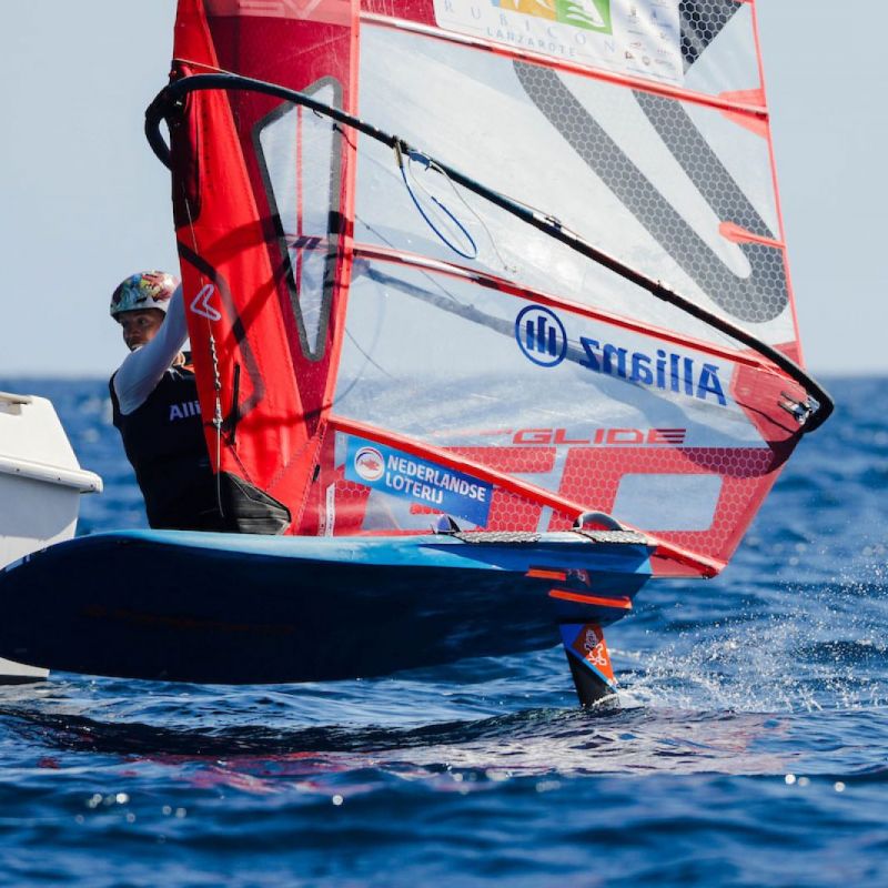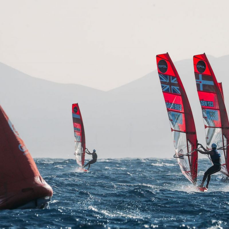 Shahar Tibi ist mit einem dritten und einem zweiten Platz beim Nachmittagsrennen Zweite, und Olympiasiegerin Marta Maggetti Dritte, nachdem sie das letzte und windigste Rennen des Tages mit dem neuen 7,3-Quadratmeter-Segel gewinnen konnte. Dahinter folgen Islay Watson und Lola Sorin.