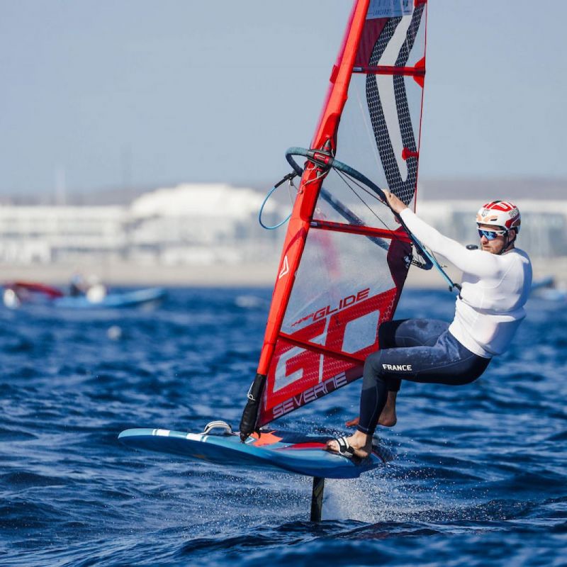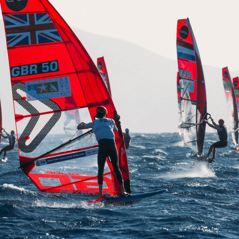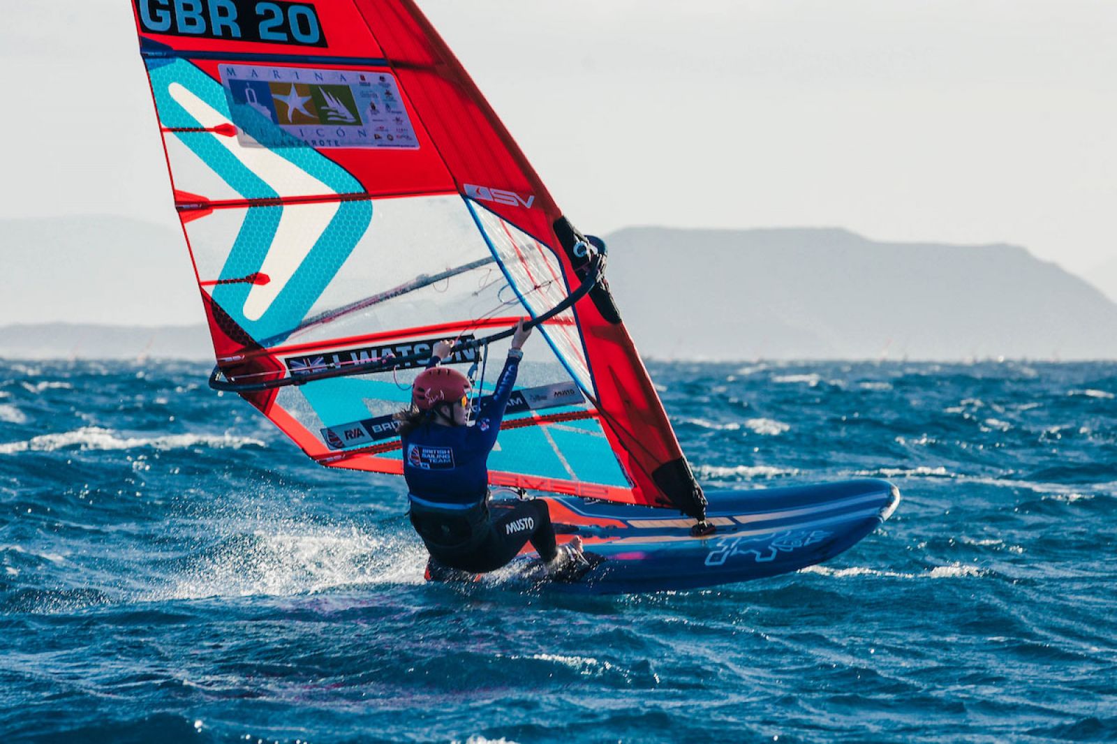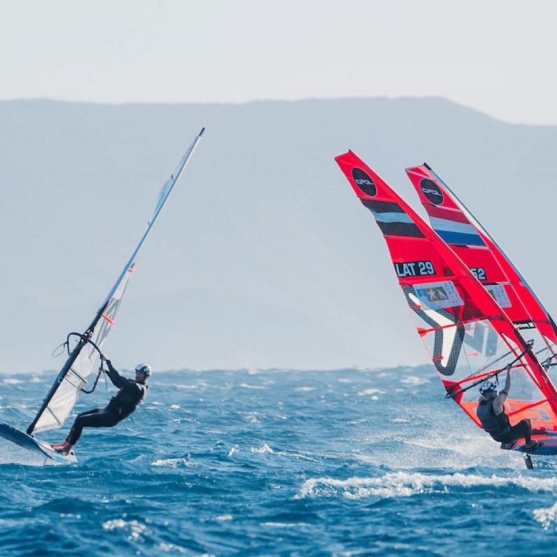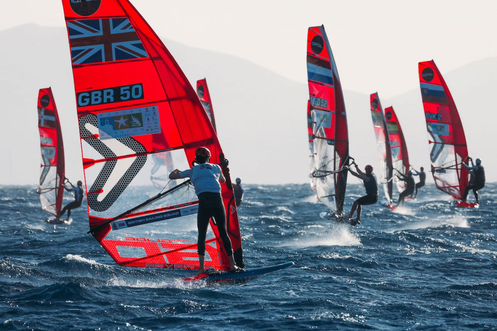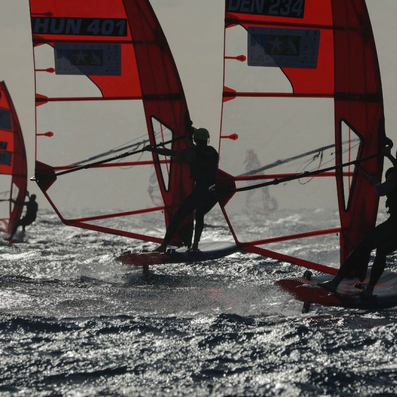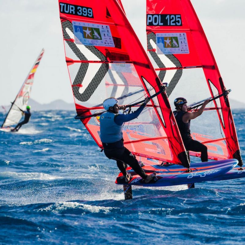 Shahar Tibi ist mit einem dritten und einem zweiten Platz beim Nachmittagsrennen Zweite, und Olympiasiegerin Marta Maggetti Dritte, nachdem sie das letzte und windigste Rennen des Tages mit dem neuen 7,3-Quadratmeter-Segel gewinnen konnte. Dahinter folgen Islay Watson und Lola Sorin.