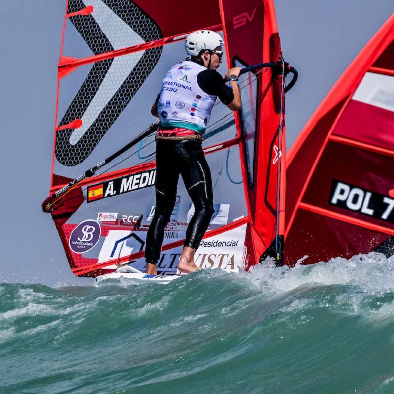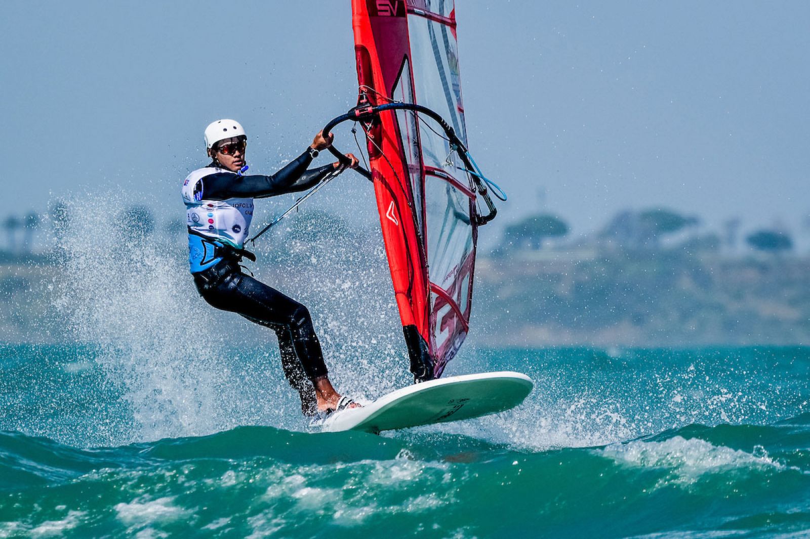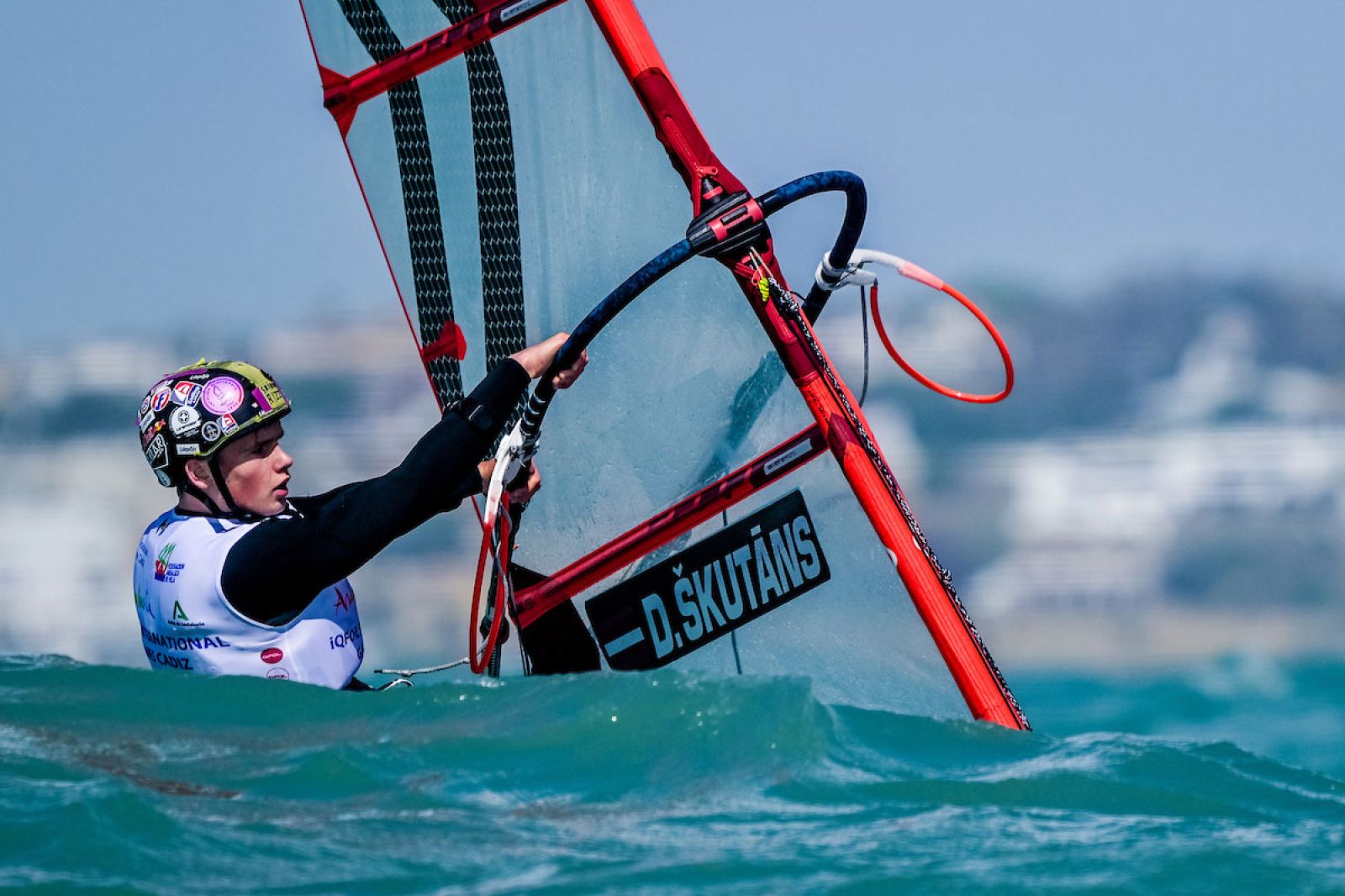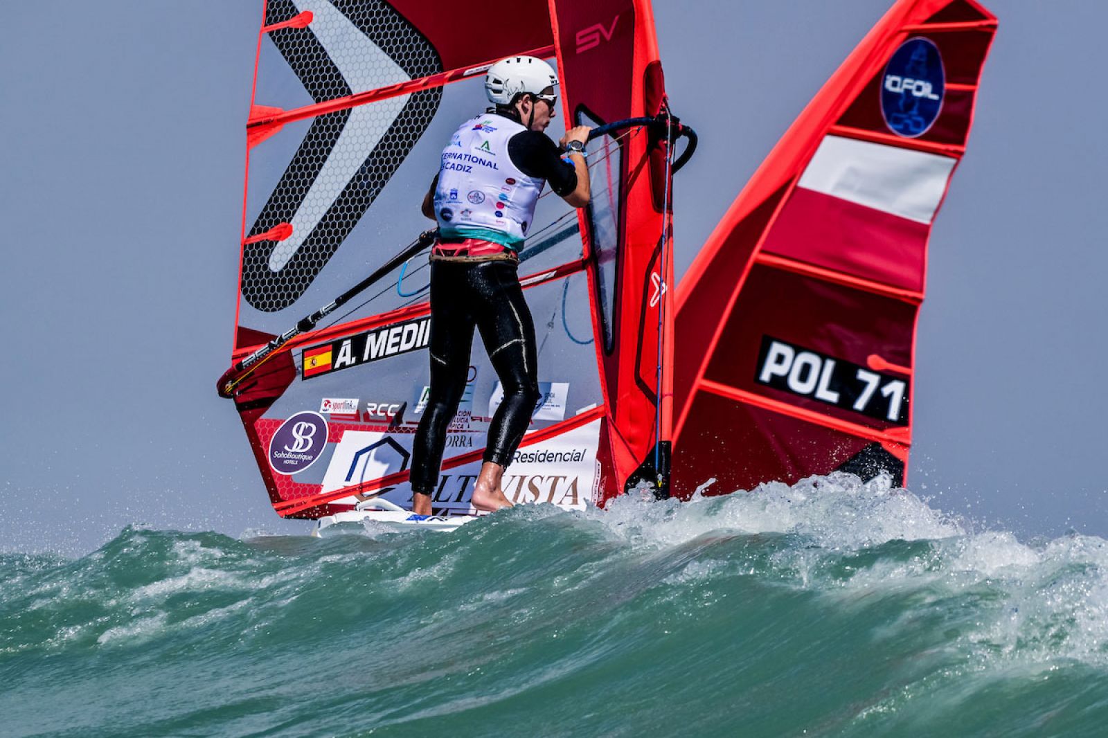 von Sven BlockExtreme Bedingungen, die die ganze Woche über anhalten sollen, begrüßten die 240 Starterinnen und Starter am Eröffnungstag in Cádiz. Mit Winden von 15 bis 25 Knoten aus Südwest, die bis zu 30 Grad abdrehten, einer drei bis fünf Meter hohen Dünung und Böen, die sich über die ganze Rennstrecke zogen, standen die Flotten der Senioren, U19 und U17 vor einem anspruchsvollen Start in den Wettbewerb.