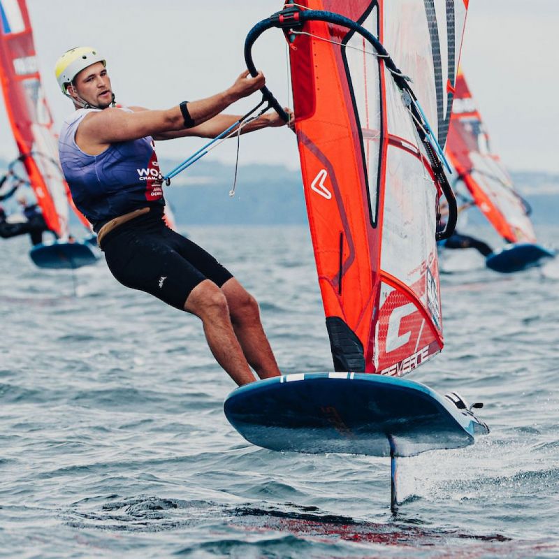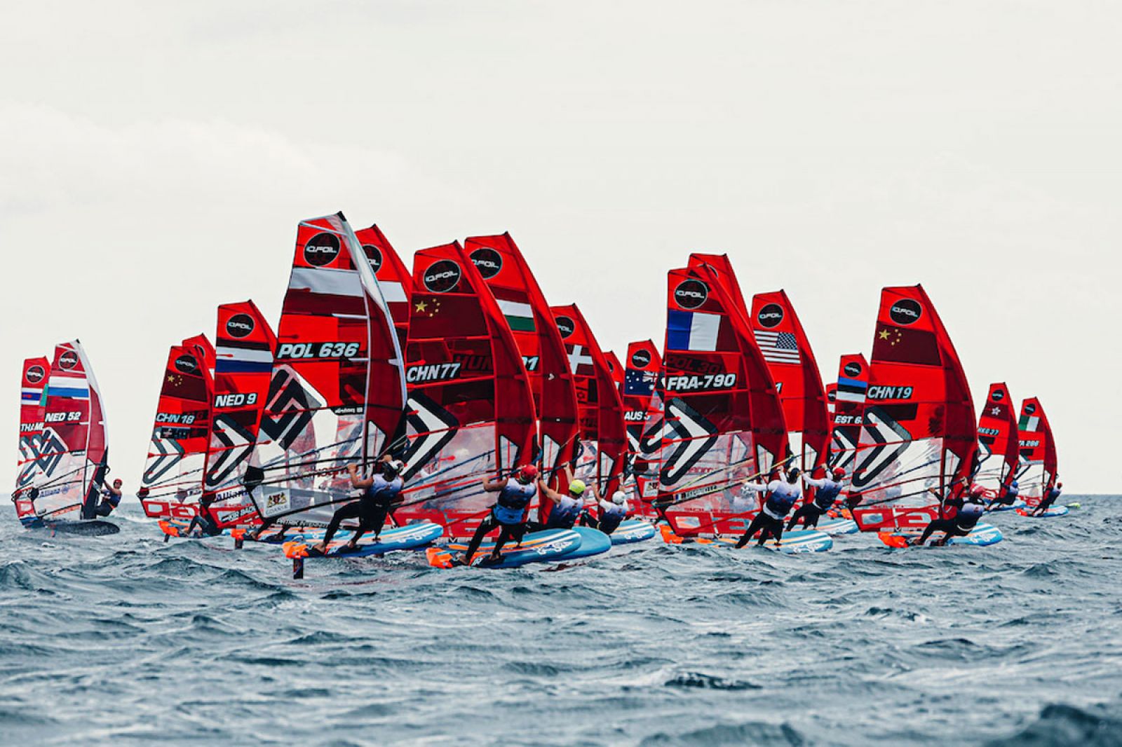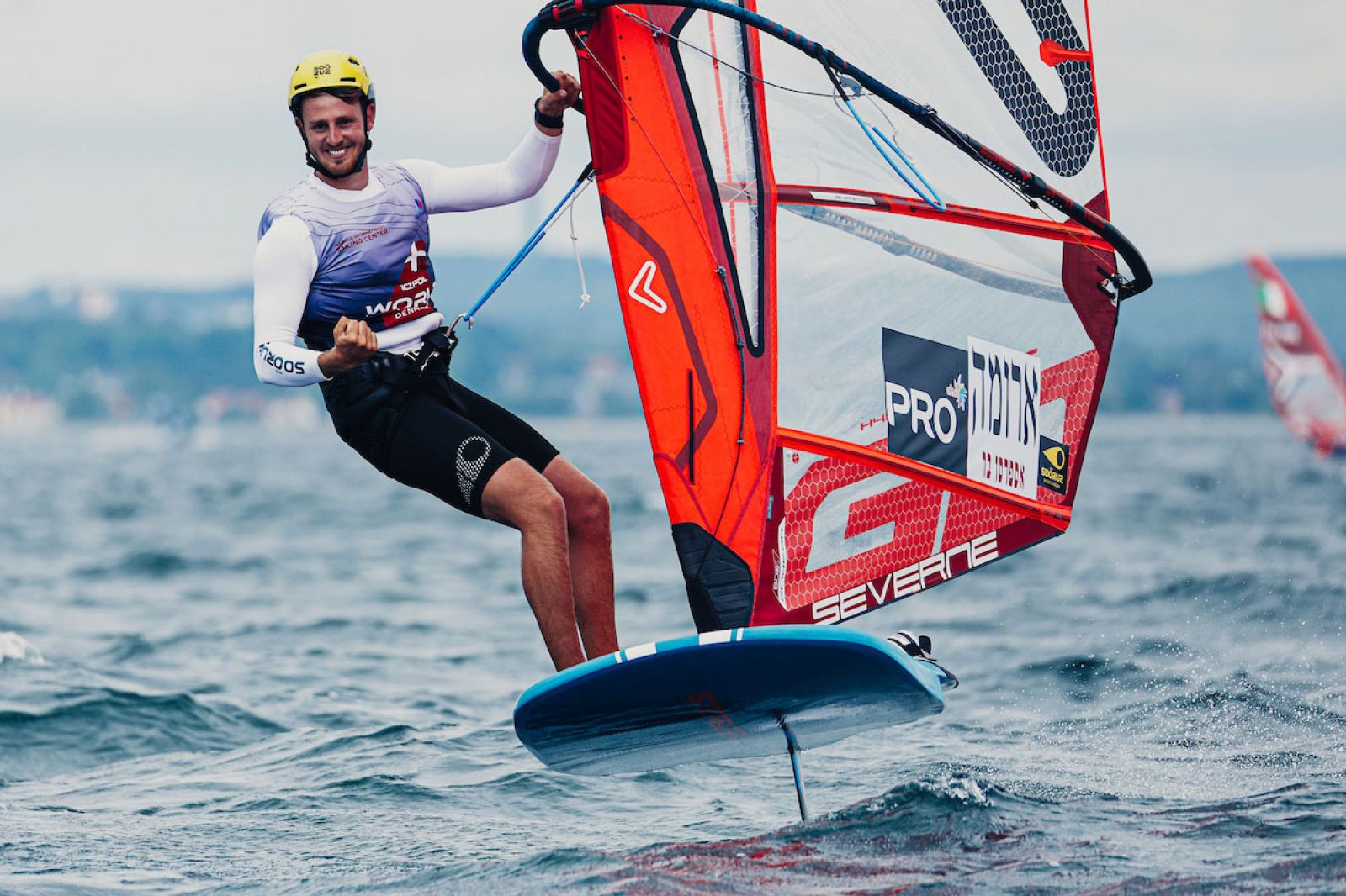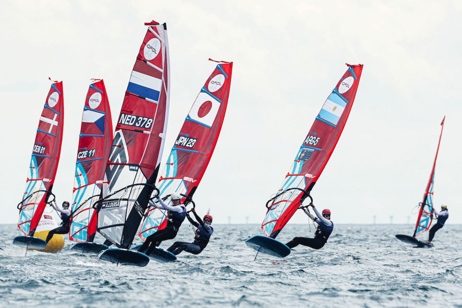 Bei der Herrenflotte, die wie die Damen in zwei Qualifikationsgruppen aufgeteilt war, konnte die gelbe Gruppe vier Rennen absolvieren, während die blaue Gruppe nur drei Rennen beenden konnte, das fehlende Kursrennen soll, sobald die Bedingungen es zulassen, nachgeholt werden. Nach dem ersten Tag führt Luuc van Opzeeland die Gesamtwertung an und sicherte sich mit soliden Leistungen den Spitzenplatz. Direkt hinter ihm folgt sein niederländischer Landsmann und RS:X-Olympiasieger 2020 Kiran Badloe, der Franzose Tom Arnoux liegt an dritter Position.