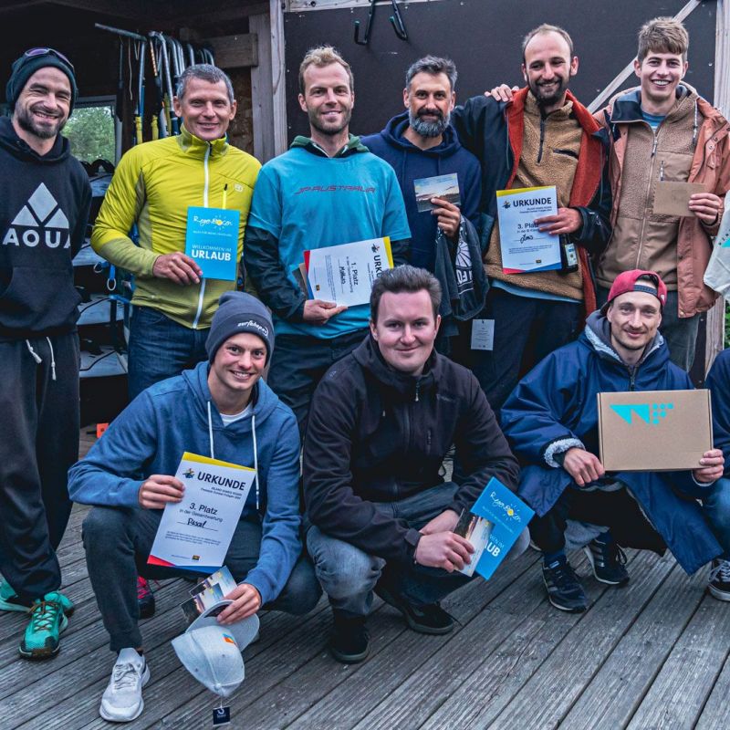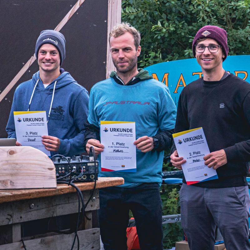 Markus Marsand auf dem Wasser. Siegerehrung nach der Double Elimination: von links Pascal Mikolajski (3.), Mathias Genkel (1.) und Markus Marsand (2.).