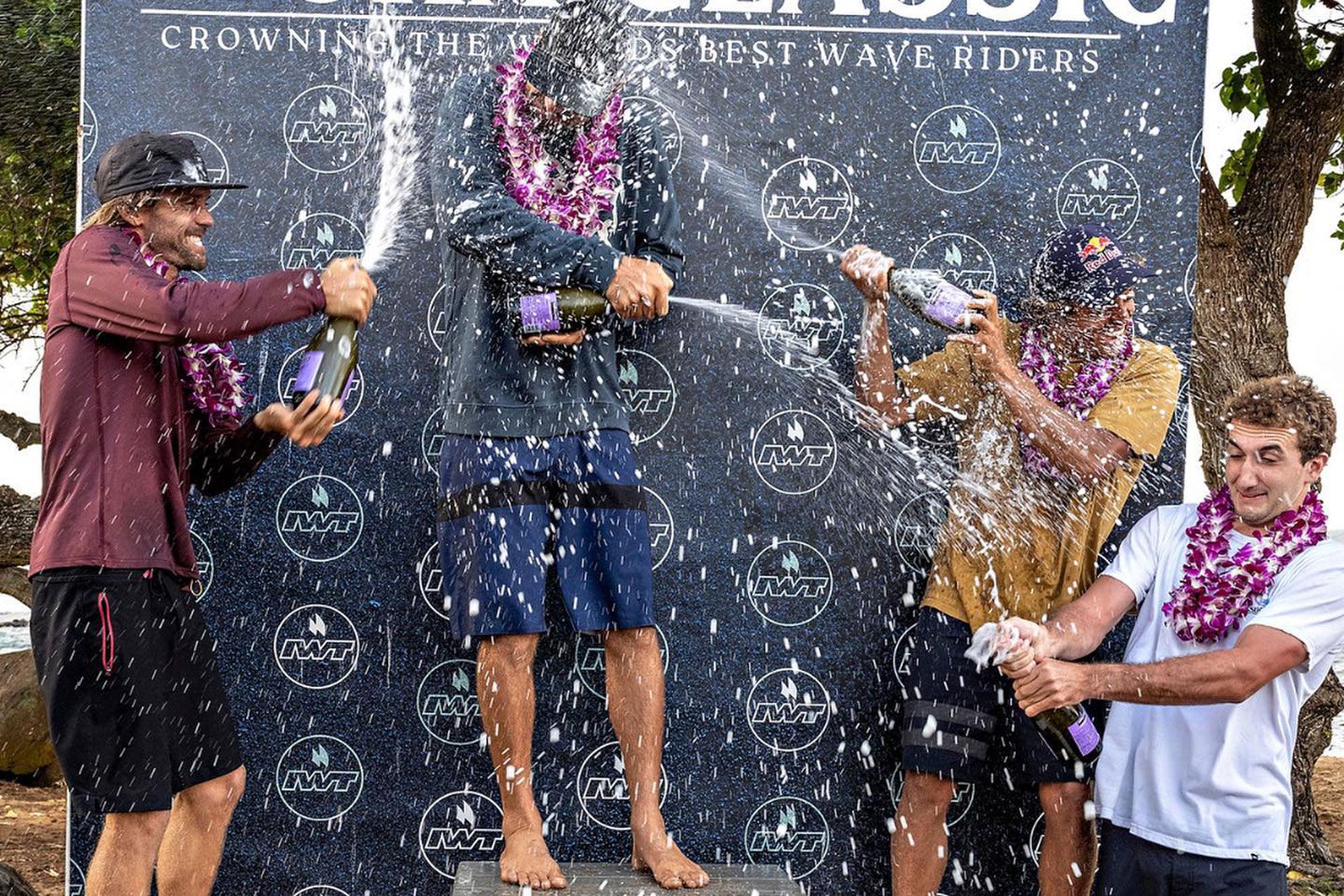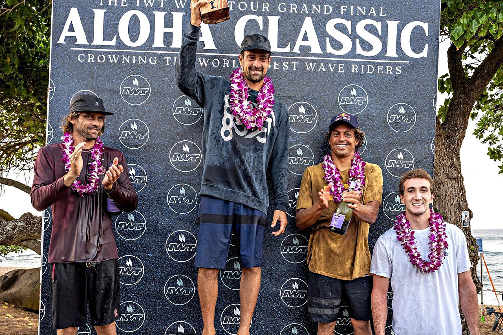 Trotz der eindrucksvollen Scores von Camille Juban, Kai Lenny und Jake Schettewi konnte an diesem Tag aber keiner mit Marcilio Browne mithalten. Auch im Finale zeigte der Brasilianer seine ganze Bandbreite und eindrucksvolle technische Routine. Hoffentlich bleibt ihm in den nächsten Wochen etwas mehr Zeit Ruhe zu finden, um seinen diesjährigen Erfolg bei der PWA Tour, den er jetzt auch noch mit dem Sieg beim Aloha Classic krönt, etwas mehr zu genießen. Die anschließende Podiumsfeier mit Champagner genoss er bereits sichtlich.