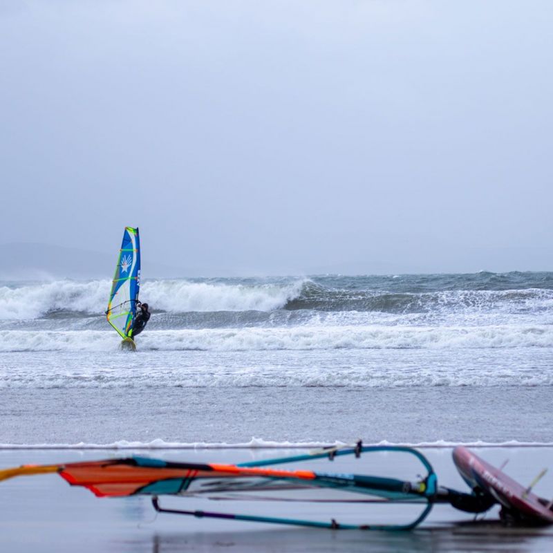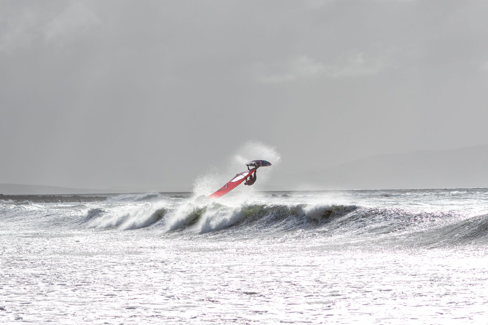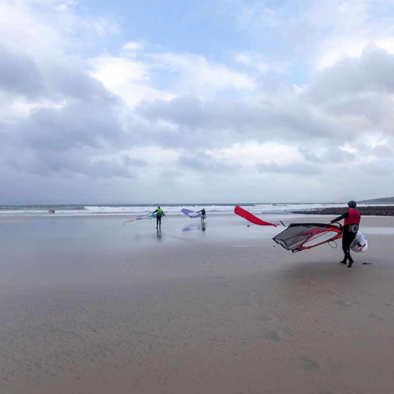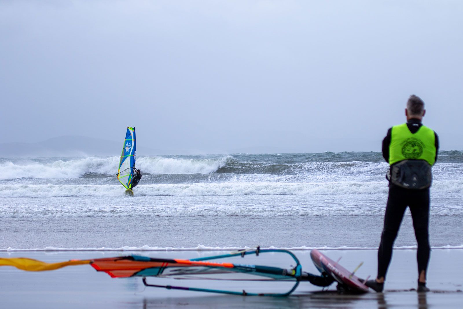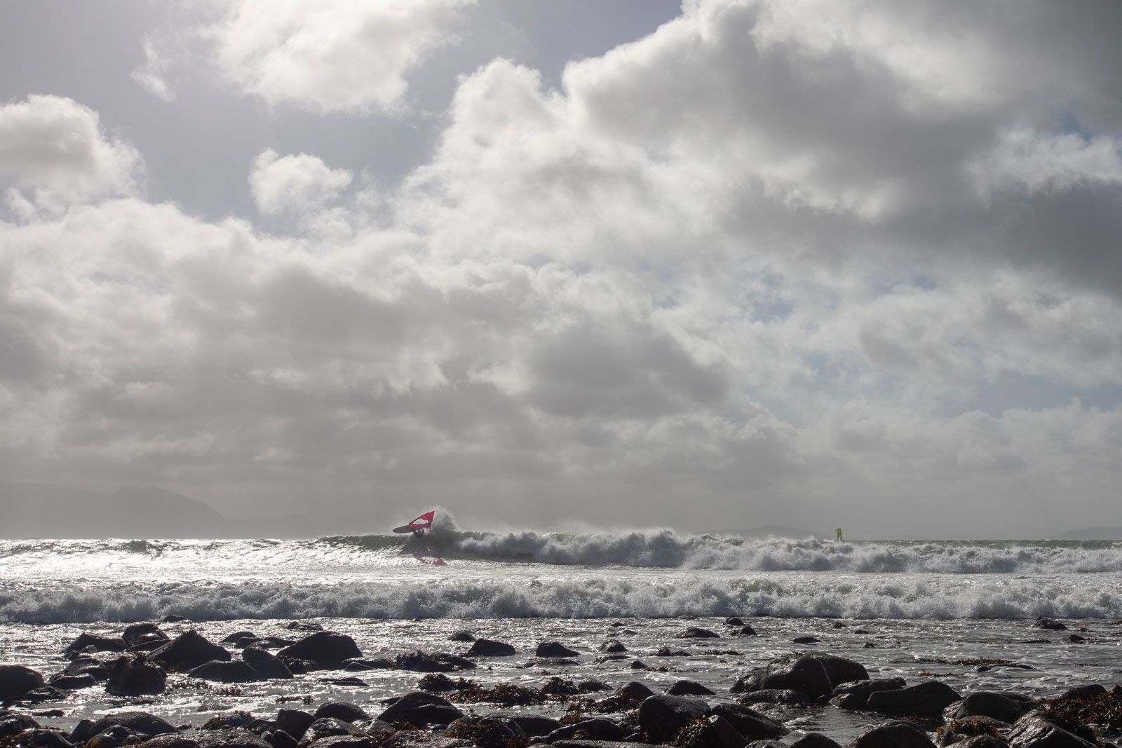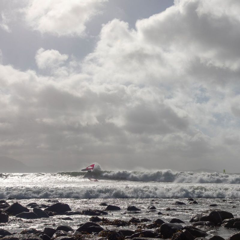 Die Entscheidung, den Event zu verschieben, zahlte sich aus. Sturm Amy fegte am Freitag mit Böen von über 80 Knoten übers Land - zu wild, um selbst die Mutigsten aufs Wasser zu bewegen. Doch am Abend erstrahlte Mulranny bei logohohen Wellen und „nur“ noch 50-Knoten-Wind. 30 Starter bereiteten sich bei einer stürmischen Aufwärmsession auf den Contest vor.