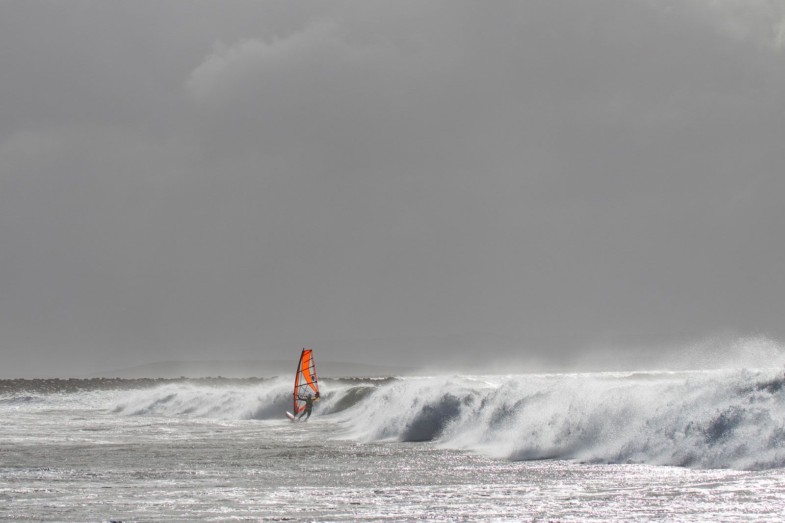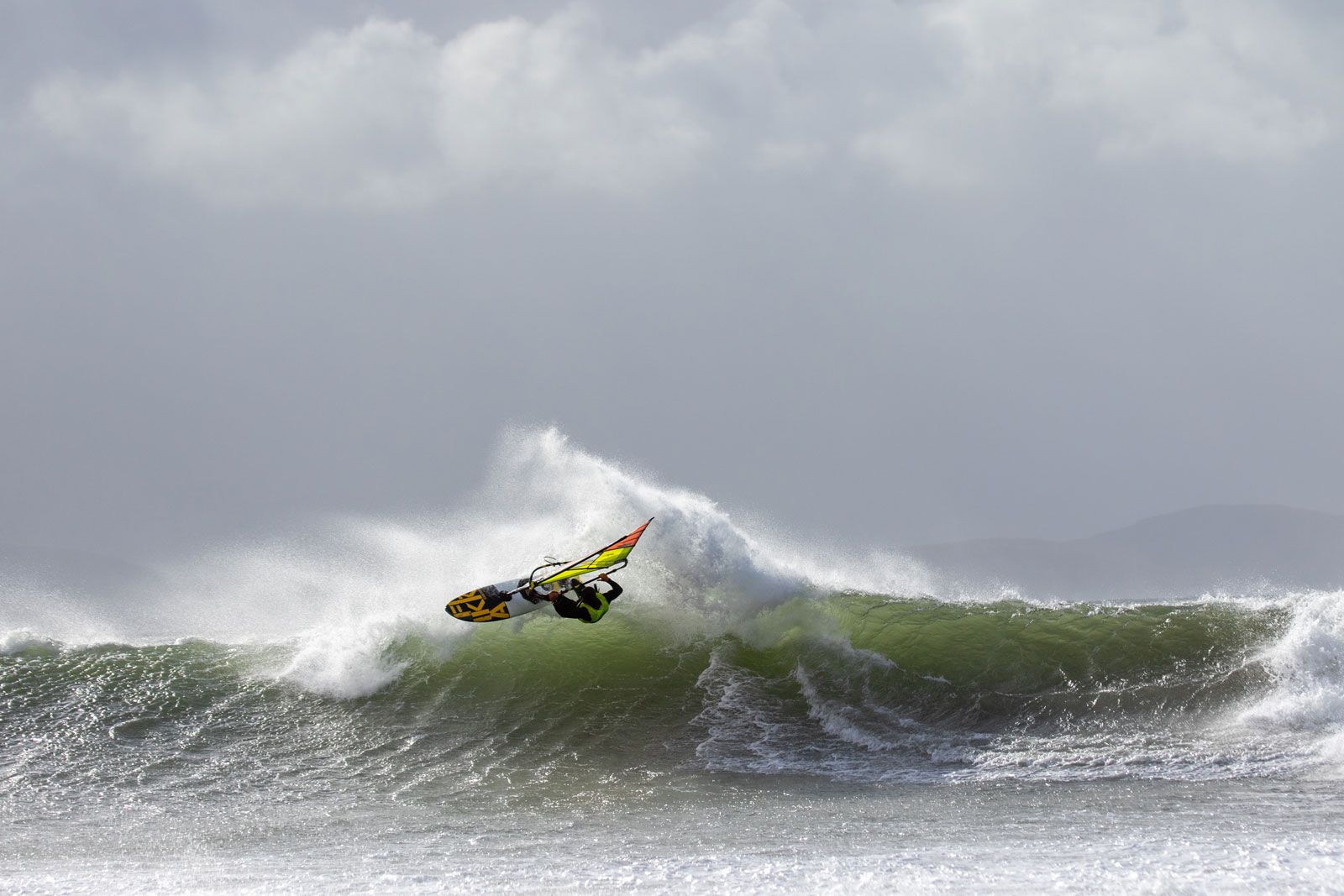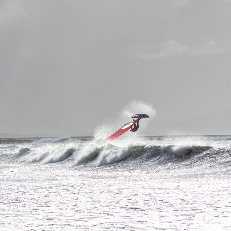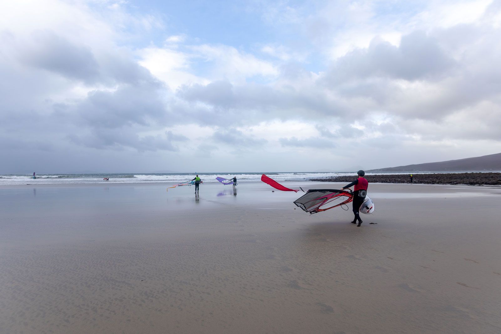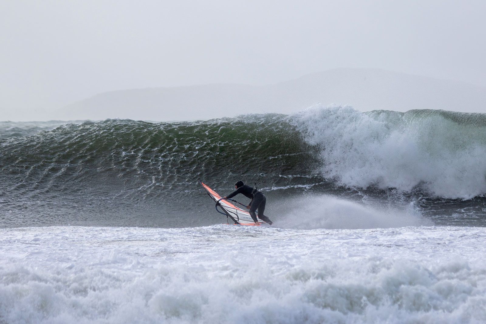 Die Entscheidung, den Event zu verschieben, zahlte sich aus. Sturm Amy fegte am Freitag mit Böen von über 80 Knoten übers Land - zu wild, um selbst die Mutigsten aufs Wasser zu bewegen. Doch am Abend erstrahlte Mulranny bei logohohen Wellen und „nur“ noch 50-Knoten-Wind. 30 Starter bereiteten sich bei einer stürmischen Aufwärmsession auf den Contest vor.