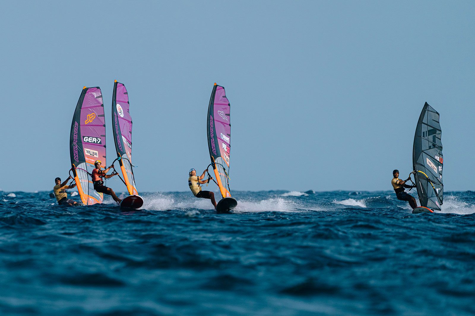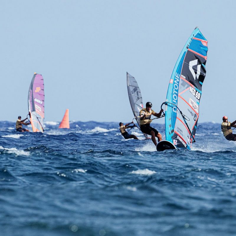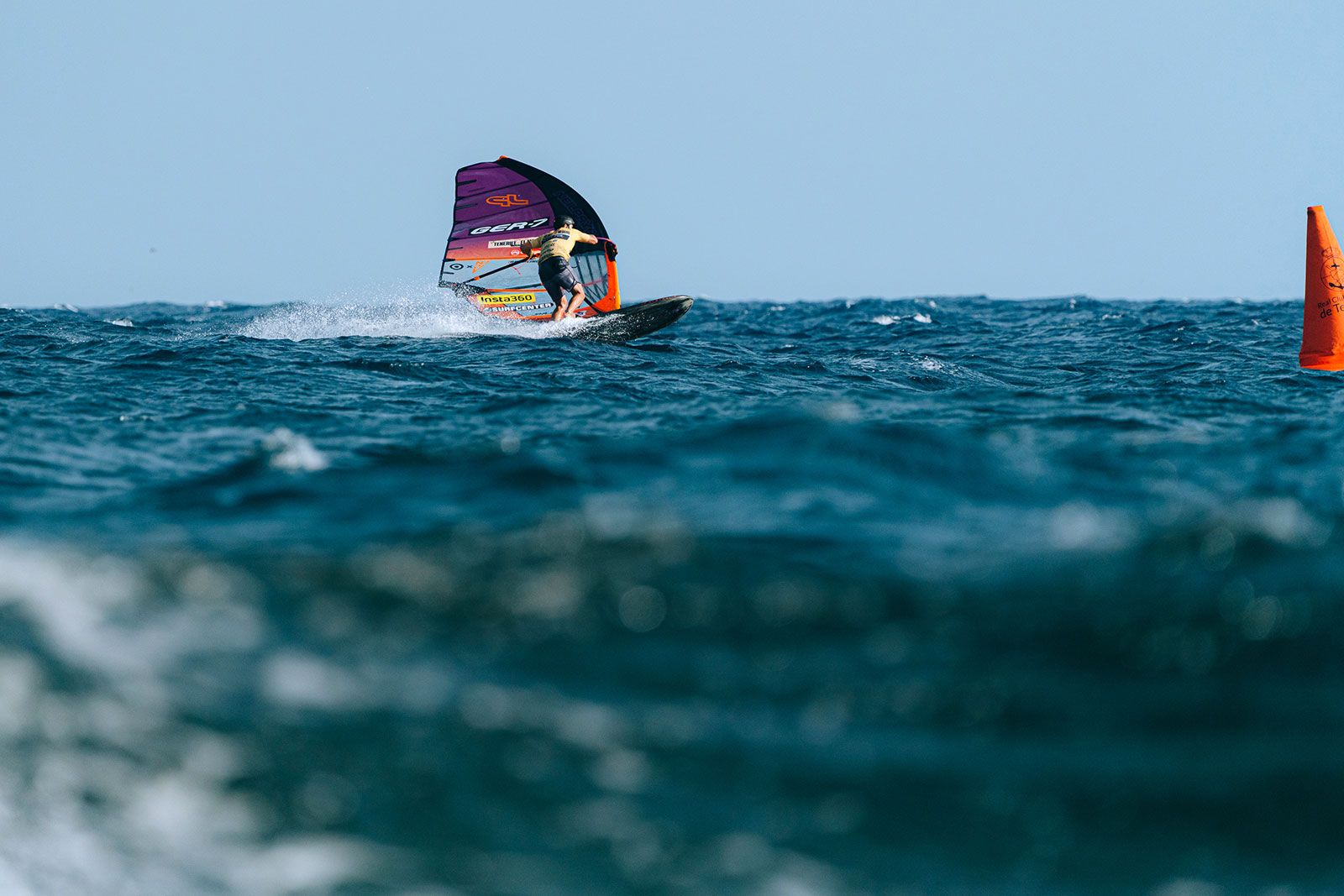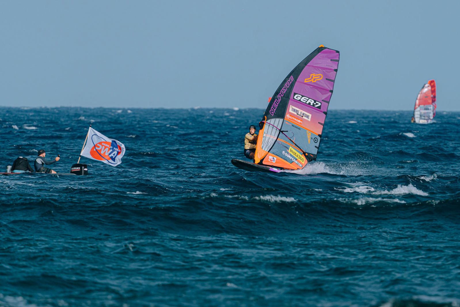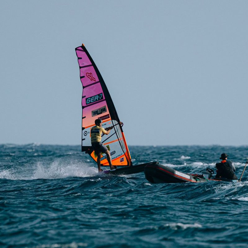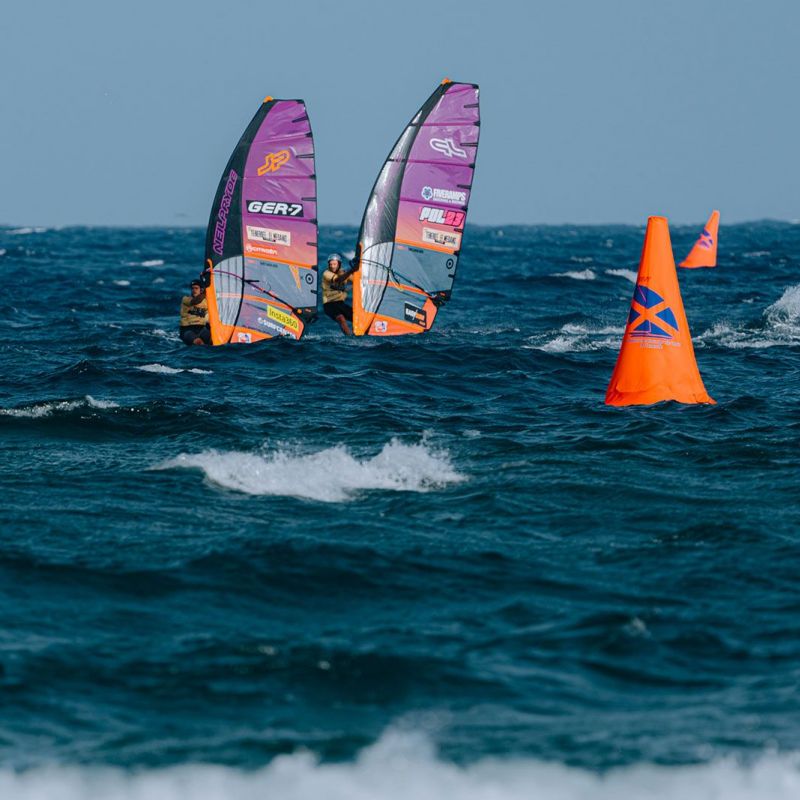 Jordy Vonk (Duotone Windsurfing) startete furios mit einem Sieg in Ausscheidung 2 und rückte kurzzeitig bis auf 1,3 Punkte an die Spitze heran. Doch ein taktischer Fehler im Halbfinale von Ausscheidung 4 kostete ihm das Finalticket - aktuell liegt er dennoch auf dem dritten Gesamtrang. Matteo Iachino (Starboard / Severne / Z Fins), Pierre Mortefons härtester Konkurrent im Titelkampf, kam mit zwei fünften und einem siebten Platz nicht über solide Resultate hinaus. Nach dem starken Auftakt fehlen dem Italiener nun 8,6 Punkte auf Mortefon - das Podium bleibt dennoch in Reichweite. Auch Maciek Rutkowski (JP / NeilPryde) musste Federn lassen: Nach einem guten Start und kurzfristiger Führung in der Gesamtwertung verlor der Pole in Ausscheidung 3 beim ersten Turn entscheidend an Boden. Mit Platz zehn und sechs fiel er auf Rang fünf zurück, punktgleich mit Matteo Iachino.