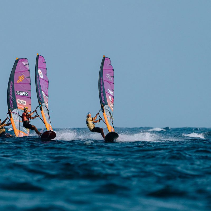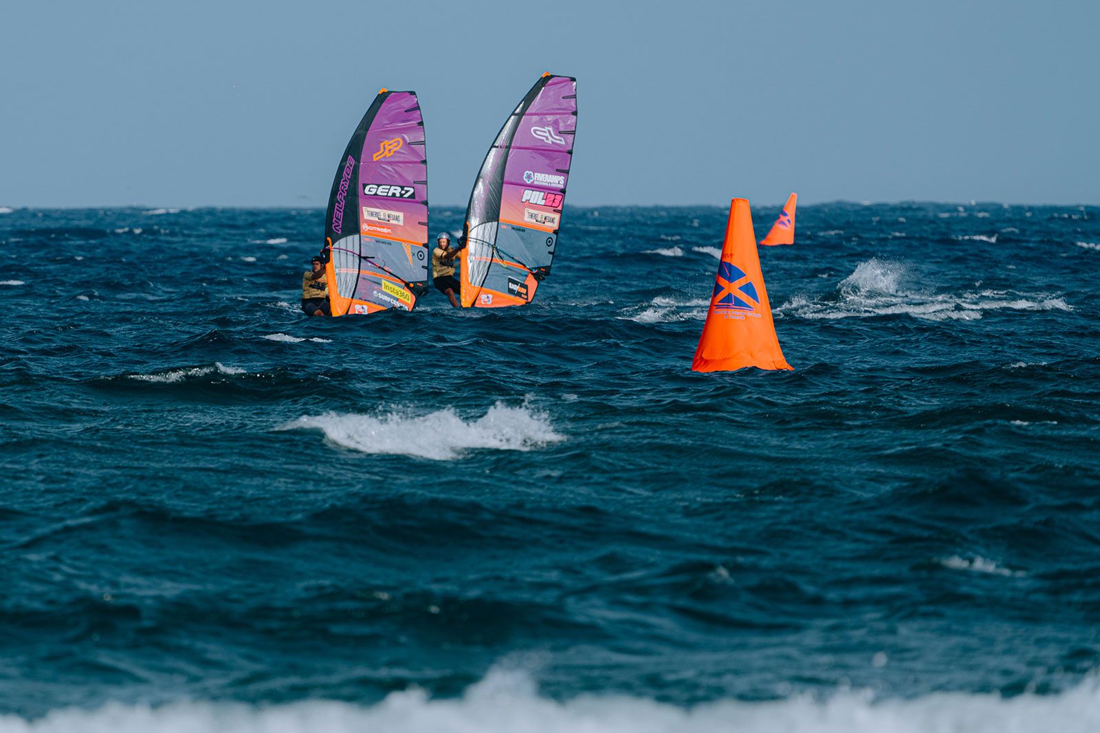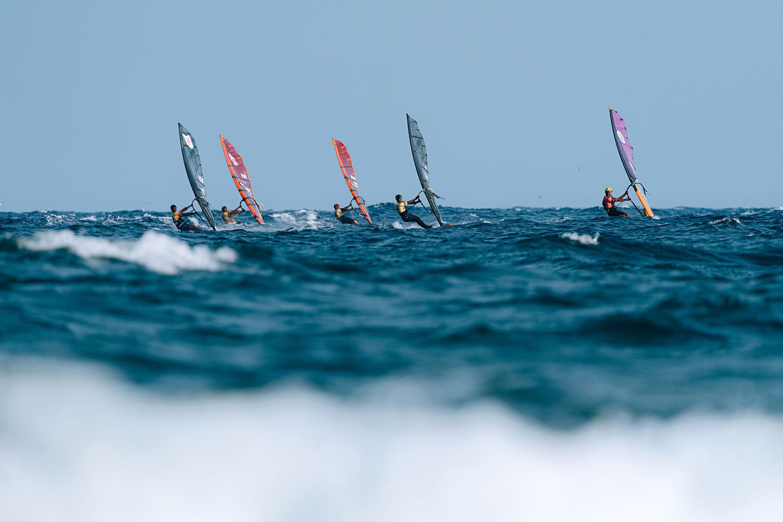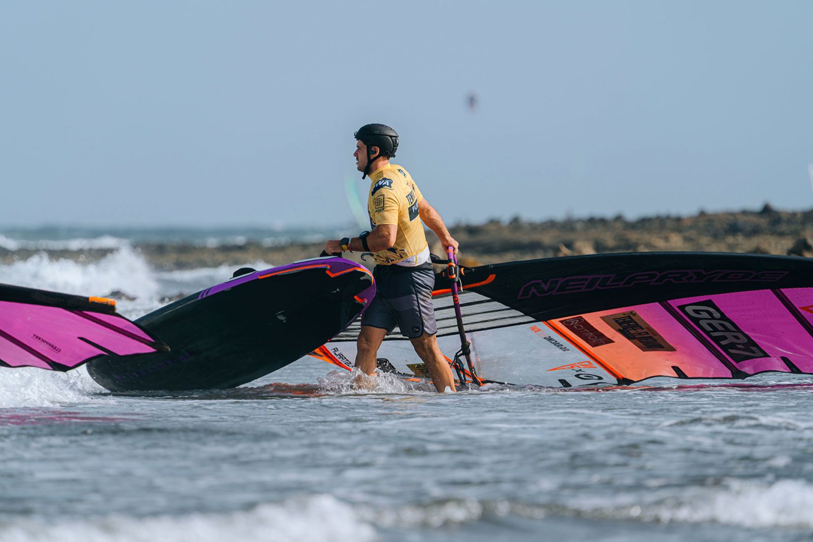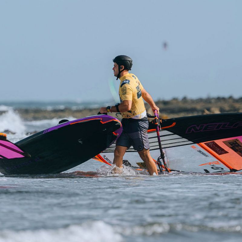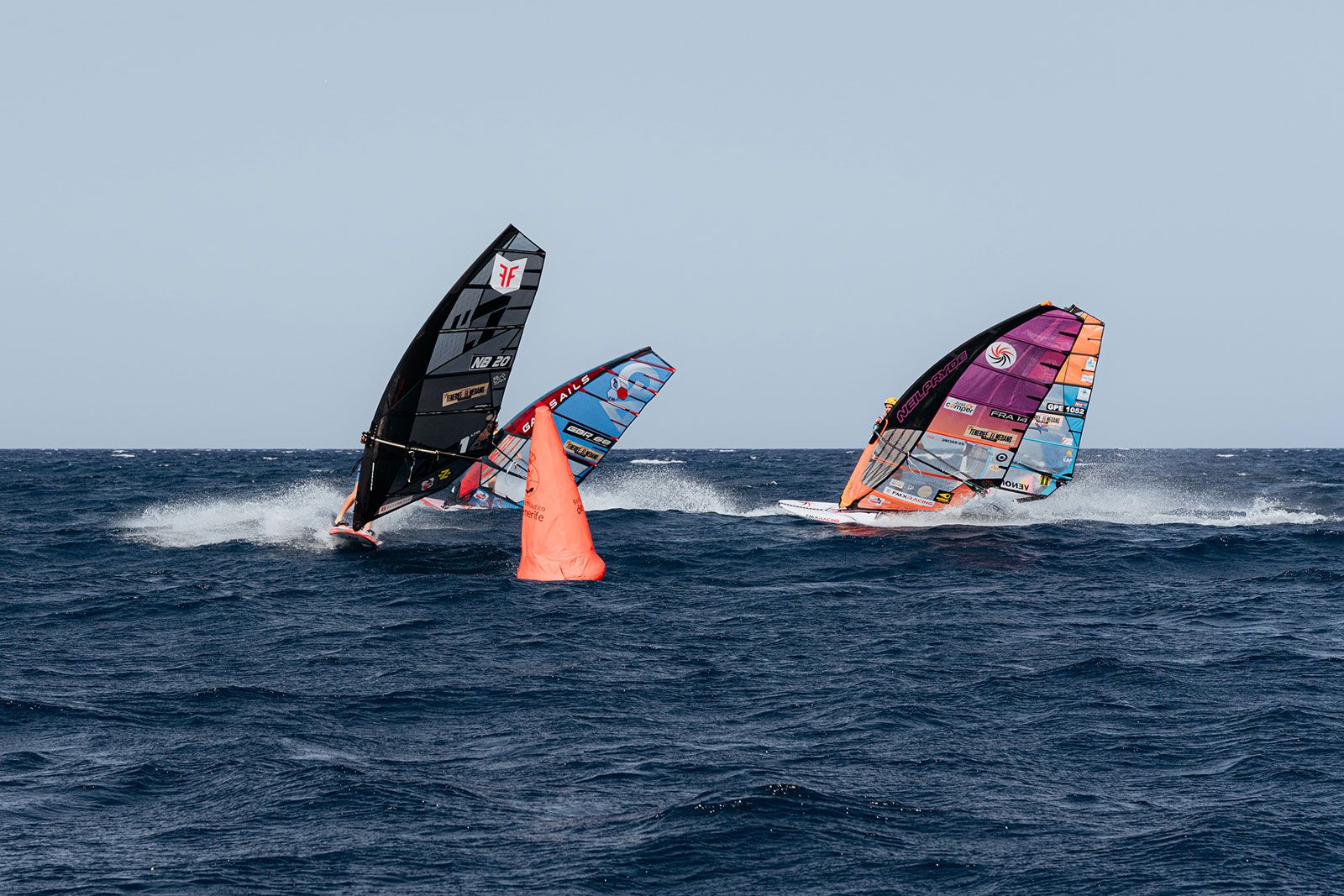 Jordy Vonk (Duotone Windsurfing) startete furios mit einem Sieg in Ausscheidung 2 und rückte kurzzeitig bis auf 1,3 Punkte an die Spitze heran. Doch ein taktischer Fehler im Halbfinale von Ausscheidung 4 kostete ihm das Finalticket - aktuell liegt er dennoch auf dem dritten Gesamtrang. Matteo Iachino (Starboard / Severne / Z Fins), Pierre Mortefons härtester Konkurrent im Titelkampf, kam mit zwei fünften und einem siebten Platz nicht über solide Resultate hinaus. Nach dem starken Auftakt fehlen dem Italiener nun 8,6 Punkte auf Mortefon - das Podium bleibt dennoch in Reichweite. Auch Maciek Rutkowski (JP / NeilPryde) musste Federn lassen: Nach einem guten Start und kurzfristiger Führung in der Gesamtwertung verlor der Pole in Ausscheidung 3 beim ersten Turn entscheidend an Boden. Mit Platz zehn und sechs fiel er auf Rang fünf zurück, punktgleich mit Matteo Iachino.