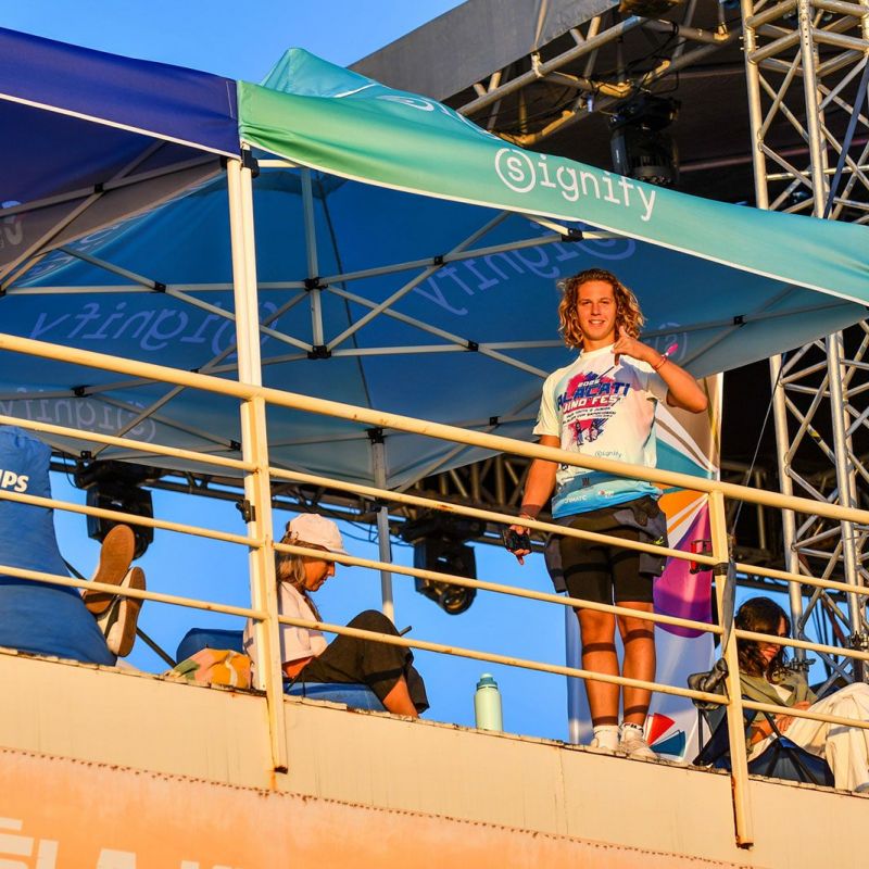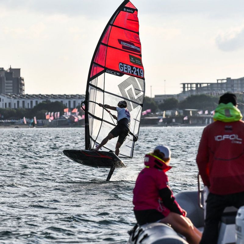 Kasper Nielsen (Duotone Windsurfing / F4 Foils) und Thijs Hanemaaijer (FMX Racing / North Sails) liegen mit je zwei Siegen gleichauf. Ein Fehler von Kasper Nielsen in der letzten Elimination bringt Thijs Hanemaaijer jedoch nach dem ersten Streichergebnis nach vier Rennen in Führung. Dahinter schied Matthijs Pos zunächst im ersten Halbfinale früh aus, belegte aber im Tagesverlauf drei zweite Plätze und liegt nun auf Rang drei. Im Mittelfeld geht es unglaublich eng zu, die Plätze vier bis neun liegen zurzeit nur 10 Punkte auseinander.