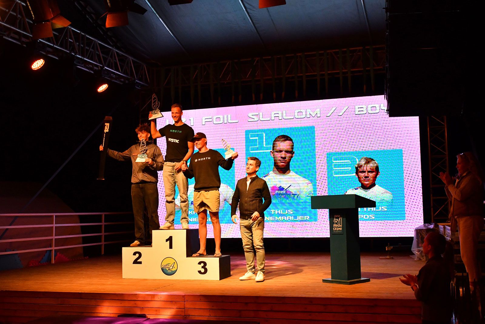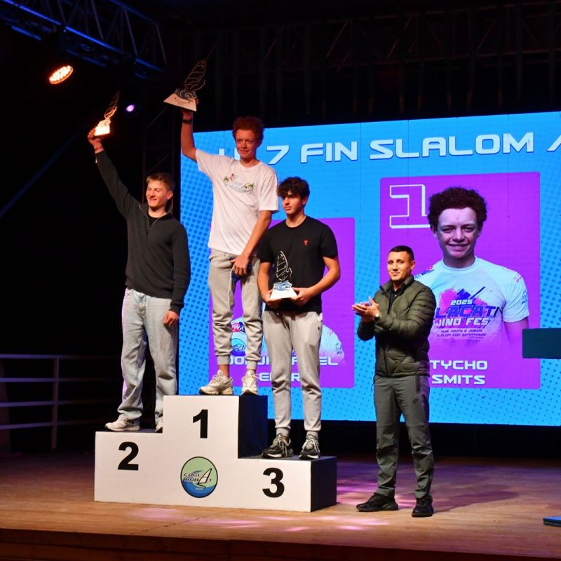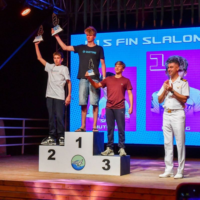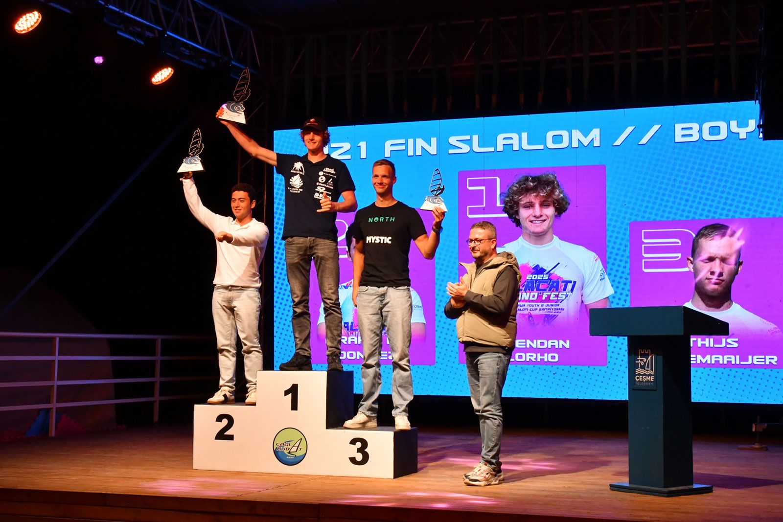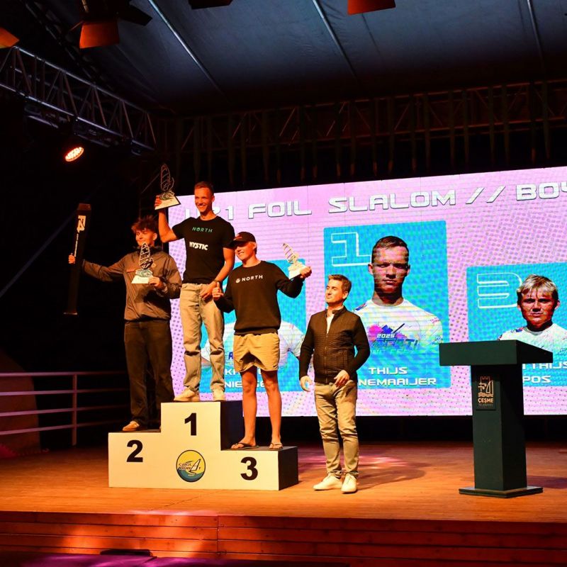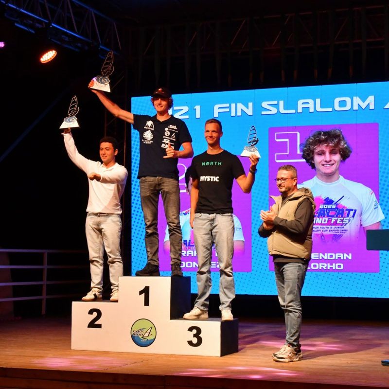 Brendan Lorho errang einen überzeugenden Sieg im ersten Rennen. Als er sich jedoch der ersten Markierung in der zweiten Elimination näherte, lag der 17-jährige Storm Nicolai (Starboard) aus Bonaire in Führung, dicht gefolgt von Thijs Hanemaaijer (FMX Racing / North Sails). Wenn Thijs Hanemaaijer diese Elimination gewinnen hätte können, hätte er seinen Eventtitel vom letzten Jahr verteidigt und hier beide Titel geholt, aber leider stürzte Storm Nicolai bei der Halse an der zweiten Markierung, sodass Thijs Hanemaaijer nicht ausweichen konnte. Brendan Lorho hingegen segelte locker an beiden vorbei und gewann die letzte Elimination, womit er in dieser Saison seinen vierten Sieg in vier Events einfährt, und - vielleicht noch beeindruckender - 42 Siege in 48 Eliminations auf der Youth Tour im Jahr 2025 für sich reklamieren kann! Er nimmt verdientermaßen die Trophäe der PWA Youth World Tour bereits vor dem Abschluss-Event in Miami in seinem letzten Jahr als Jugendlicher mit nach Haus. Da Thijs Hanemaaijer ausschied, konnte der Lokalmatador Ibrahim Ali Donmez (Duotone Windsurfing) in der zweiten Elimination den zweiten Platz belegen und dem jungen Niederländer damit auch den zweiten Platz auf dem Podium wegschnappen.