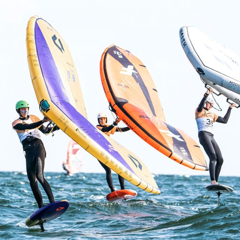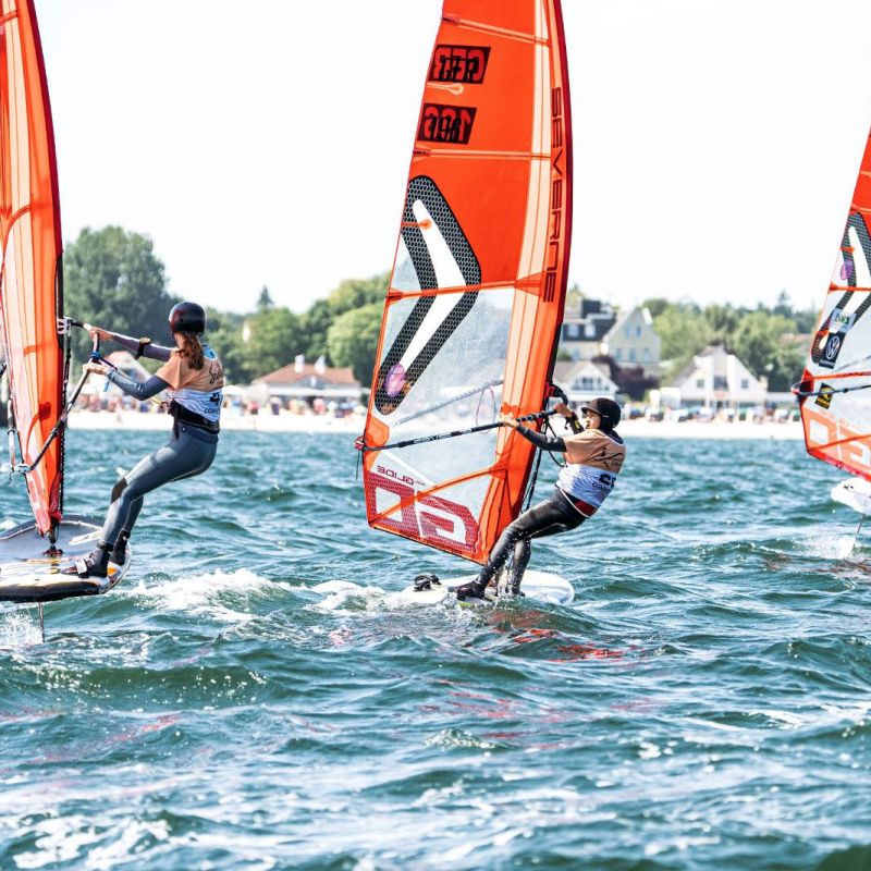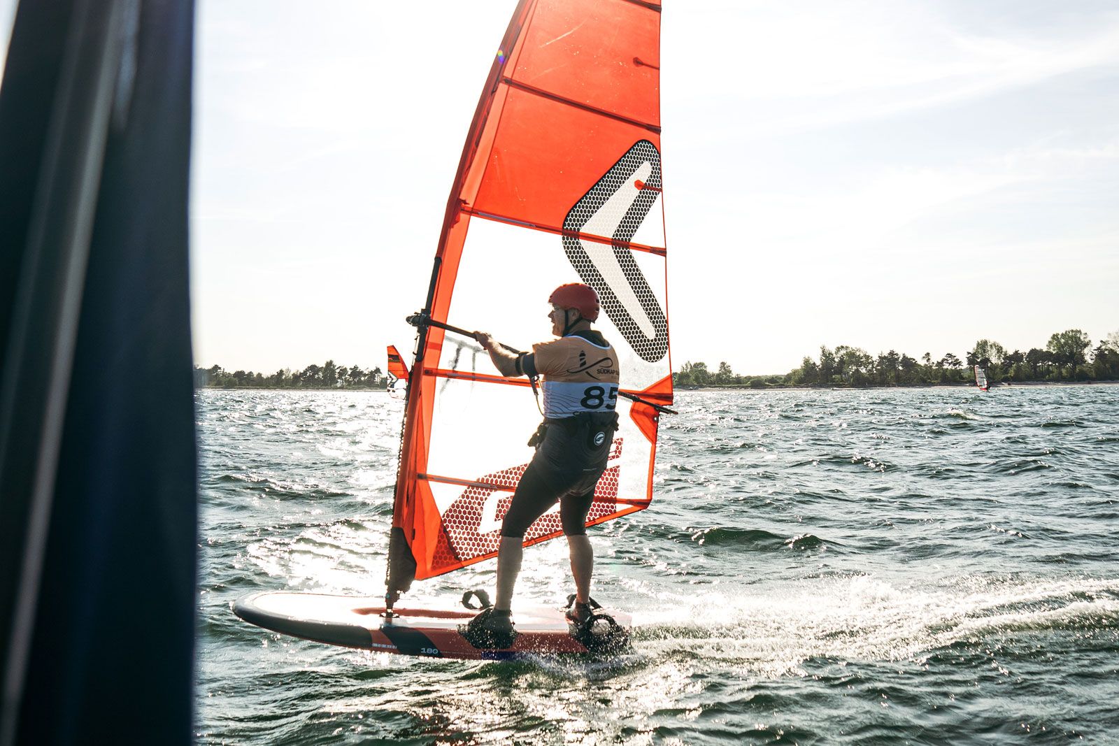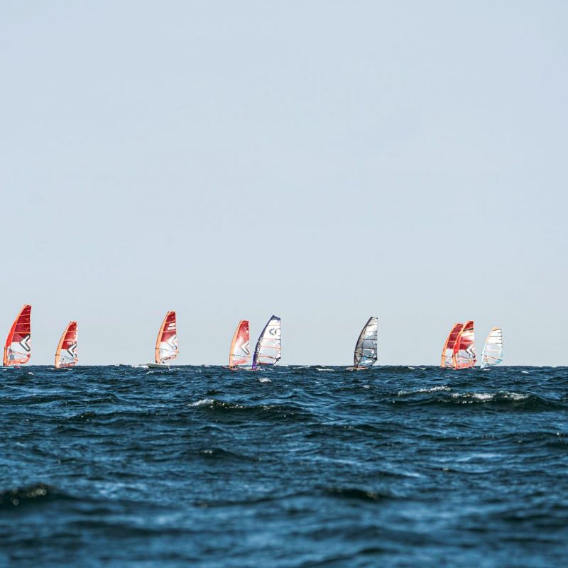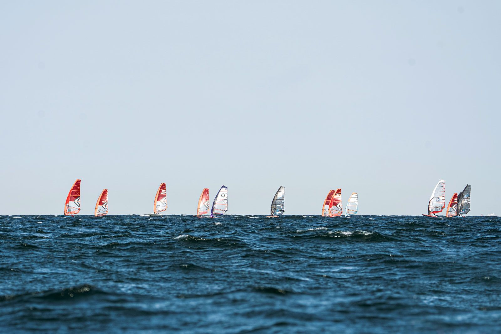 Der erste Wettfahrtag begann zunächst mit einem „get together“ an Land, da der Wind noch nicht für offizielle Wettfahrten ausreichte. Doch es musste nicht lange gewartet werden, bis der Wind früher und stärker als vorhergesagt einsetzte. Gestartet wurde zuerst mit den Windfoilerinnen und Windfoilern, die mit 27 Startplätzen ein gewohnt großes Feld darstellten.