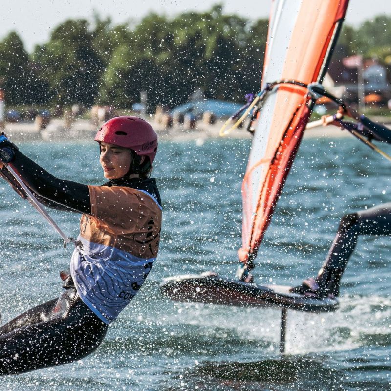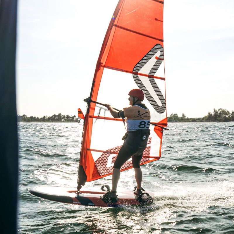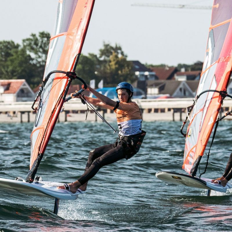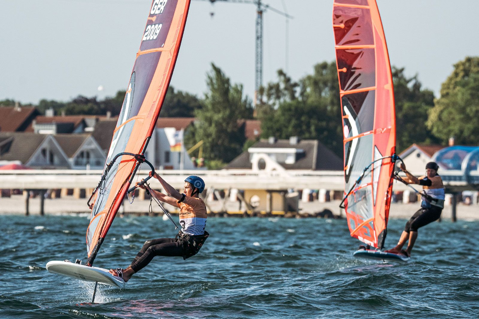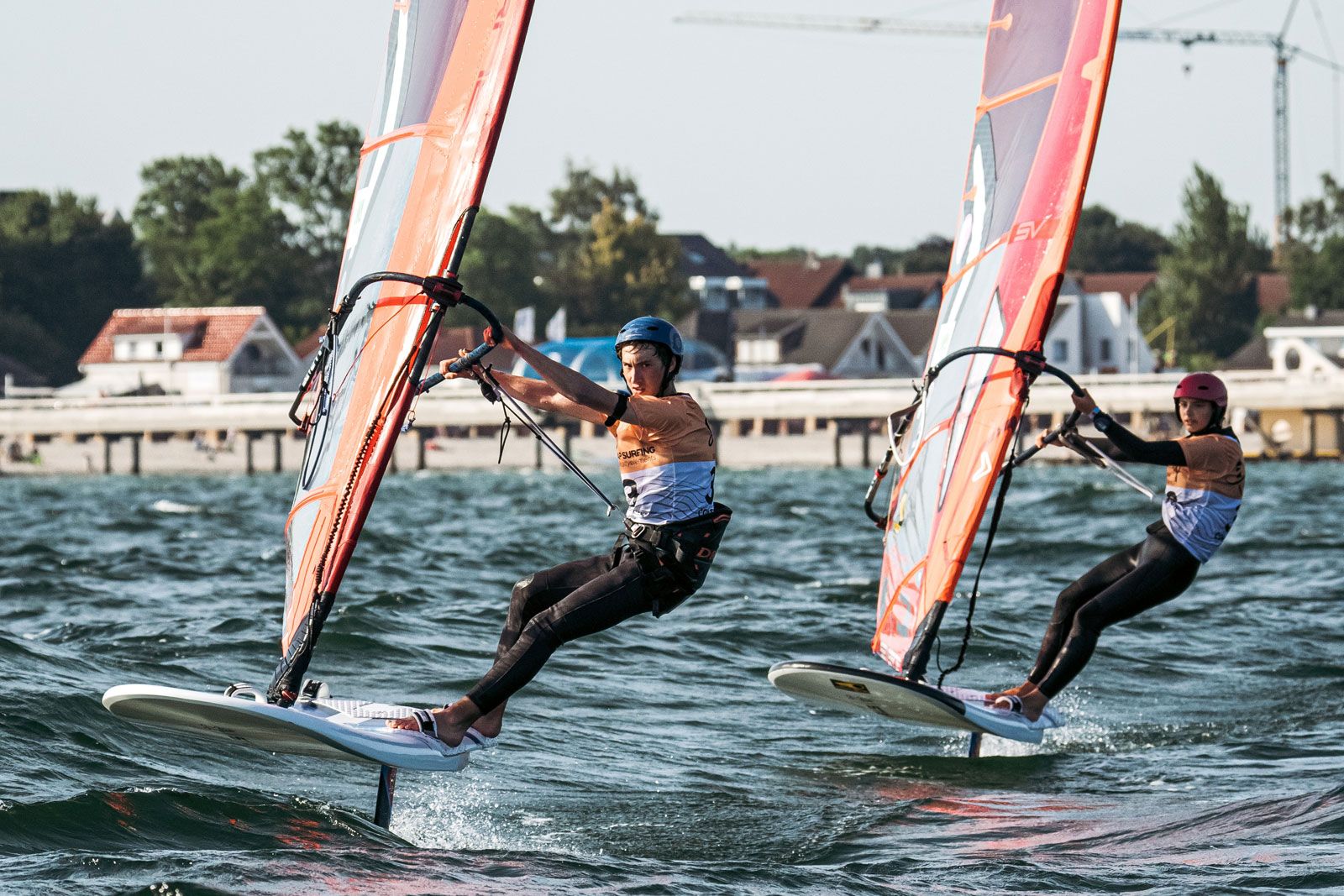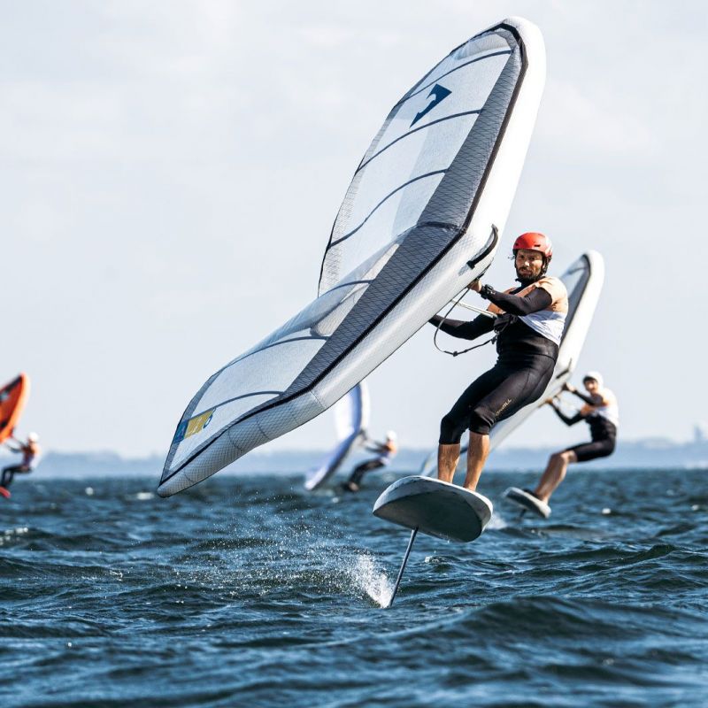 Der erste Wettfahrtag begann zunächst mit einem „get together“ an Land, da der Wind noch nicht für offizielle Wettfahrten ausreichte. Doch es musste nicht lange gewartet werden, bis der Wind früher und stärker als vorhergesagt einsetzte. Gestartet wurde zuerst mit den Windfoilerinnen und Windfoilern, die mit 27 Startplätzen ein gewohnt großes Feld darstellten.