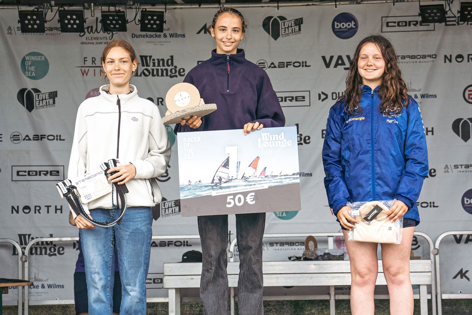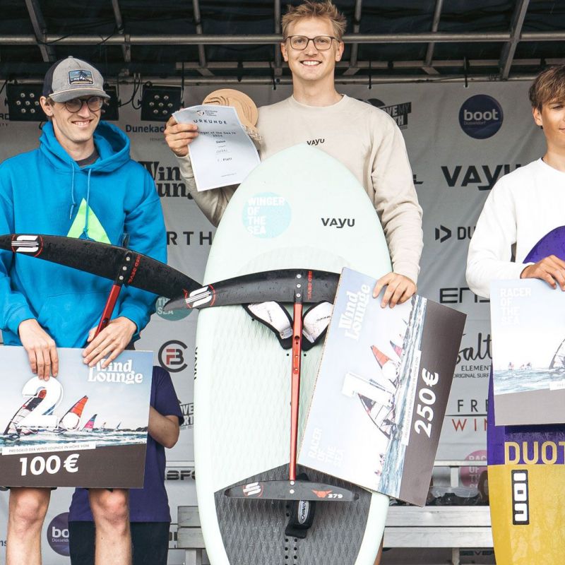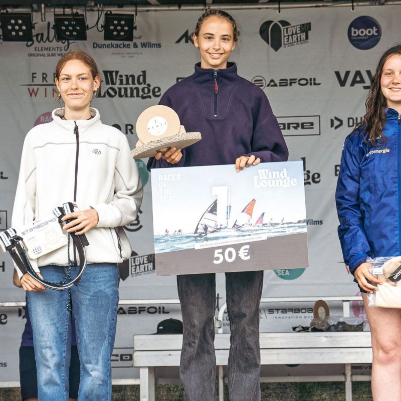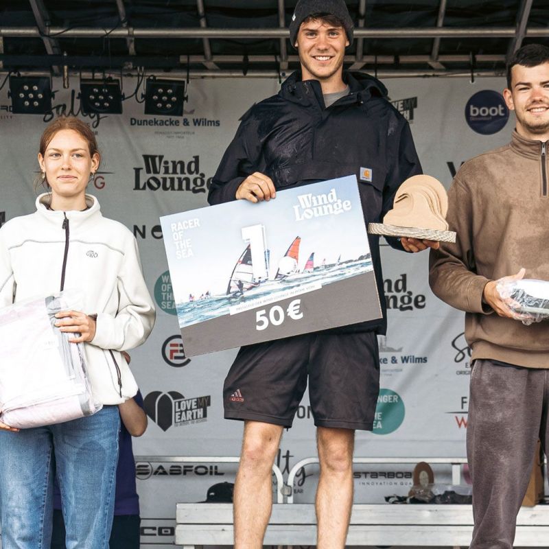 Der zweite Tag zeigte dann nochmal all denjenigen, die außerhalb von Schleswig-Holstein angereist waren, was ein echter norddeutscher Sommer ist. Regenschauer und zu wenig Wind bedeuteten zunächst Startverschiebung. Da der Regen leider nicht abnahm und der Wind nicht ausreichte, wurde gemeinschaftlich beschlossen die Siegerehrung ein wenig vorzuziehen und die Siegerinnen und Sieger der 11. Auflage der Einstiegsregatta Racer of the Sea zu küren. Bei der Siegerehrung gab es neben diversen Sachpreisen auch wieder ein Preisgeld in der Höhe von 1.001 €, das vom Online Surfshop Wind Lounge bereitgestellt wurde.