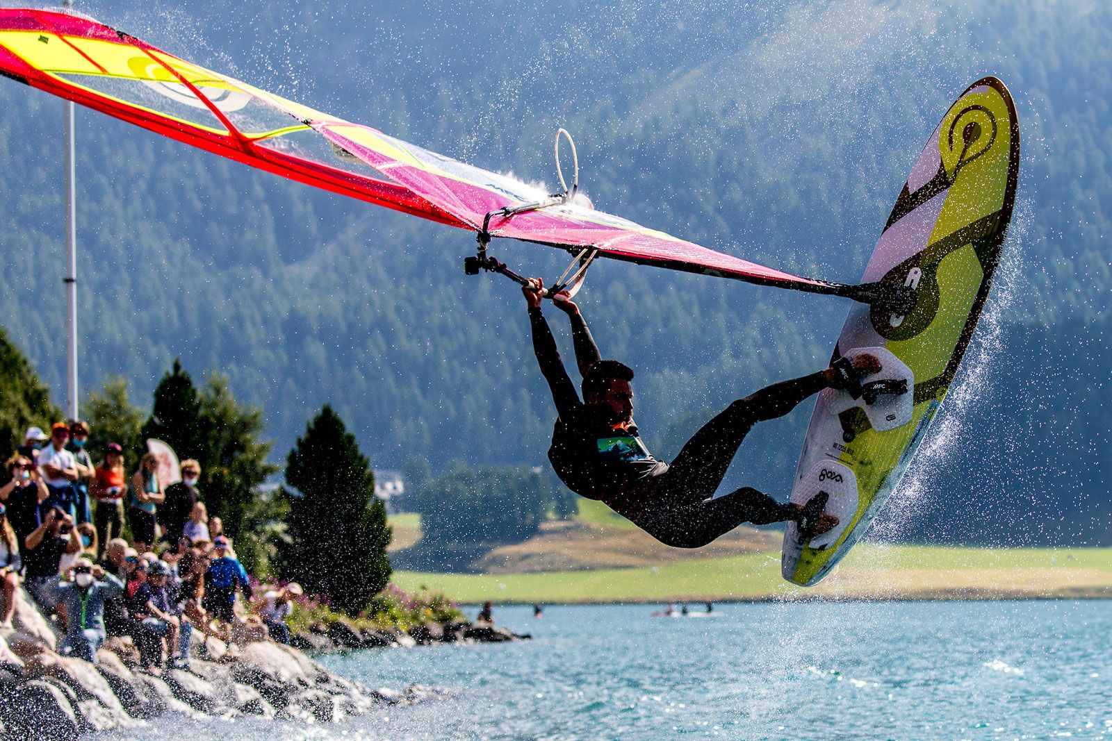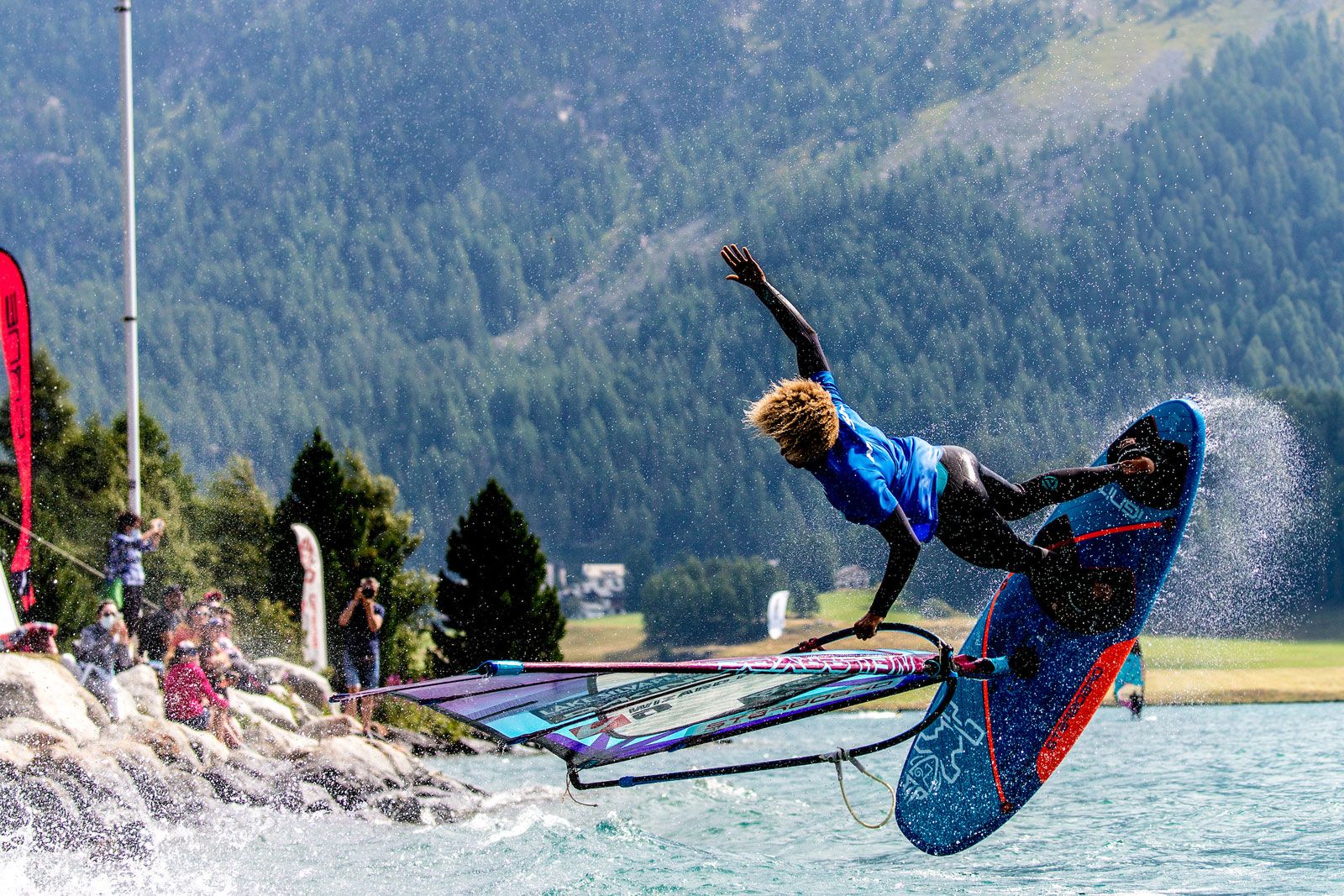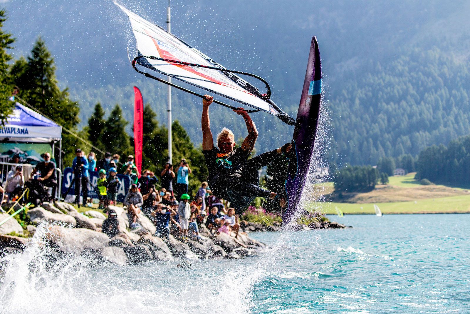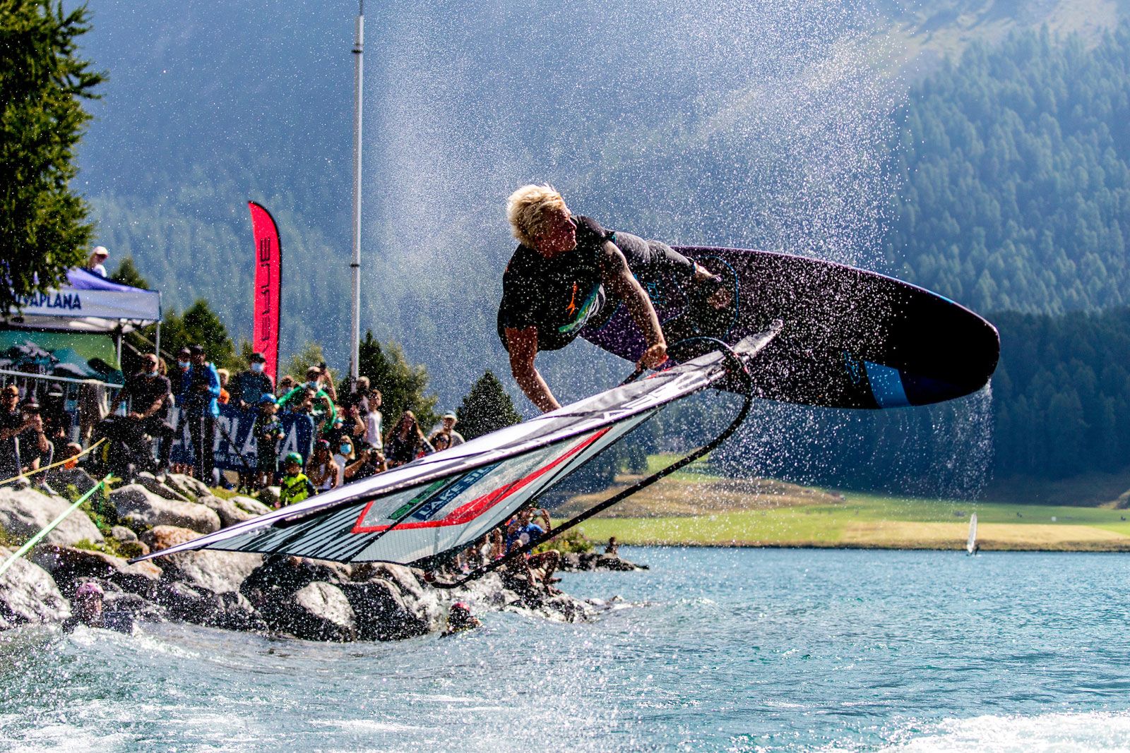 Ein Move-Feuerwerk auf 1800 Metern Höhe! Die Action beim Tow-in Freestyle wird jedes Jahr atemberaubender - im Engadin tut die alpine Kulisse ihr übriges.