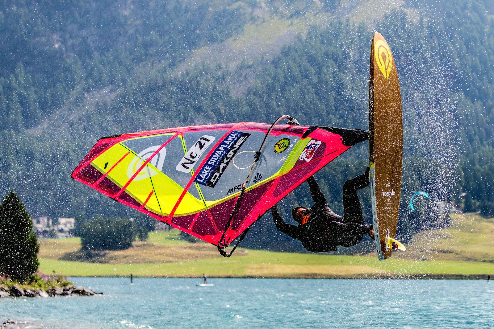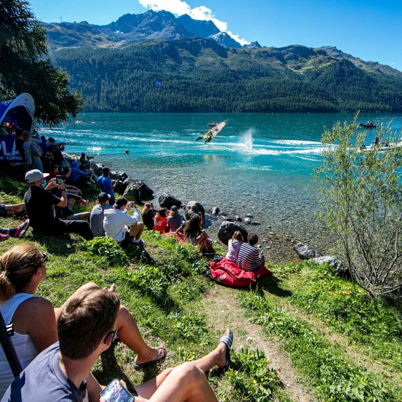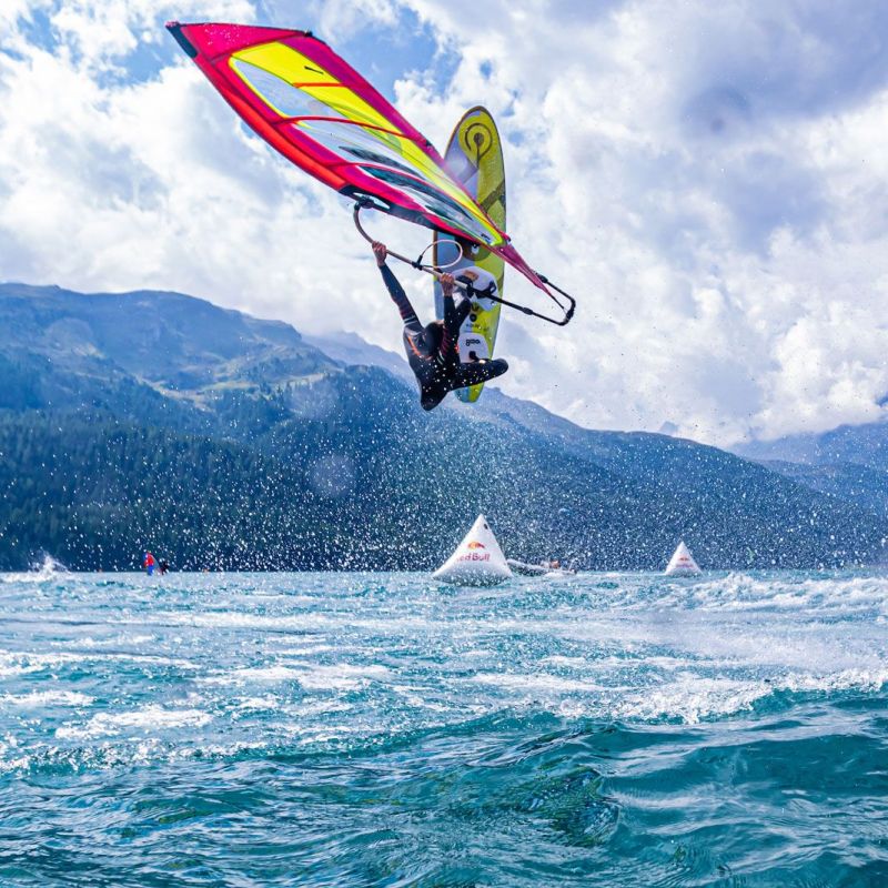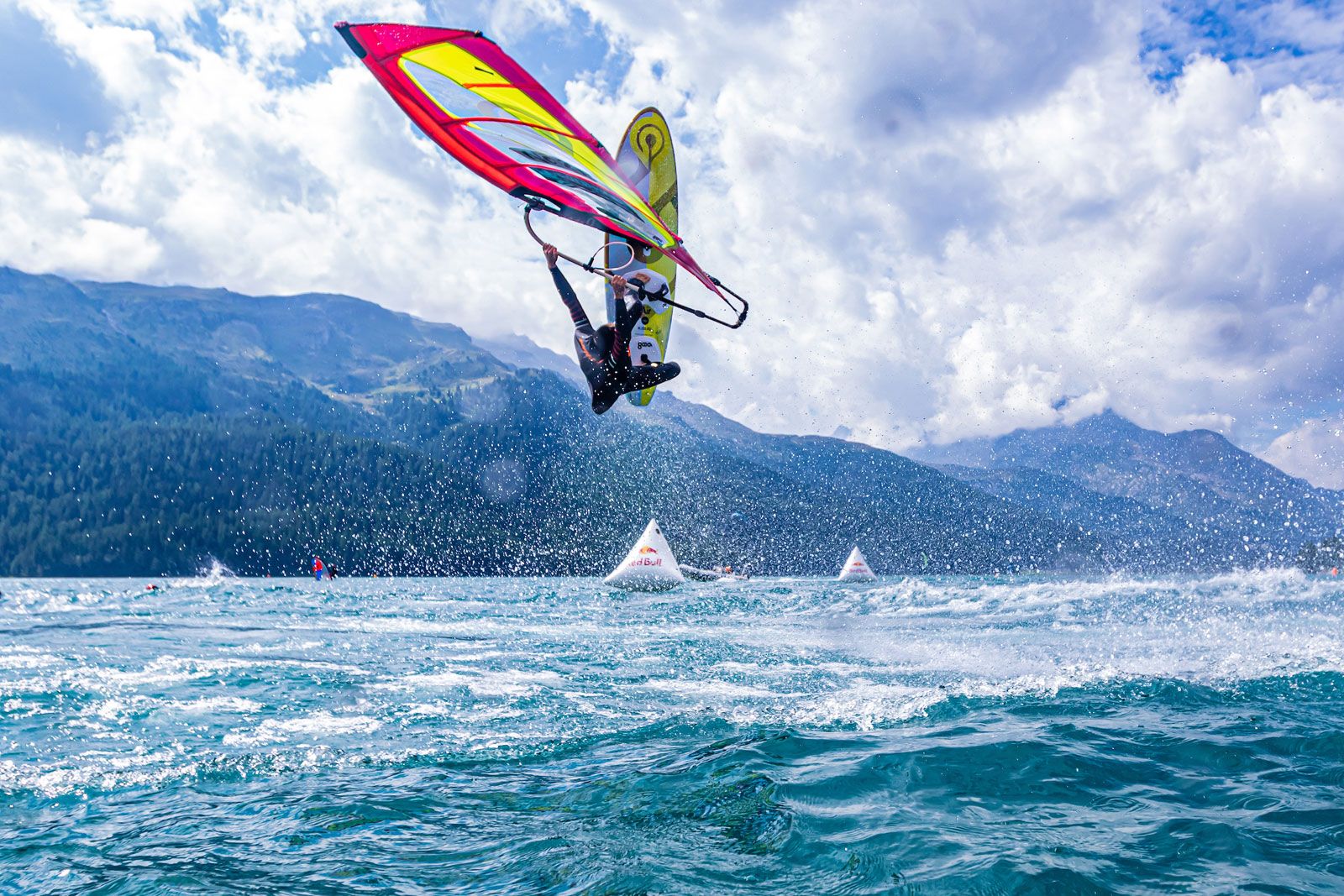 Ein Move-Feuerwerk auf 1800 Metern Höhe! Die Action beim Tow-in Freestyle wird jedes Jahr atemberaubender - im Engadin tut die alpine Kulisse ihr übriges.