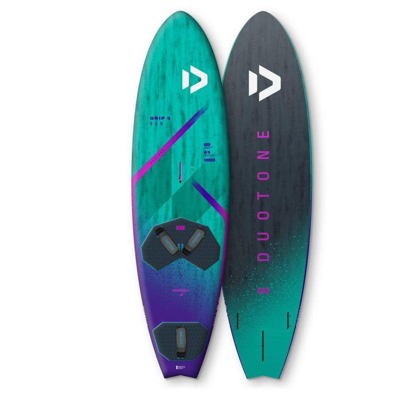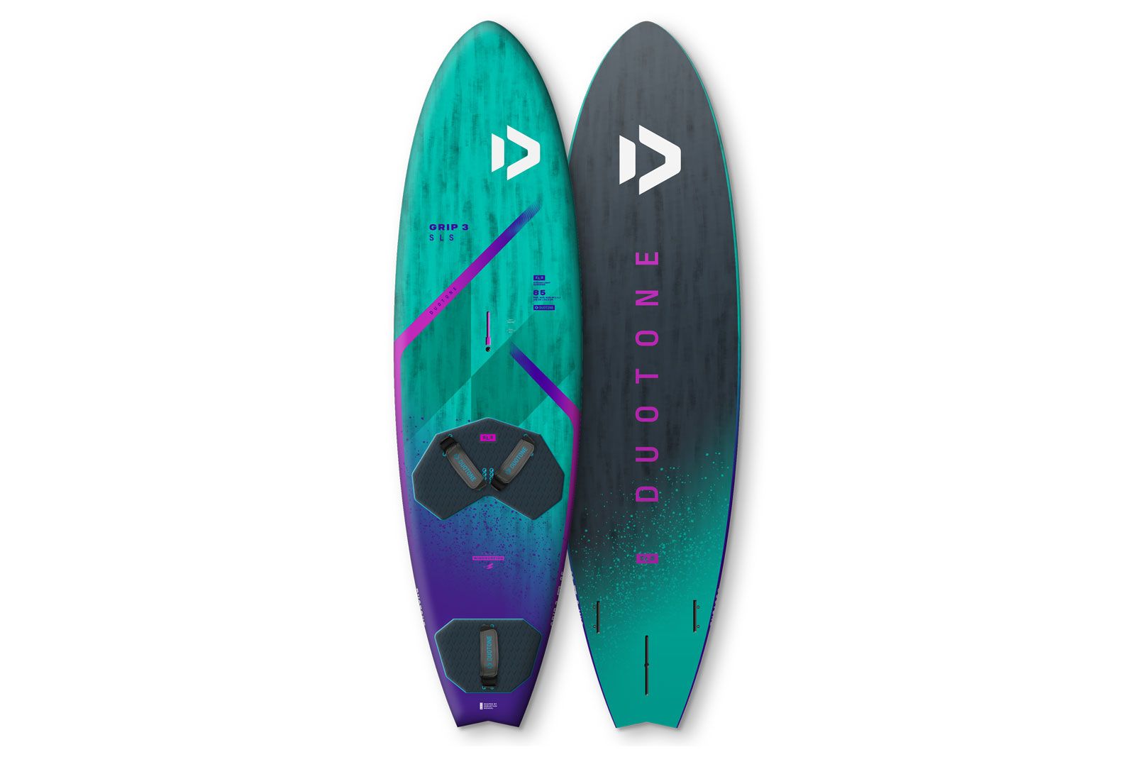 Wie im Vorjahr wird der Grip von Duotone als reiner Quad- oder Thruster-Shape angeboten. Der Grip 3 SLS soll sich im Vergleich zur Quad-Finnenkonfiguration des Grip 4 durch eine etwas bessere Beschleunigung auszeichnen, die extrem effiziente Scoop-Rocker Linie selbst in nicht idealen Bedingungen einen schnelleren Tail-Release ermöglichen. Der Tri-Fin-Shape ist ca. 6 cm kürzer als der Grip 4 bei sehr ähnlicher maximaler Breite. Der verbreiterte Bug- und Heckbereich führt beim Thruster zu einer erkennbaren paralleleren Rail-Outline im mittleren Boardsegment.