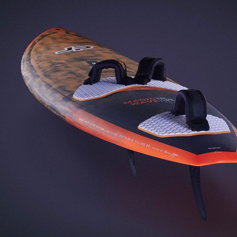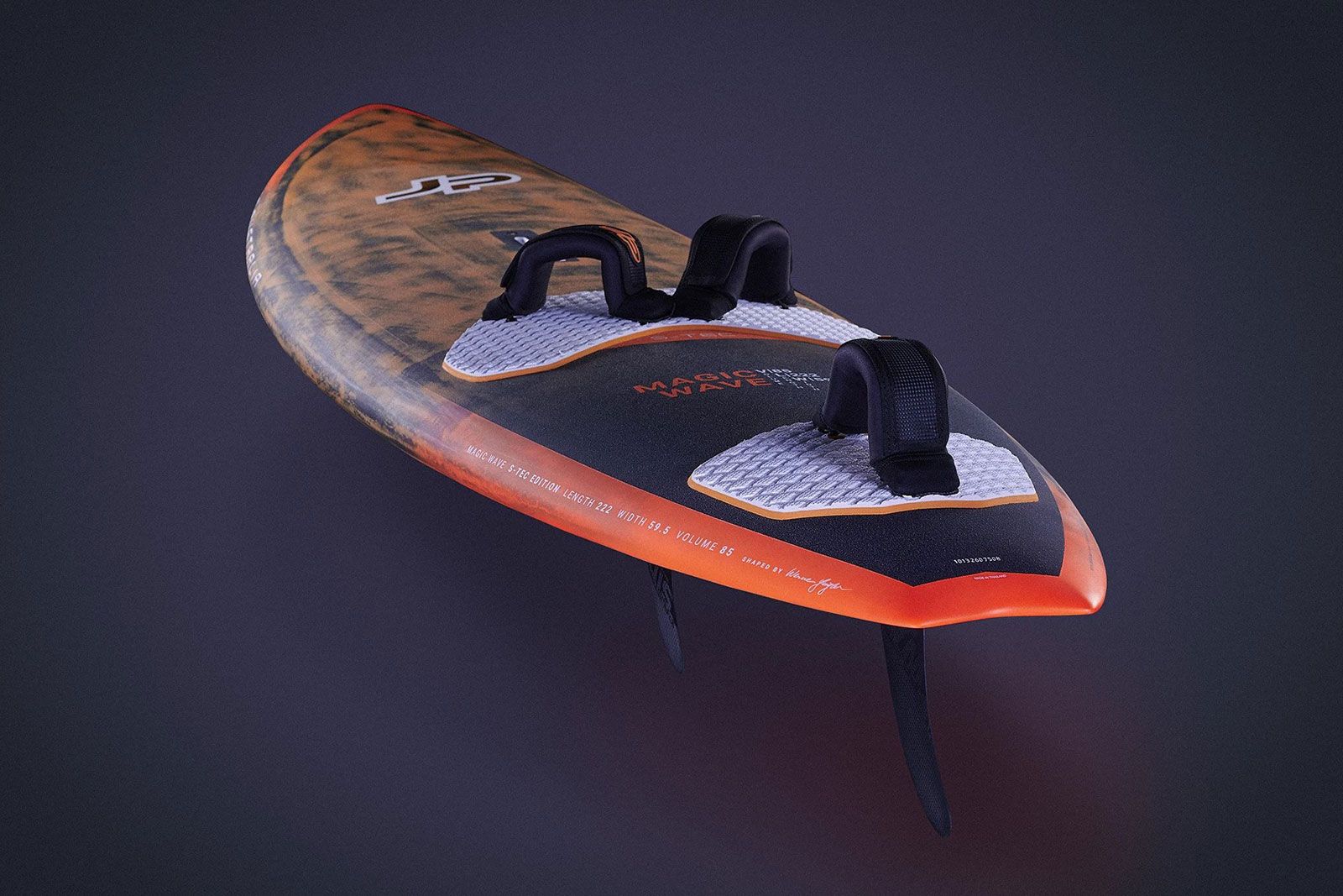 JP's Mastermind hat dazu die Outline des Magic Wave grundlegend überarbeitet und eine neue Balance zwischen Kontrolle und Wendigkeit geschaffen. Ein breiteres Heck mit dem bekannten Swallow Tail verbessert das frühe Angleiten und erhöht die Manövrierfähigkeit, insbesondere bei radikalen Turns in kleineren Wellen. Eine etwas schmalere Nose soll für mehr Präzision sorgen, ohne die Gesamtstabilität zu beeinträchtigen. Auch die optimale Balance im Wasser stand im Fokus des Designs und soll den Fahrern helfen, Weißwasser leichter zu durchfahren und schneller ins Gleiten zu kommen, selbst unter schwierigen Bedingungen. Ein zentralerer Balancepunkt soll schnellere Rotationen und radikalere Übergänge auf der Welle ermöglichen. Durch die weiter hinten positionierte Stance ermöglicht das Board kraftvolle Turns über den hinteren Fuß bei gleichzeitig außergewöhnlicher Kontrolle. Die parallelere Tail-Outline sorgt für mehr Grip und Präzision und unterstützt sowohl den Kanteneinsatz im Wellental wie den Cutback auf der Lippe.