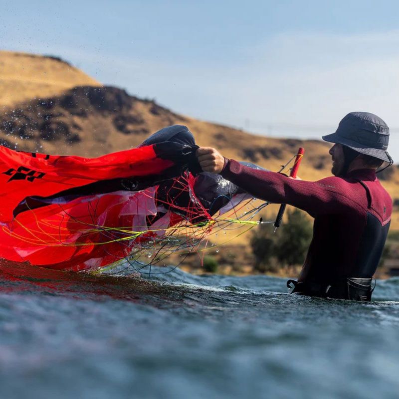 Der Parawing soll seine Vorzüge insbesondere durch seine Amwind-Eigenschaften ausspielen und dabei angenehm in der Hand liegen. „Das Profil verhindert ein Zusammenklappen, egal ob du in Böen depowerst oder hart gegen den Wind ankämpfst“, heißt es bei Naish. Laut Ewan Jaspan war die sorgfältige Optimierung des Vorderkantenprofils und der Flügelenden der Schlüssel dazu, um diese Flugeigenschaften sicherzustellen. Aus Designerperspektive bedeutet dies, dass die Steuerung hauptsächlich über die hinteren Leinen erfolgen können sollte. Durch Drehen des unteren Teils der Bar soll der Schirm intuitiv reagieren, ohne dass übertriebene Bewegungen oder ständige Korrekturen nötig sind. Das Kreuzwaagensystem spielt dabei ebenfalls eine wichtige Rolle. Ewan Jaspan merkt an, dass dies verhindere, dass sich der Flügel beim Pumpen „wie eine Ziehharmonika zusammenfalte“, was dazu beitrüge, das Kraft und Effizienz beim Versuch, auf den Tragflügel zu gelangen, optimal aufrechterhalten werden könne.