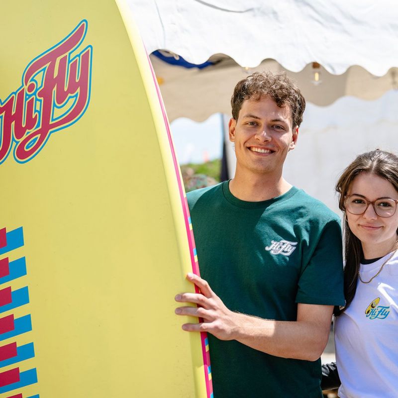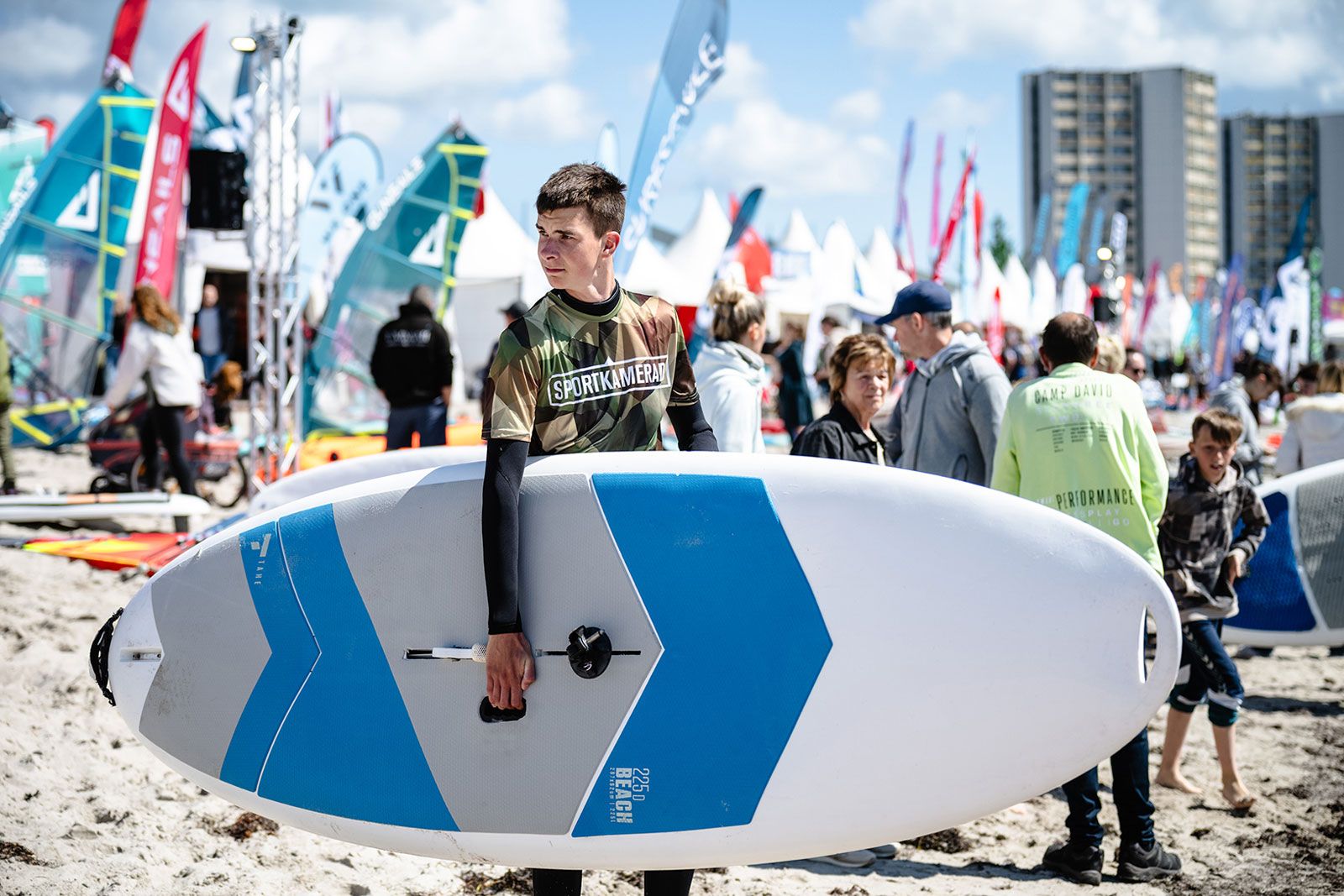 Nur wenige Meter vom Wasser entfernt entsteht während des Festivals ein großes Beachcamp, in dem Surferinnen und Surfer aus ganz Deutschland gemeinsam wohnen, fachsimpeln und den Abend bei Musik und Meerblick ausklingen lassen. Wer nach einer langen Partynacht aktiv in den Tag starten möchte, kann beim beliebten „Yoga4Surfer“ am Strand teilnehmen - ein entspannter Start in einen neuen Surftag.