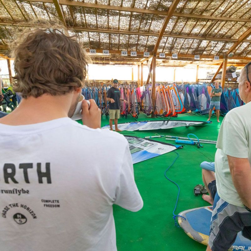 Vincent Langer nutzte die Gelegenheit, sein umfangreiches Racing-Know-how detailliert weiterzugeben. In den Einheiten am Land wurde Windsurfmaterial bis ins kleinste Detail analysiert - ein Format, das von den Teilnehmern besonders geschätzt wurde.