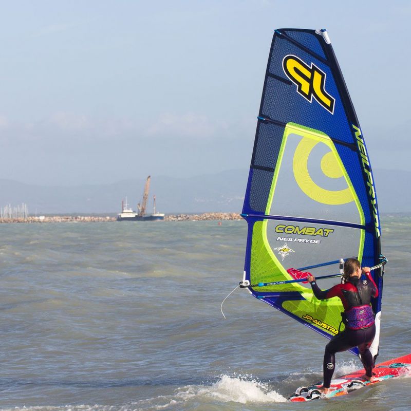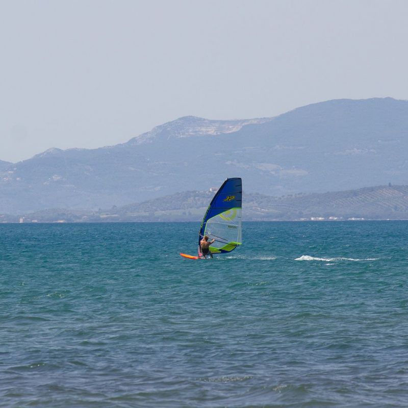 Für mich ist der Wind da bestimmt stark genug, grinst sie mich an. Mist, jetzt stecke ich der Klemme. Die Dinge nehmen ihren Lauf und Ende Mai überqueren wir die Alpen, fahren nach einem kurzen Stopp am Gardasee über die Po Ebene und dann mitten ins Herz der Toskana. Zum Glück ist die Vorhersage gar nicht so schlecht: ein Sturm soll kommen und schlauerweise habe ich mein Waveboard und kleine Segel dabei. Während wir bei strahlendem Sonnenschein und sommerlichen Temperaturen durch die kurvigen Bergstraßen rollen ist davon wenig zu spüren. Die für die Toskana typischen fast schon kitschig schönen Landschaften laden immer wieder zu Kaffeepausen oder Burgbesichtigungen ein. Wenn es zu heiß wird, kühlen wir uns in einem der Bäche ab und weiter geht's. Gegen Abend erreichen wir Livorno am Mittelmeer. Das Wasser ist spiegelglatt und glasklar. Die Ruhe vor dem Sturm. Als es schon anfängt zu dämmern zieht am Horizont endlich eine schwarze Wolkenfront auf und wir schlafen erschöpft, und zumindest ich voller Vorfreude auf den morgigen Tag, schnell ein.
